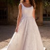 Fully lined for comfort, this gown includes inner boning and bra cups for support. The mid-low back adds a touch of allure, while convenient skirt pockets offer functionality without sacrificing style. Finished with a discreet back invisible zipper, this dress is perfect for the bride who desires elegance and practicality on her special day.