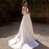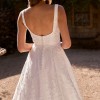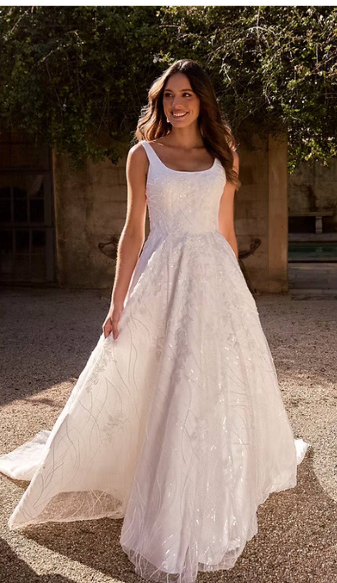The Jacqueline Wedding Dress showcases exquisite beaded embroidered tulle, featuring a scooped square neckline that beautifully frames the face. The full A-line skirt flows elegantly into a chapel train, creating a timeless silhouette.