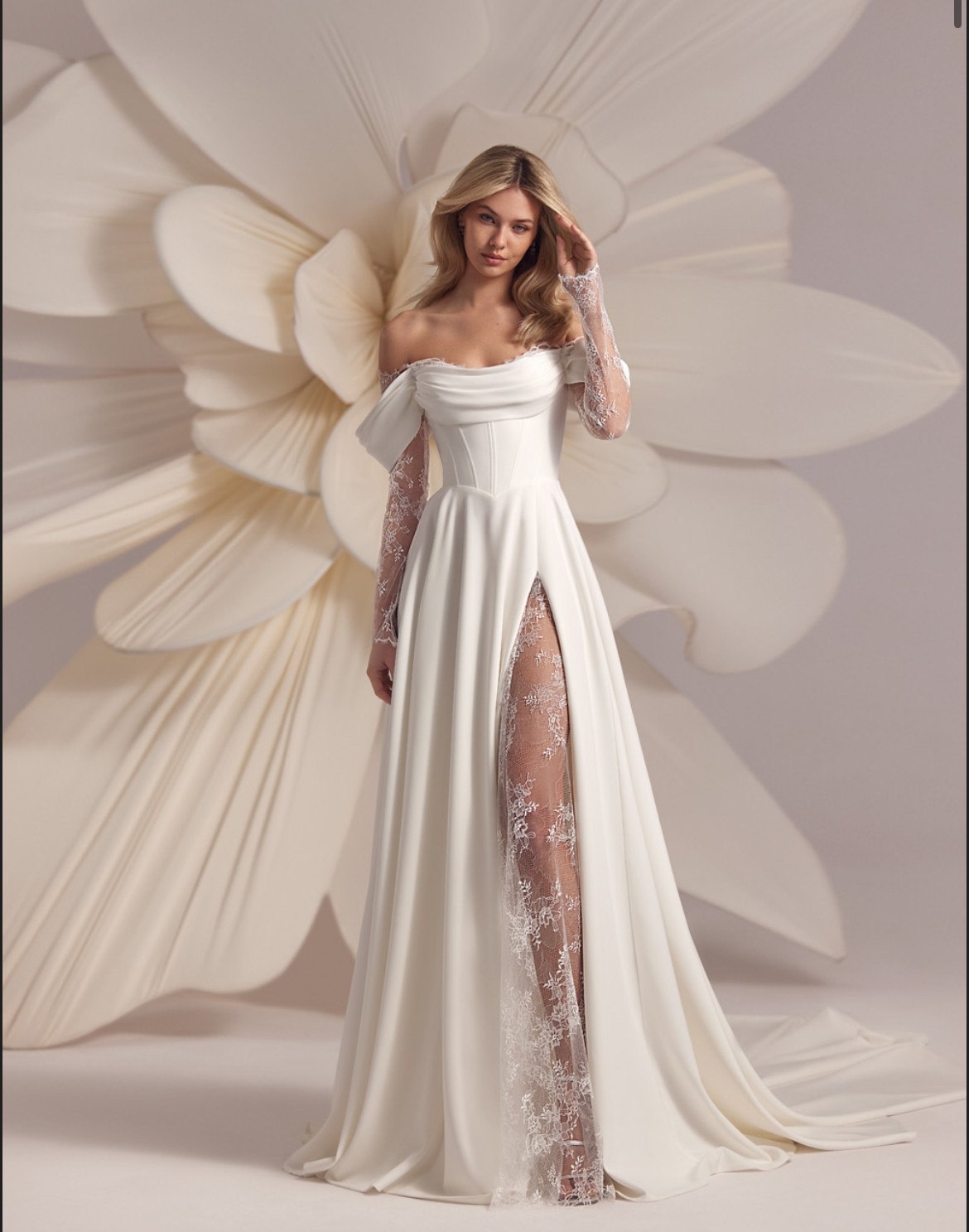 The long sleeves provide a dramatic feel, making it feel timeless yet contemporary, and the floor-length design creates a majestic look as you walk down the aisle. The corset back not only ensures a perfect fit but also adds a charming detail that will leave your guests in awe.