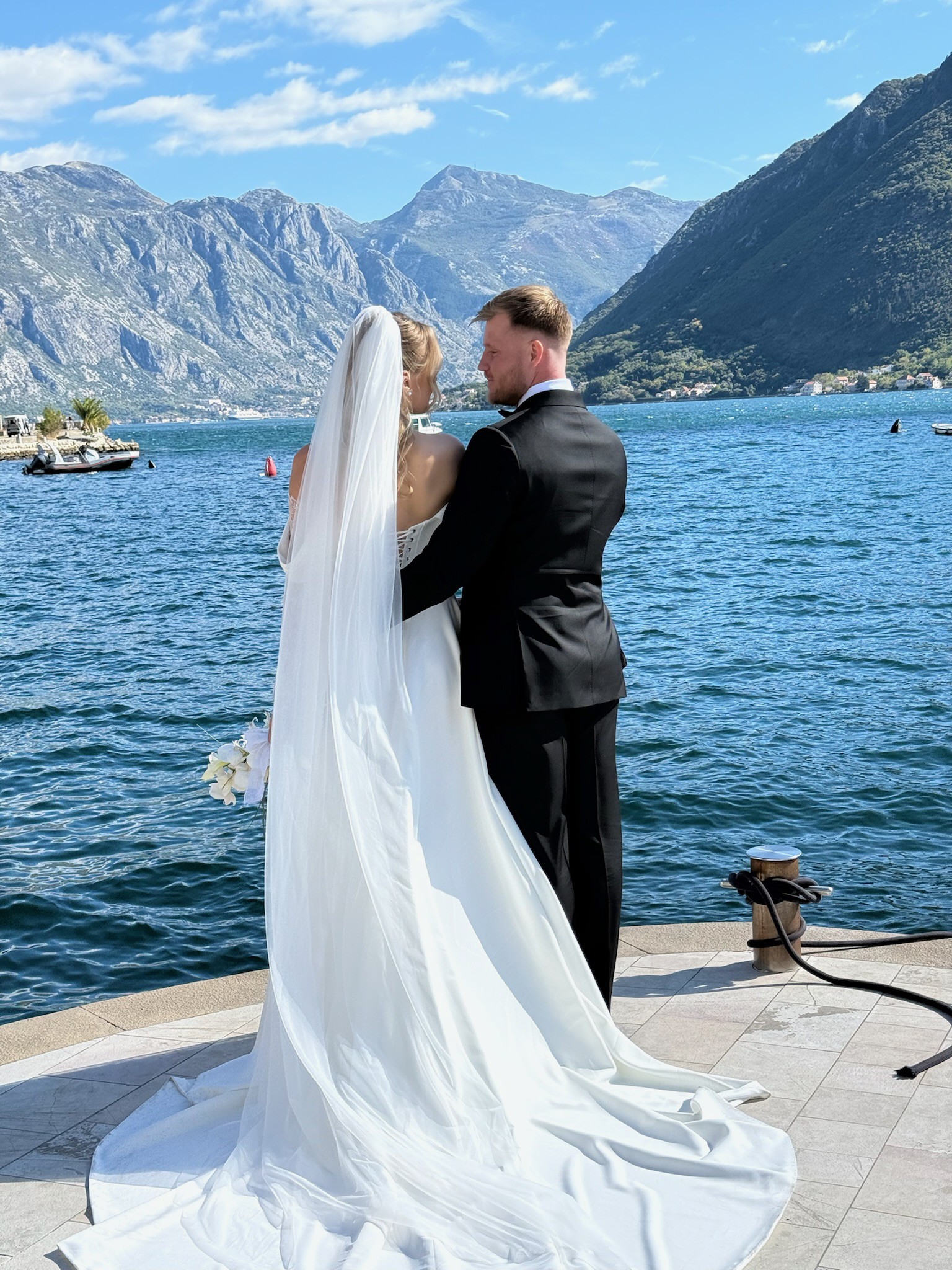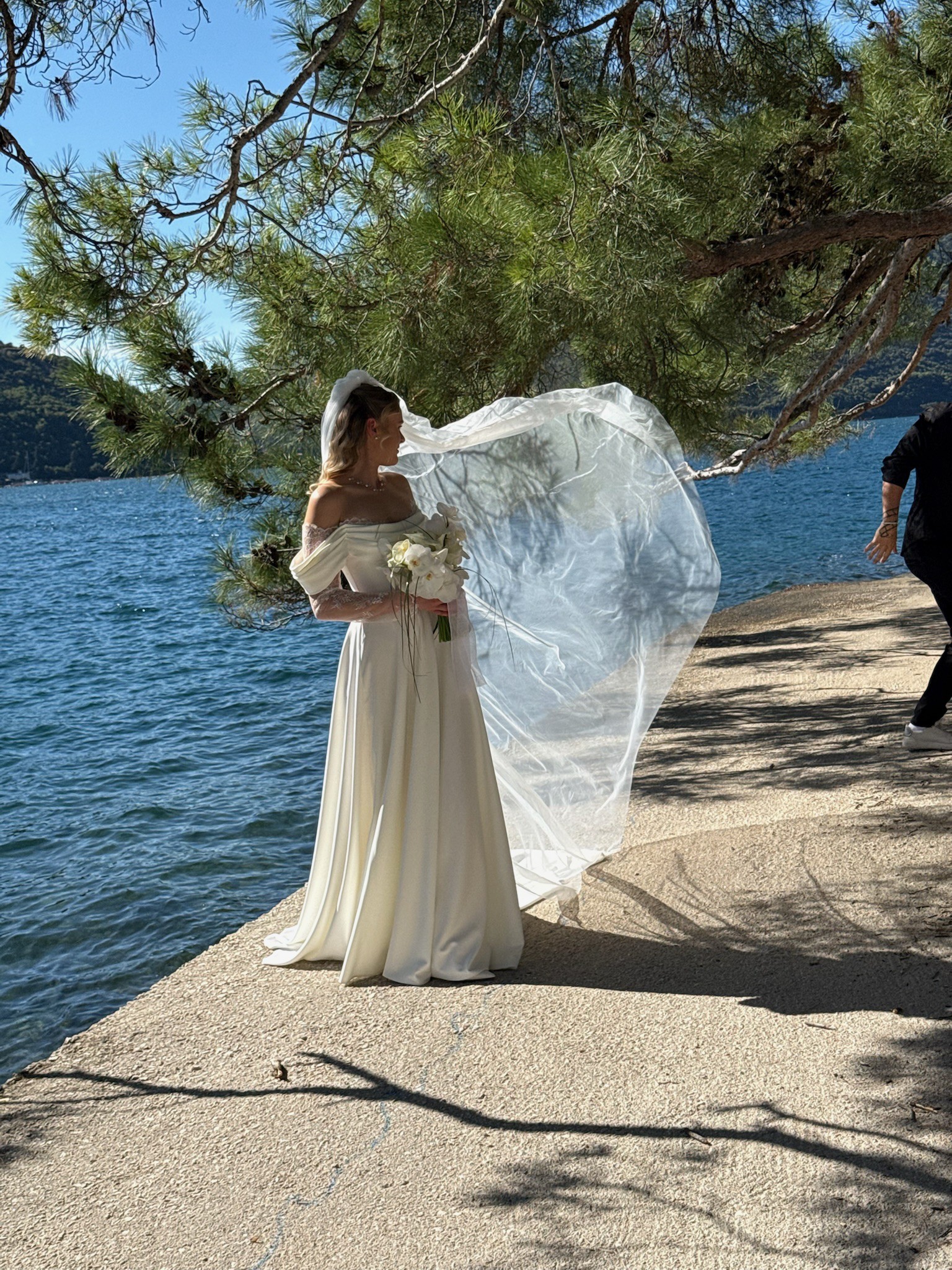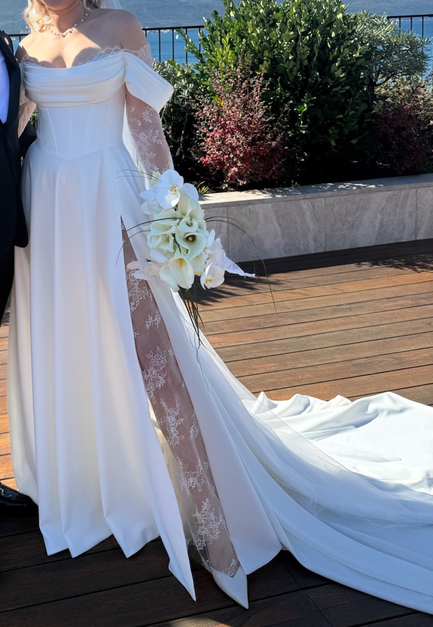 This stunning Baccara wedding dress by Eva Lendel was the perfect gown for my special day, and I’m thrilled to pass it on to another bride who is searching for her dream dress. The A-line silhouette beautifully flatters the figure, while the curve neckline adds an elegant touch that enhances the overall romantic aesthetic.