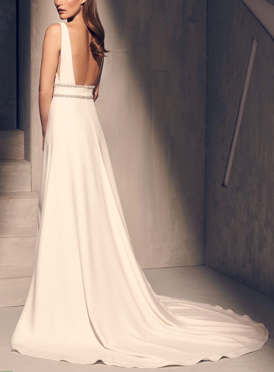 This dress is elegant and modern, made from luxurious crepe with a flattering silhouette, plunging neckline, and delicate beaded bands that define the waist and add a subtle sparkle. It’s incredibly comfortable and easy to move in — perfect for a full day of celebrating.