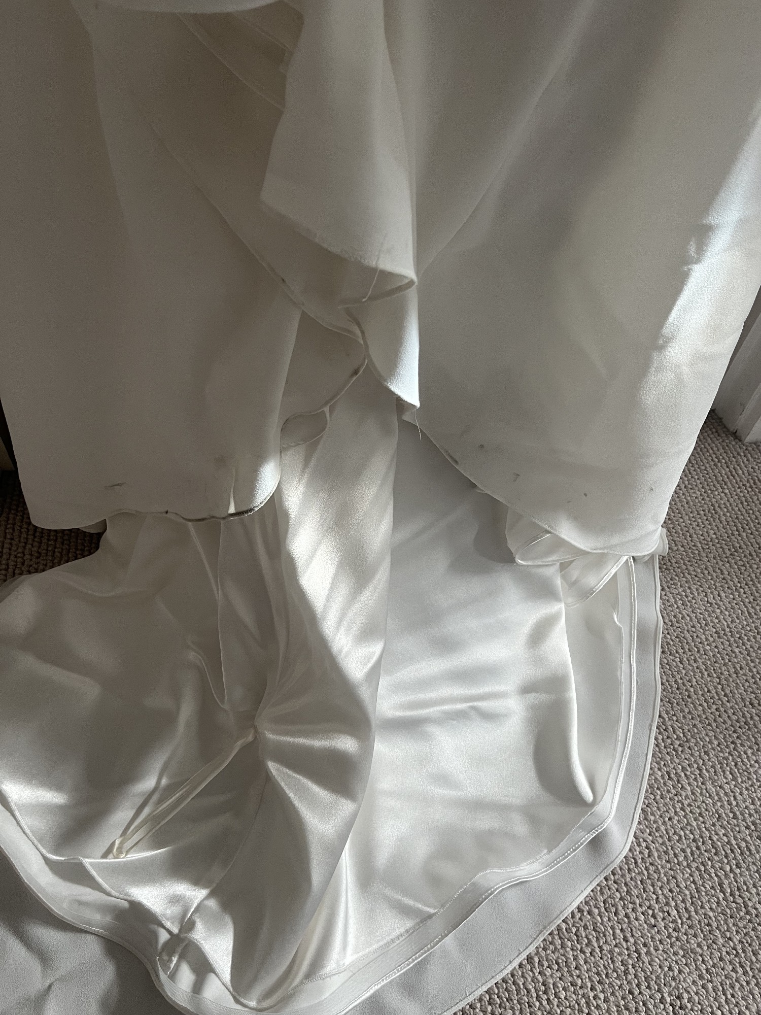 Worn once for my wedding and professionally dry-cleaned — there are some faint marks along the hem from the floor that didn’t come out completely(as seen in photos), but think they'll come out with a gentle re-clean or hemming. Otherwise in great condition.