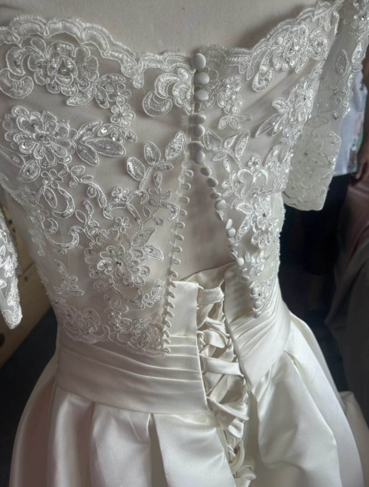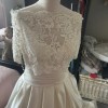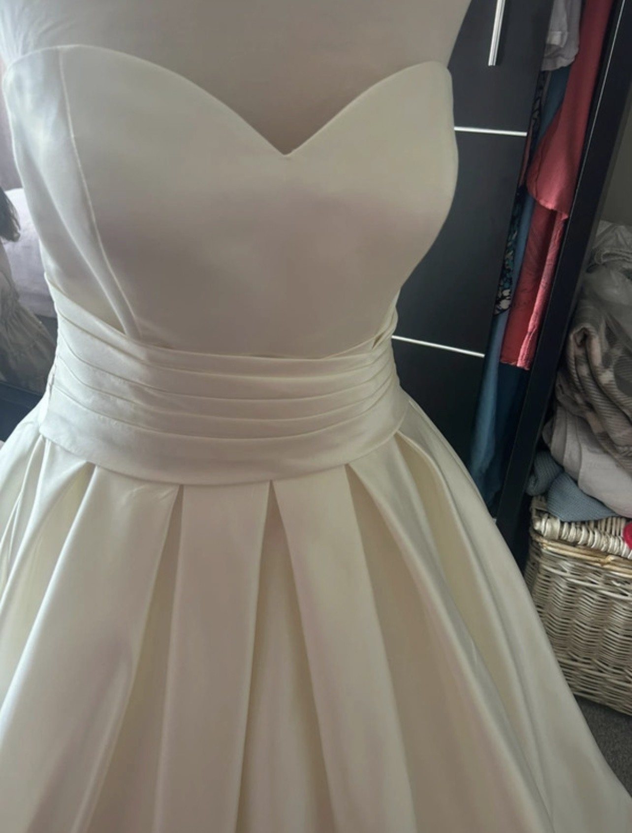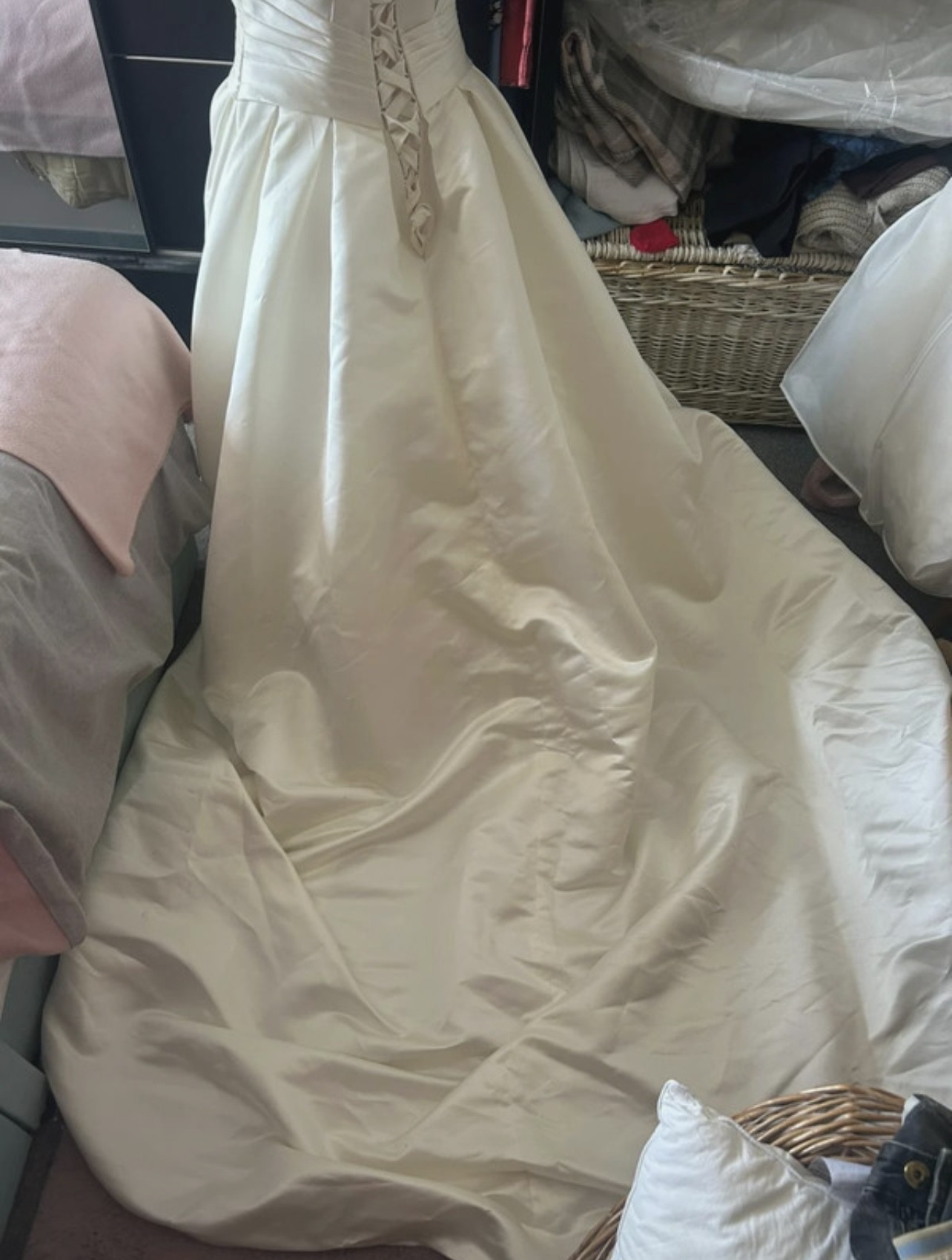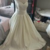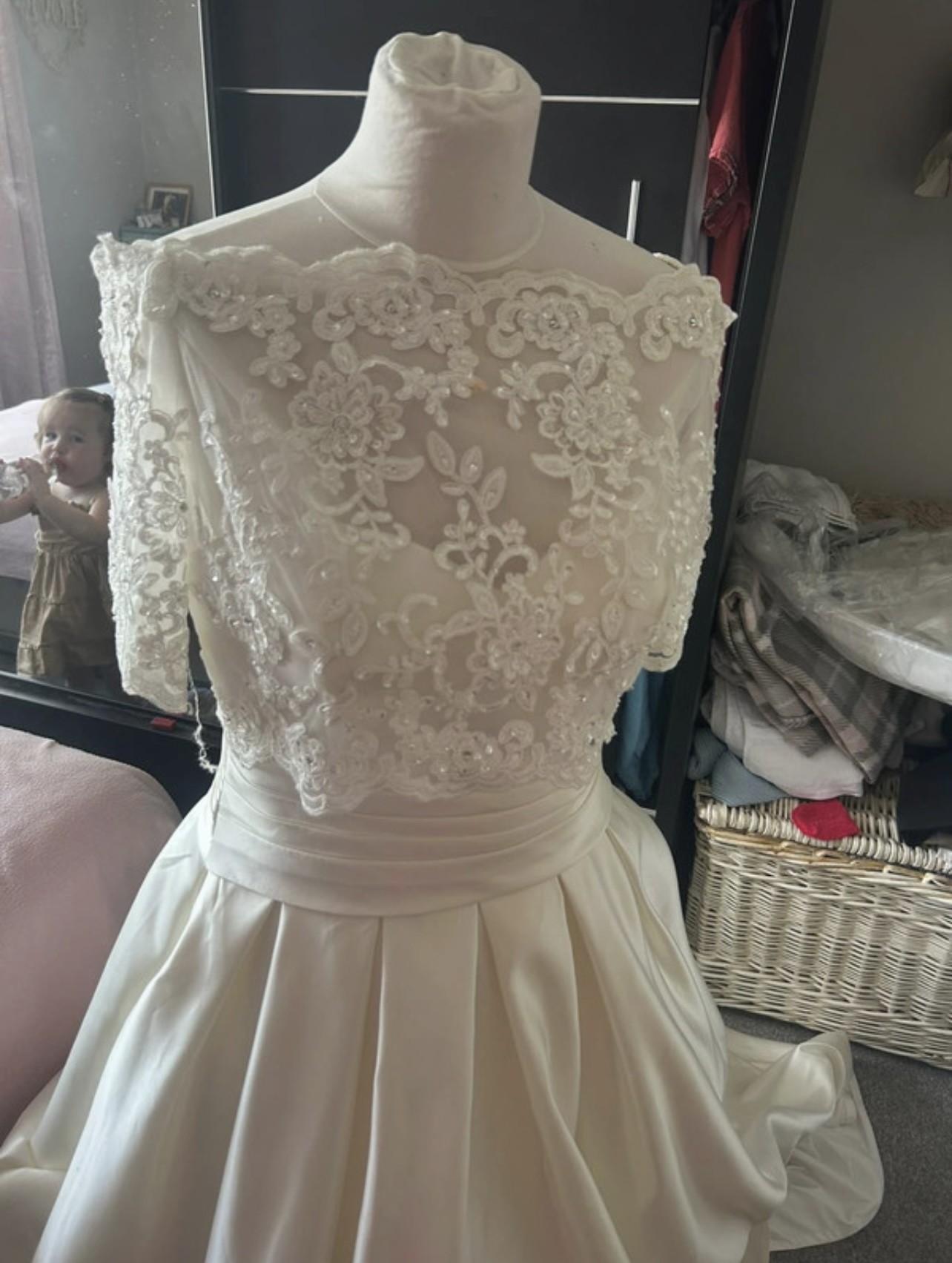 Champagne/ivory coloured wedding dress with lace sparkly over top. Mark to the overtop but may come out when dry cleaned. Dress is very beautiful with cross over detail at bust with a sweetheart neckline. Ballgown style and mid length train. Dress has a corset back and the over top has satin buttons. The overtop has elbow length sleeves and off the shoulder design with elasticated bands for security. This dress was bought in 2017 as a sample dress, and will need a dry cleaned but has not been altered or worn as change of wedding dress.