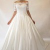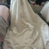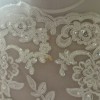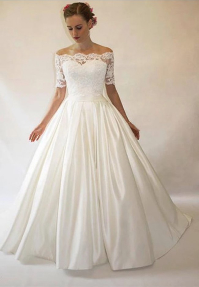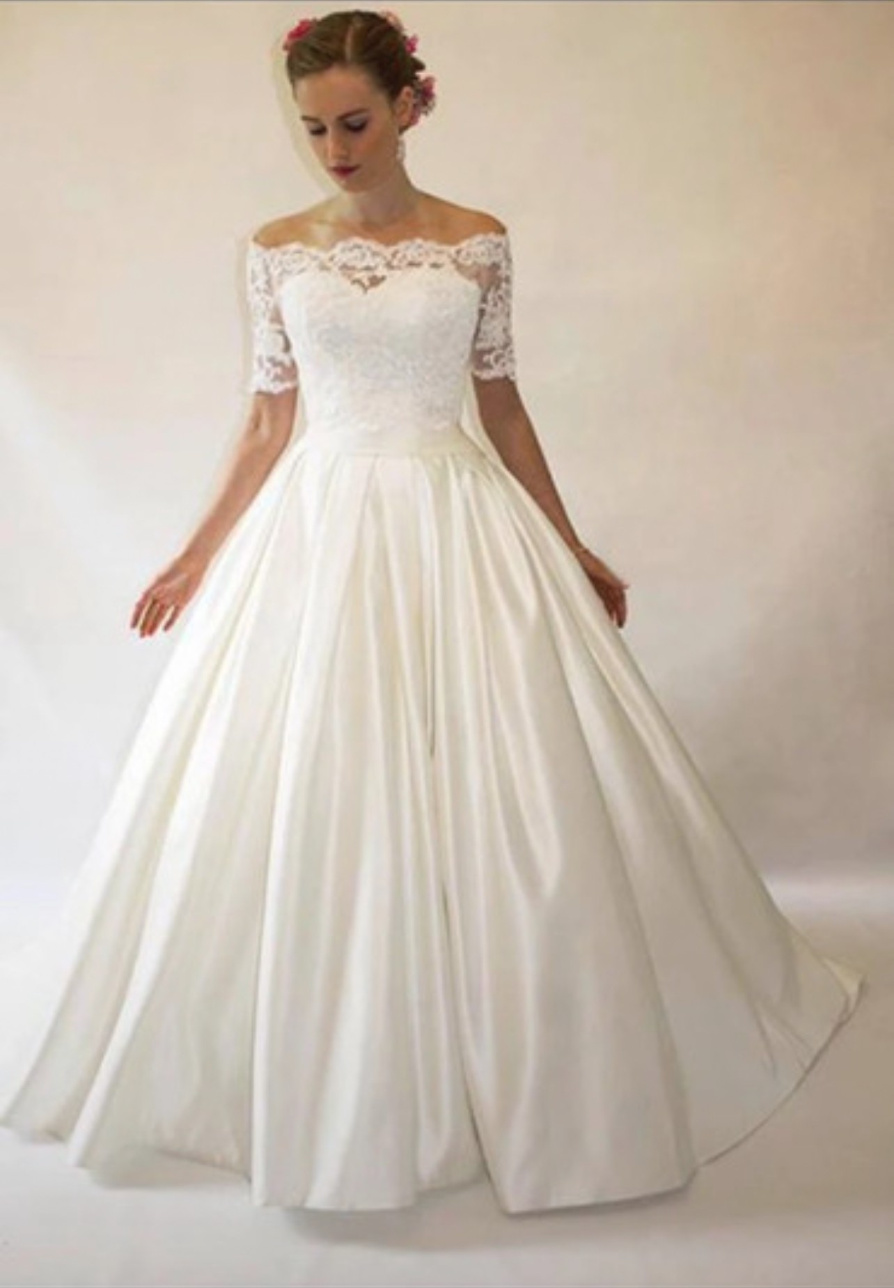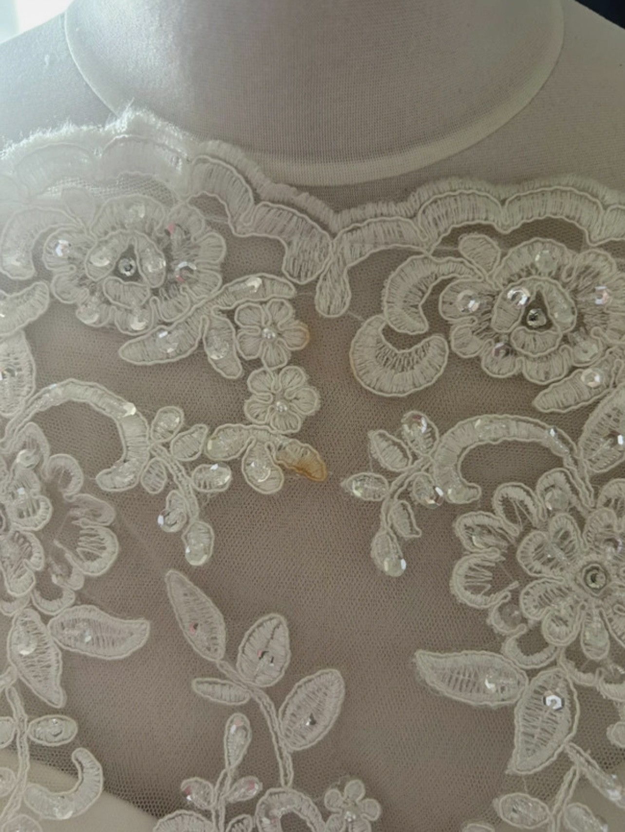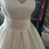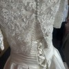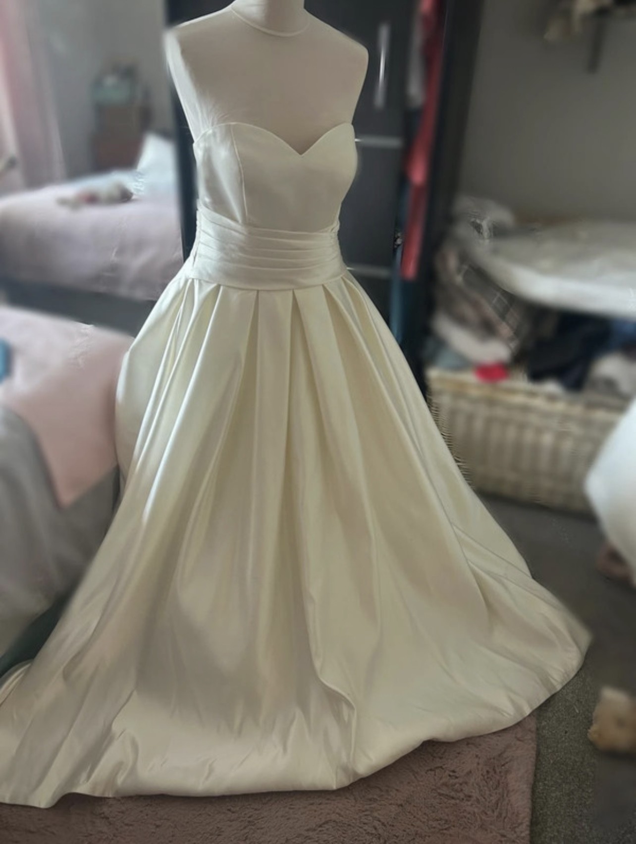 Champagne/ivory coloured wedding dress with lace sparkly over top. Mark to the overtop but may come out when dry cleaned. Dress is very beautiful with cross over detail at bust with a sweetheart neckline. Ballgown style and mid length train. Dress has a corset back and the over top has satin buttons. The overtop has elbow length sleeves and off the shoulder design with elasticated bands for security. This dress was bought in 2017 as a sample dress, and will need a dry cleaned but has not been altered or worn as change of wedding dress.