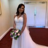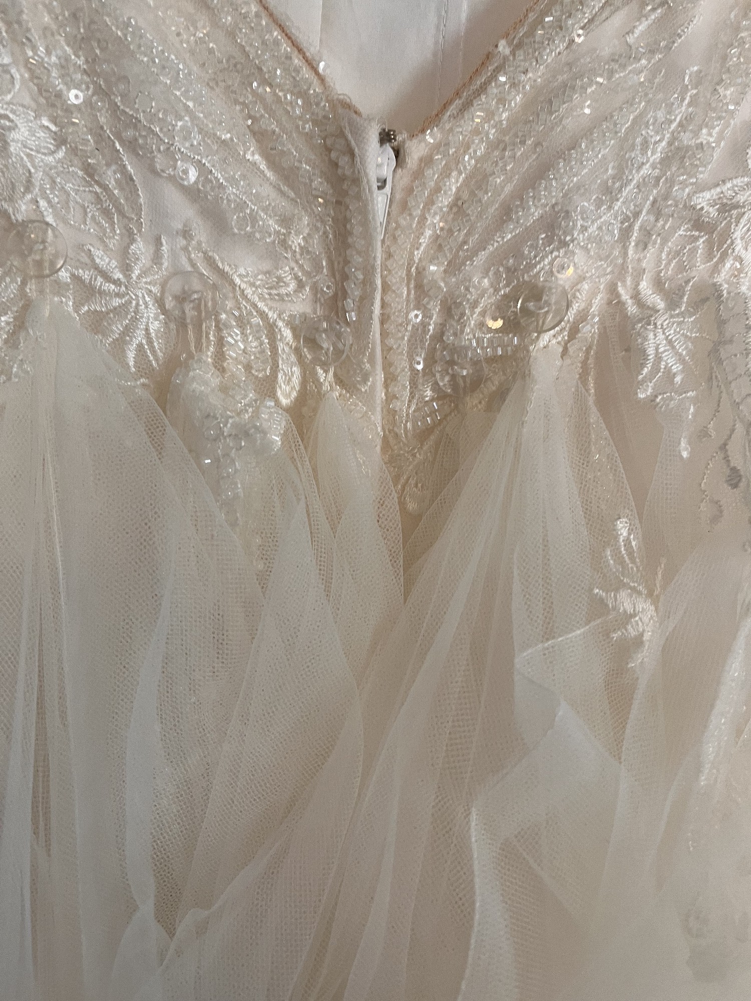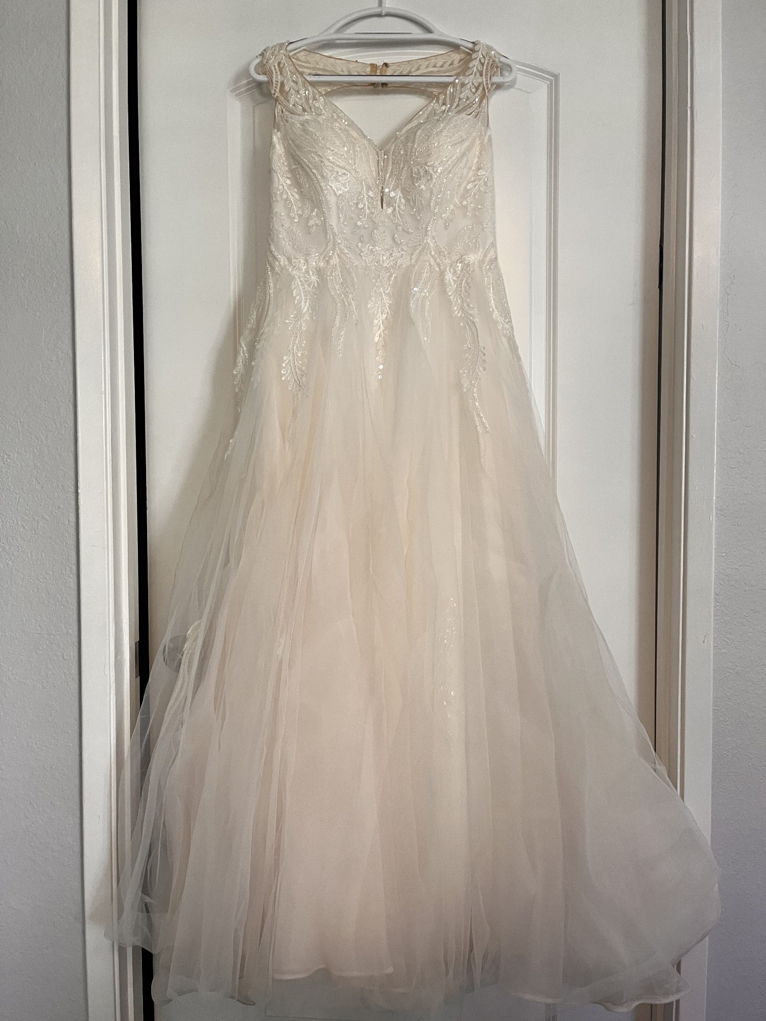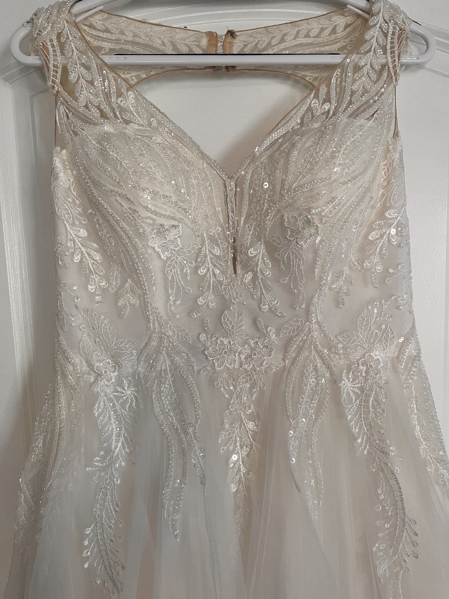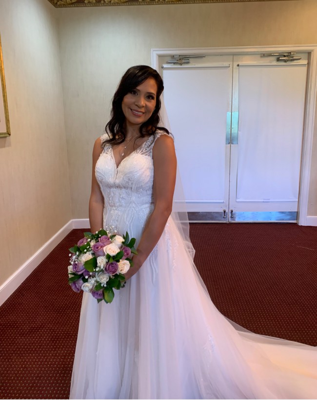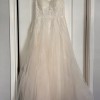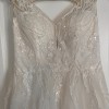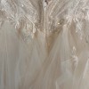 This exquisite ivory wedding gown features a romantic illusion neckline with delicate embroidered lace and shimmering sequins that gracefully cascade over the bodice. The intricate beadwork and floral appliqués add a touch of timeless elegance, while the soft tulle overlay creates a dreamy, ethereal look. Designed in a flattering A-line silhouette, the dress offers both comfort and sophistication. The illusion back with button detailing adds a modern yet classic finish — perfect for a bride seeking a gown that combines sparkle, grace, and effortless beauty.