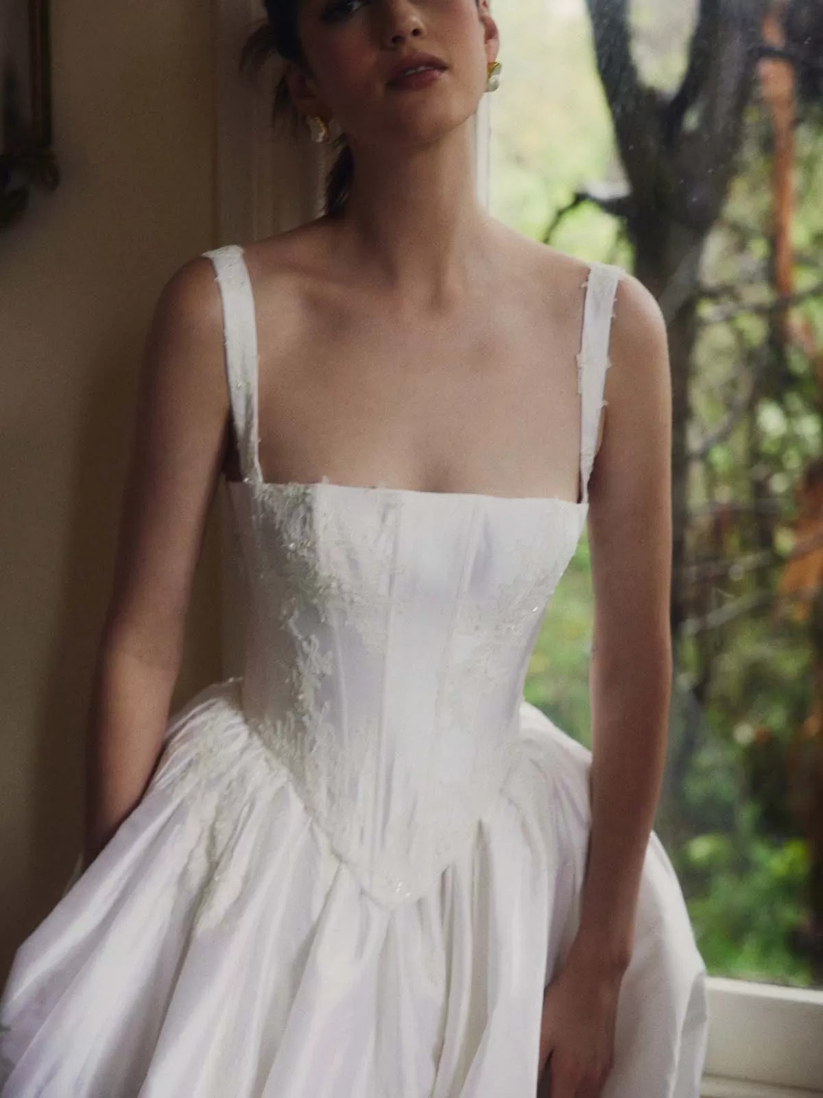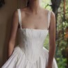 Bodice: Corseted with straight neckline, removable straps