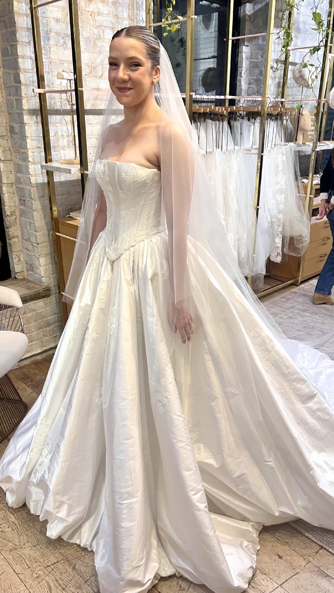 The silk dupioni skirt has a bubble hem and a soft train, creating a ball gown silhouette that still feels incredibly lightweight and easy to wear. Despite its volume, it moves beautifully and remains comfortable throughout the day.