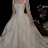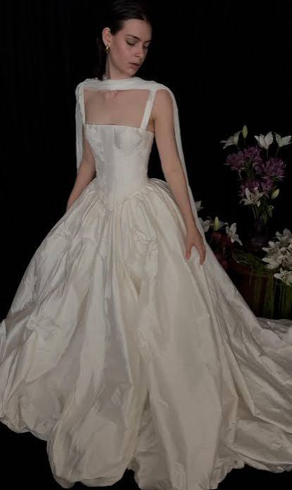 This gown combines the vintage look of silk dupioni with hand-beaded Chantilly French lace appliqué, paired with a modern twist — a corseted bodice with a straight neckline and bubble hem details on the skirt.