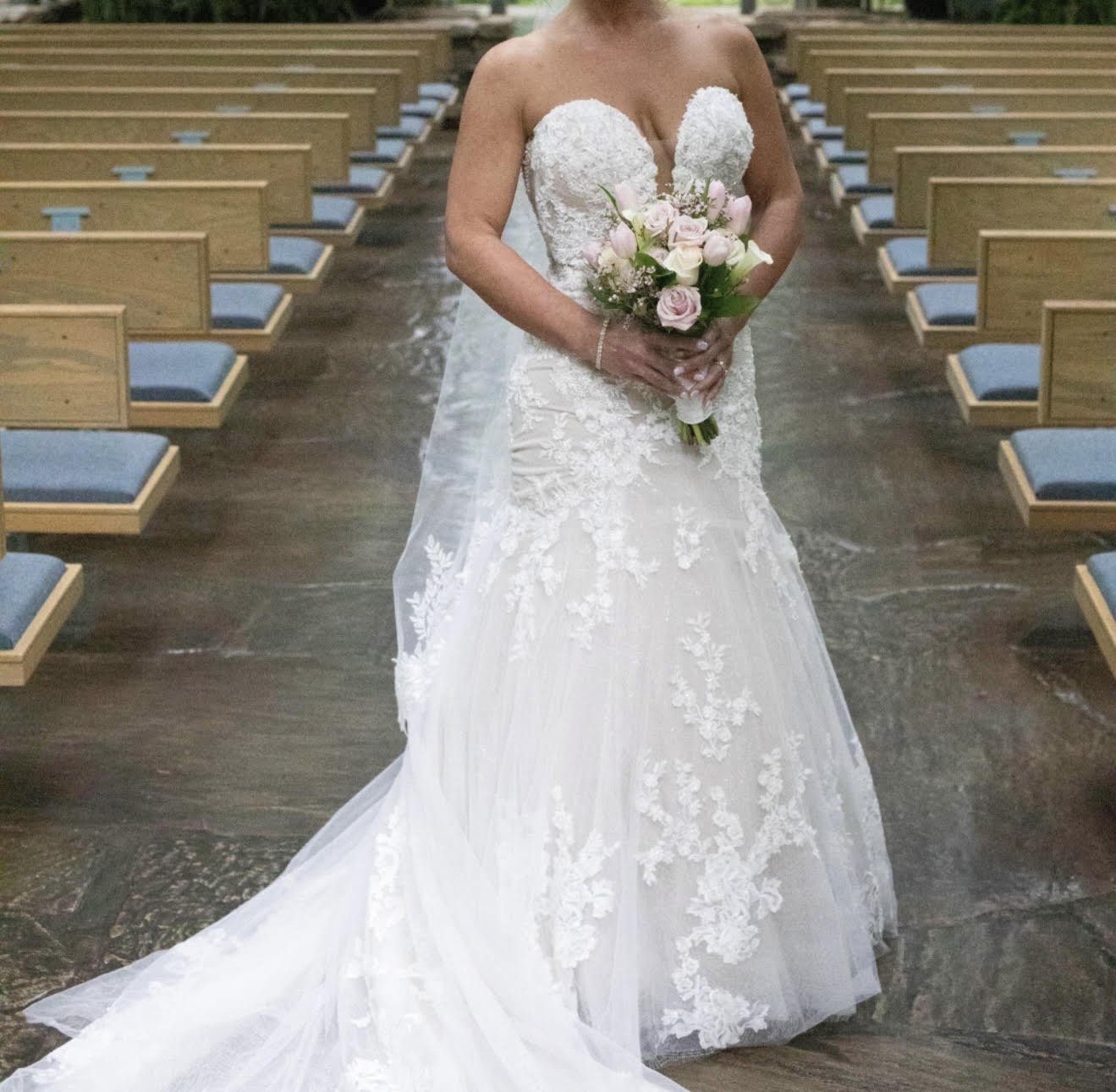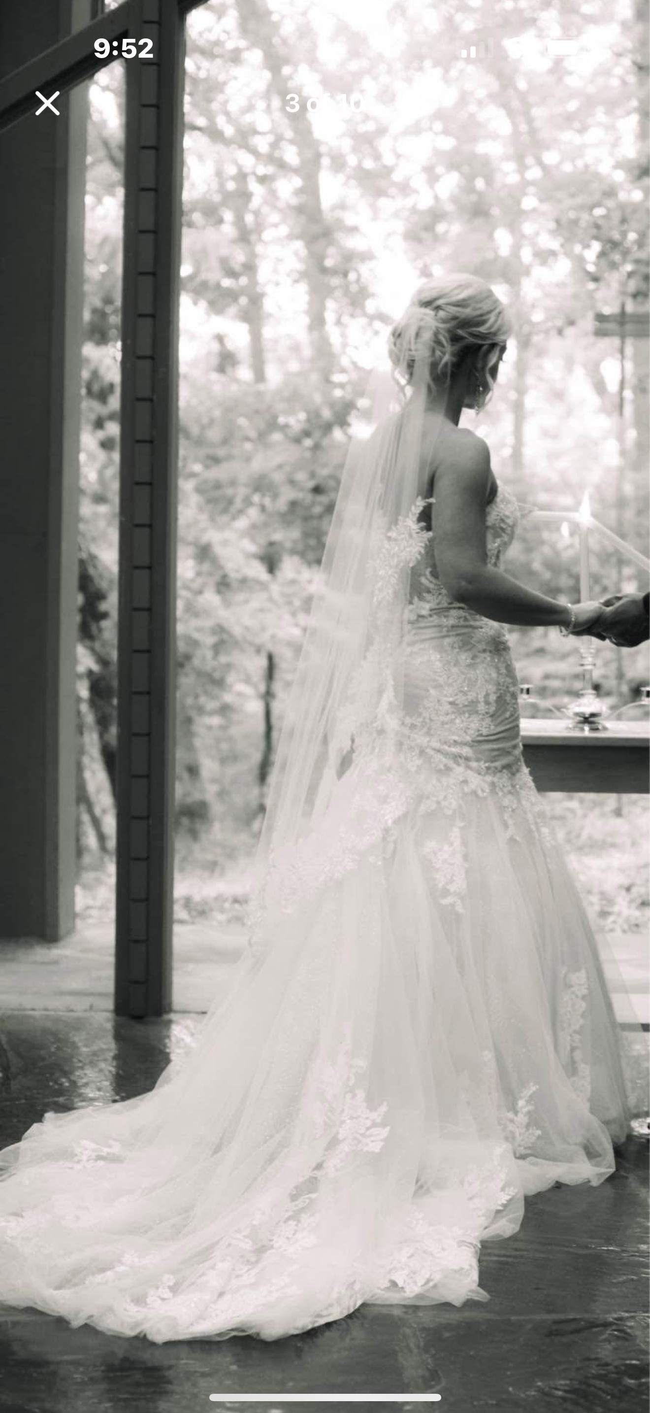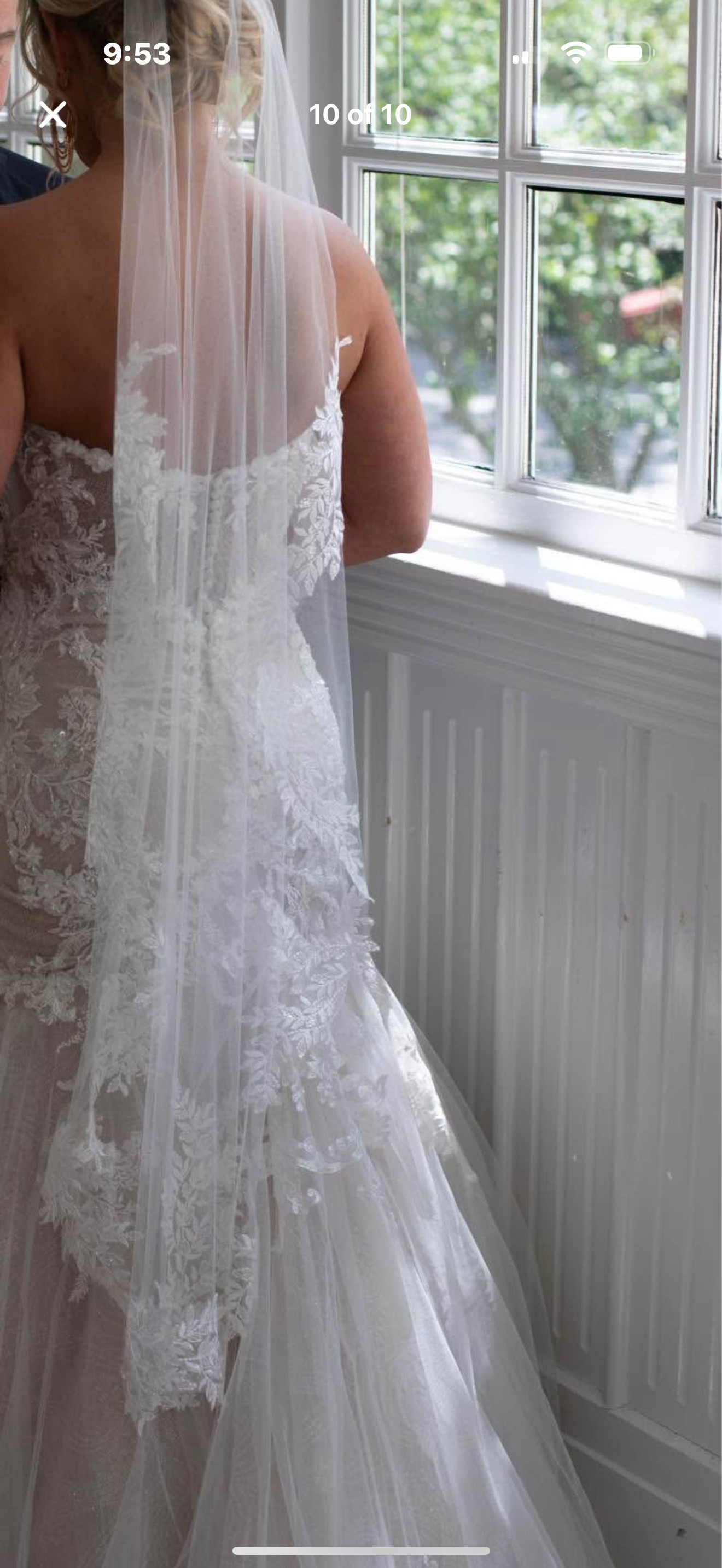 Included with the dress is the veil, which beautifully complements the overall aesthetic and adds a final flourish. This dress has been lovingly cared for and is ready for its next chapter, ready to make another bride's special day unforgettable. It holds so many memories, and I hope it brings as much joy to you as it did to me.