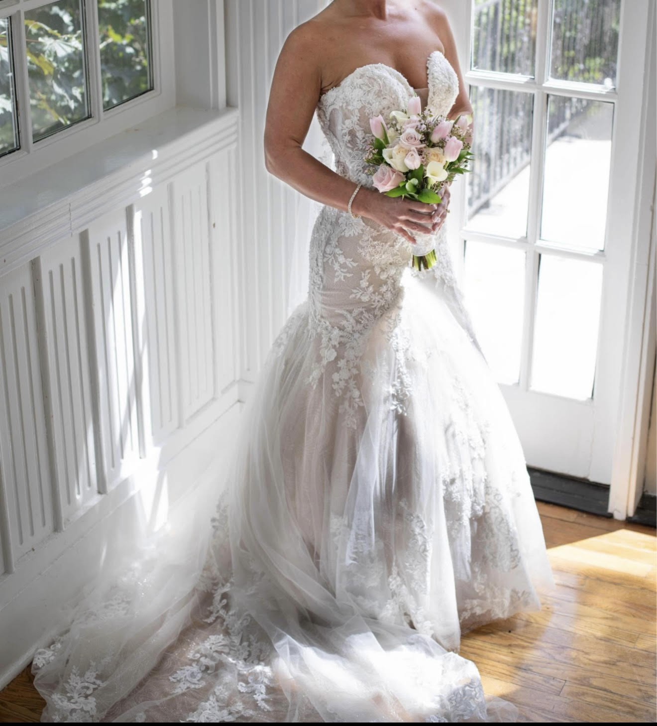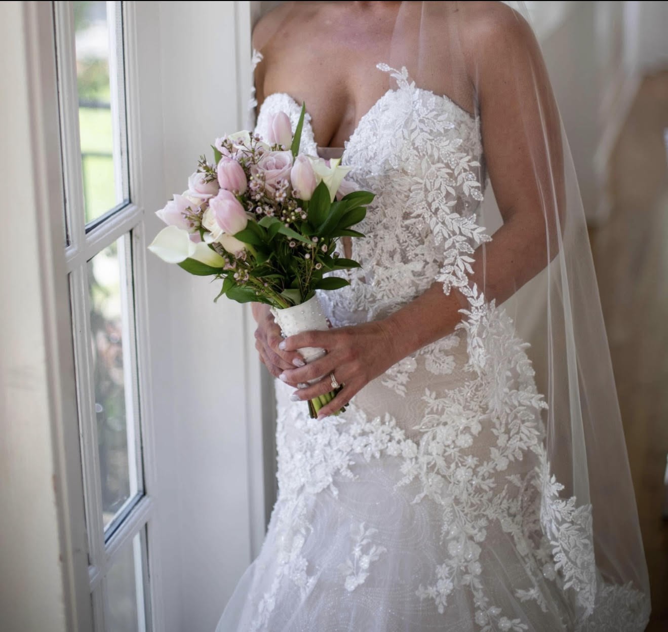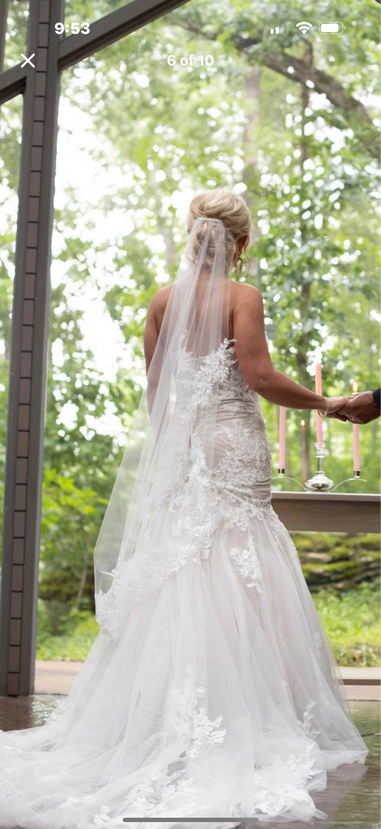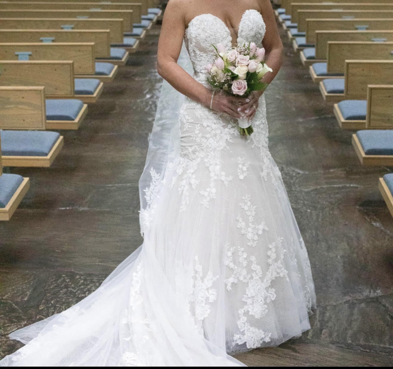 Included with the dress is the veil, which beautifully complements the overall aesthetic and adds a final flourish. This dress has been lovingly cared for and is ready for its next chapter, ready to make another bride's special day unforgettable. It holds so many memories, and I hope it brings as much joy to you as it did to me.