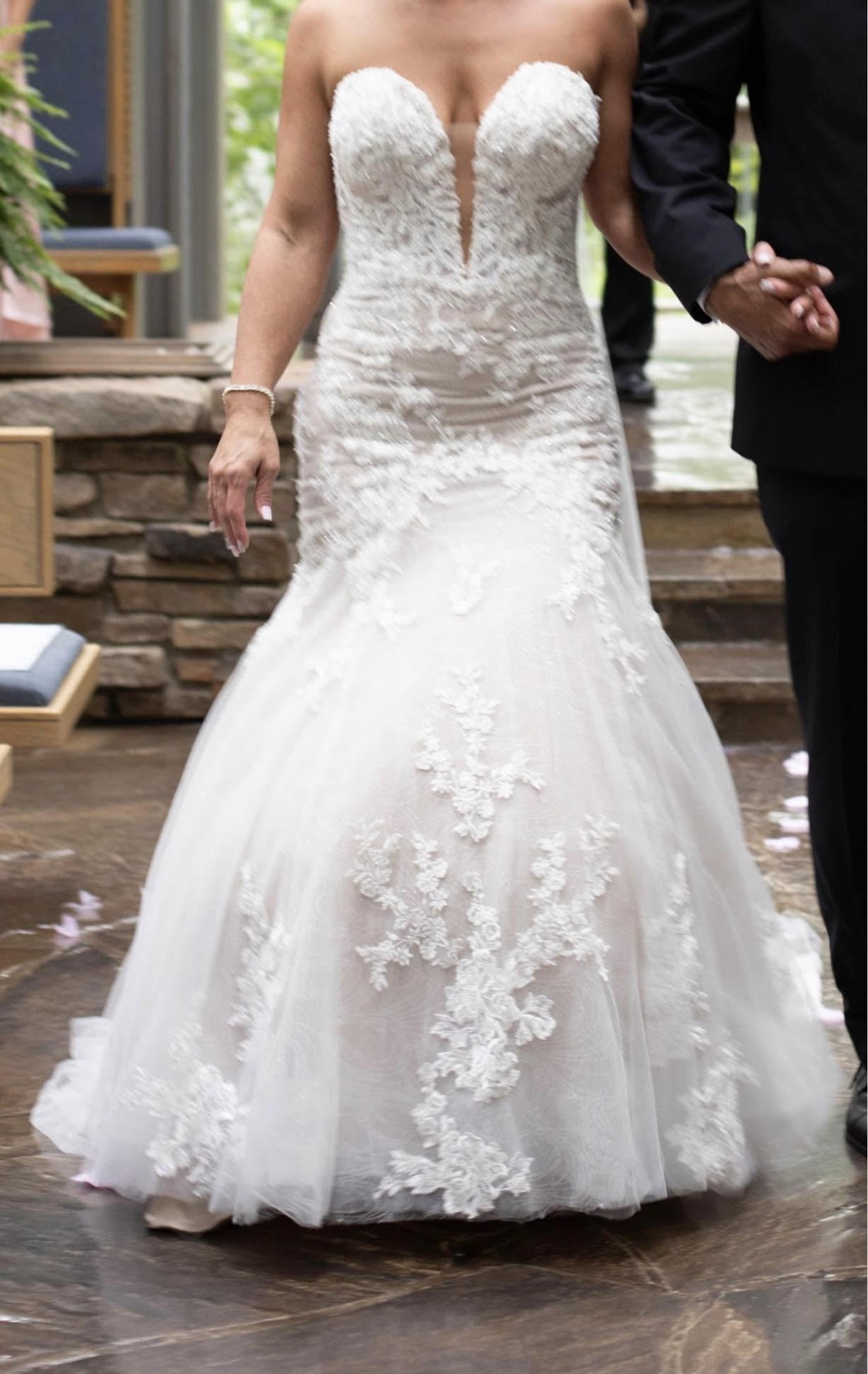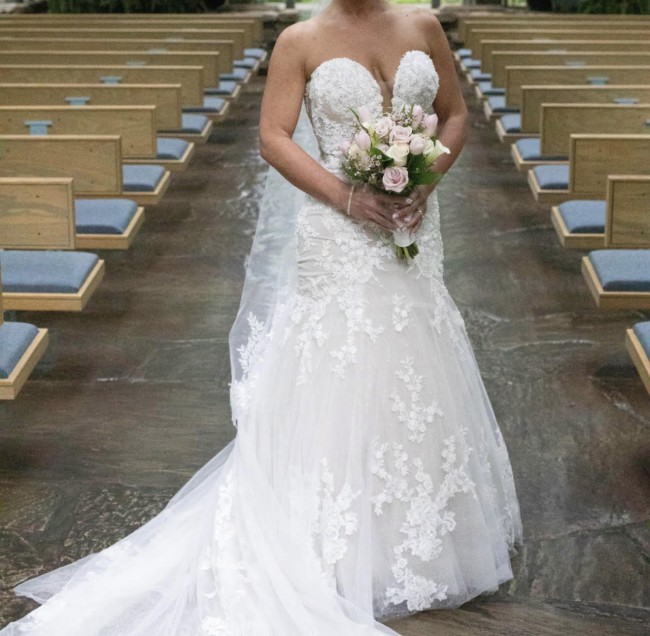 This exquisite dress from Essense of Australia was a dream come true for my wedding day. With its beautifully crafted mermaid silhouette, it hugged my curves in all the right places and made me feel radiant. The sweetheart neckline adds a romantic touch, while the low back lends an unexpected twist that left my guests in awe.