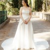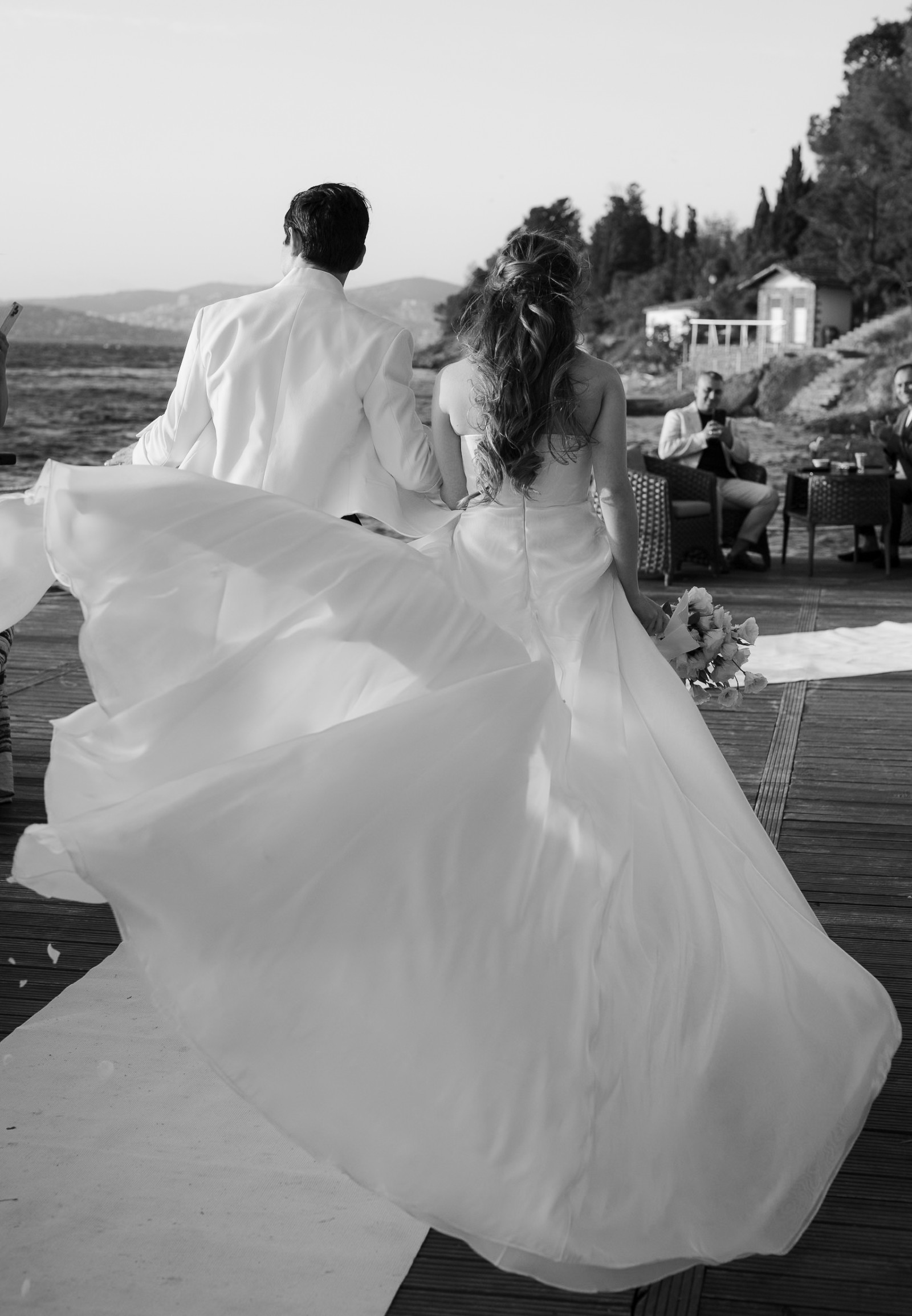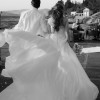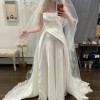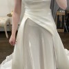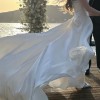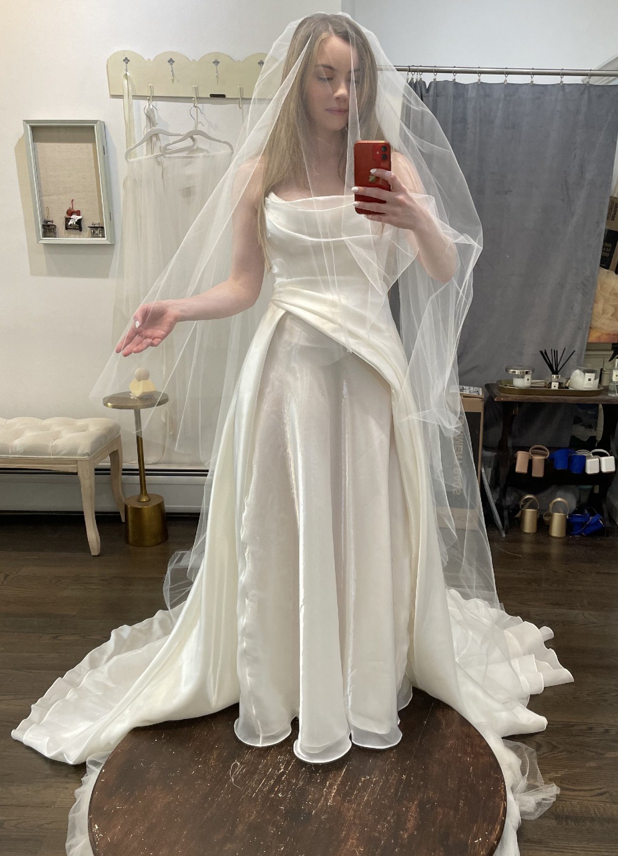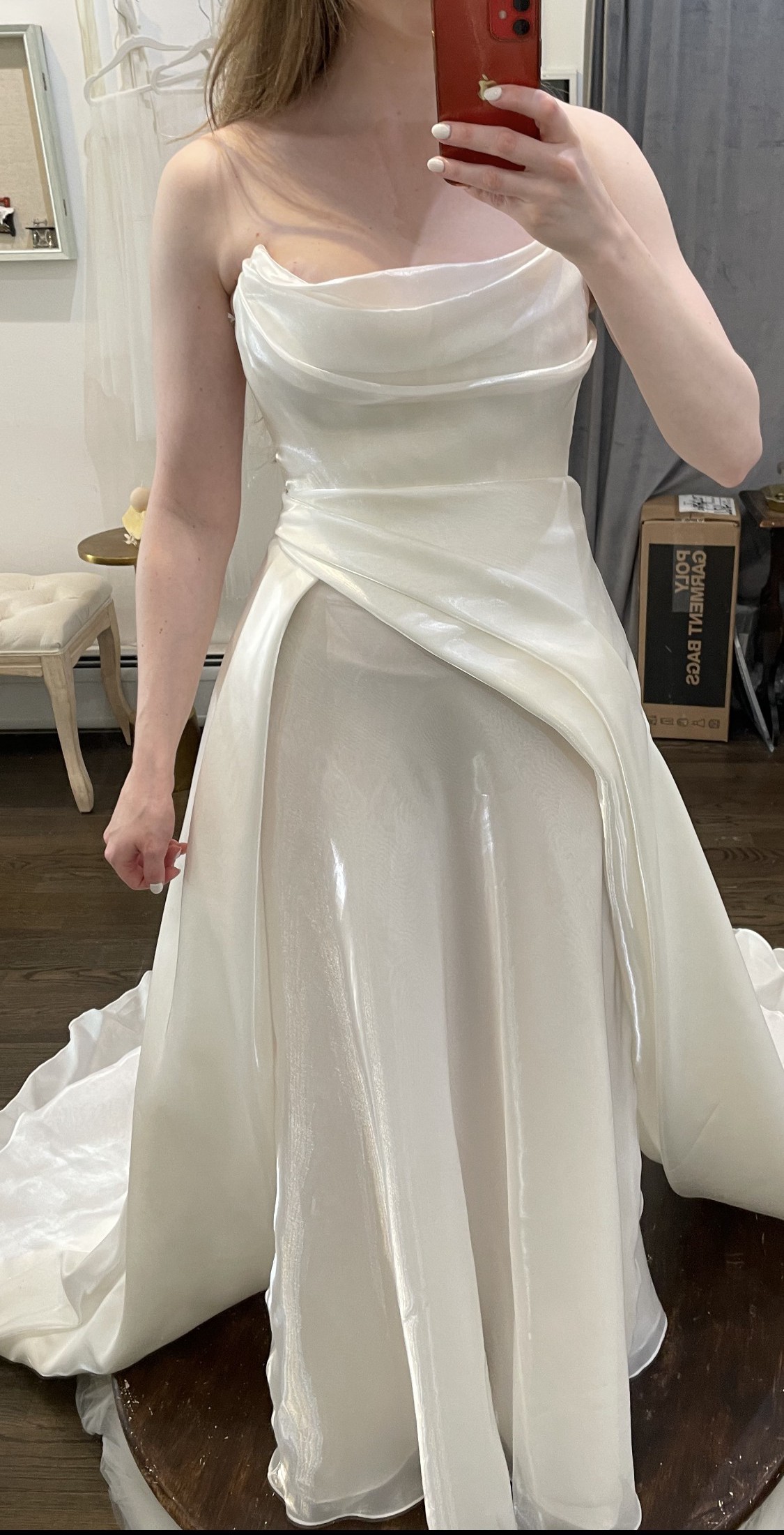 I ordered this dress made to order (my size details below), and it is cathedral length with a cathedral length blusher veil paired with it (veil included, details below). The gown is in white and has a multi-layered liquid organza fabric. It's super light and flowy, with a structured corset boning through the bodice. I was very particular with the alterations (1k spend) to secure the soft way the draping fabric was meant to lay at the cat-eye neckline, bodice and the skirt detail, so it looks perfect. I added a french bustle with a (2) hook details as that looked best with the way the fabric folds.