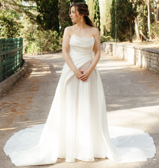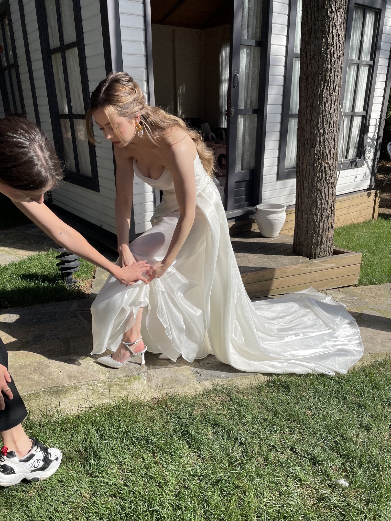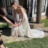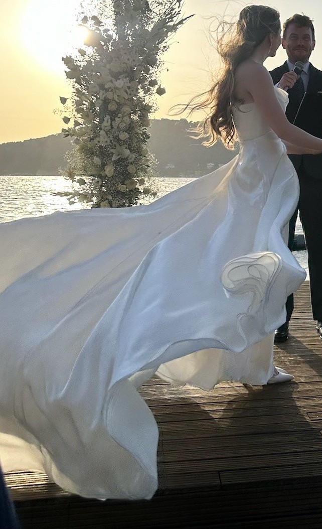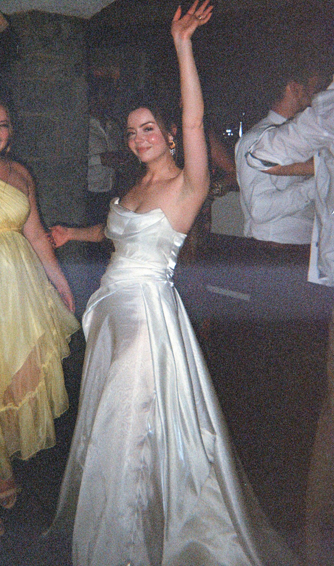 This is the most special and beautiful dress I've ever worn, and I feel honored to pass it along to another beautiful bride! I'm an architect, and when I was searching for my dress I was really drawn to the Luna dress by Katherine Tash for how sculptural and detailed it was. The liquid organza material is so special, luminous and soft. I think this dress will look so flattering on everyone! I loved the look of the corset boddice but wanted it to flow away at my stomach area, which made me feel so comfortable and secure all night.