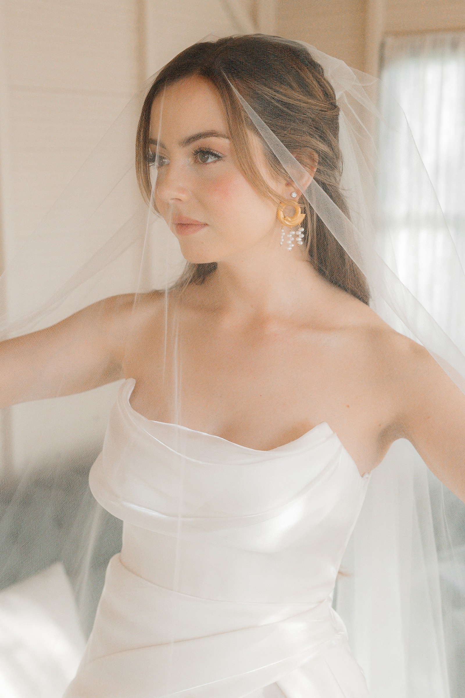 The veil is cathedral length with a blusher and a comb clip. The veil was a perfect fit because I wanted something light and almost transparent but a little bit stiffer so it would lift away from my face and flow away from the dress without collapsing.