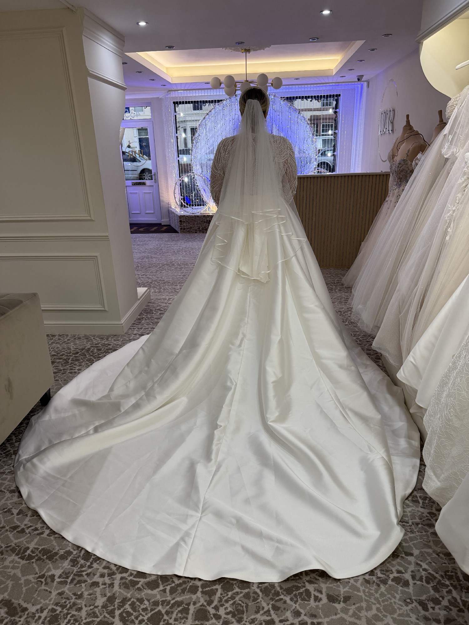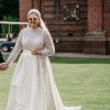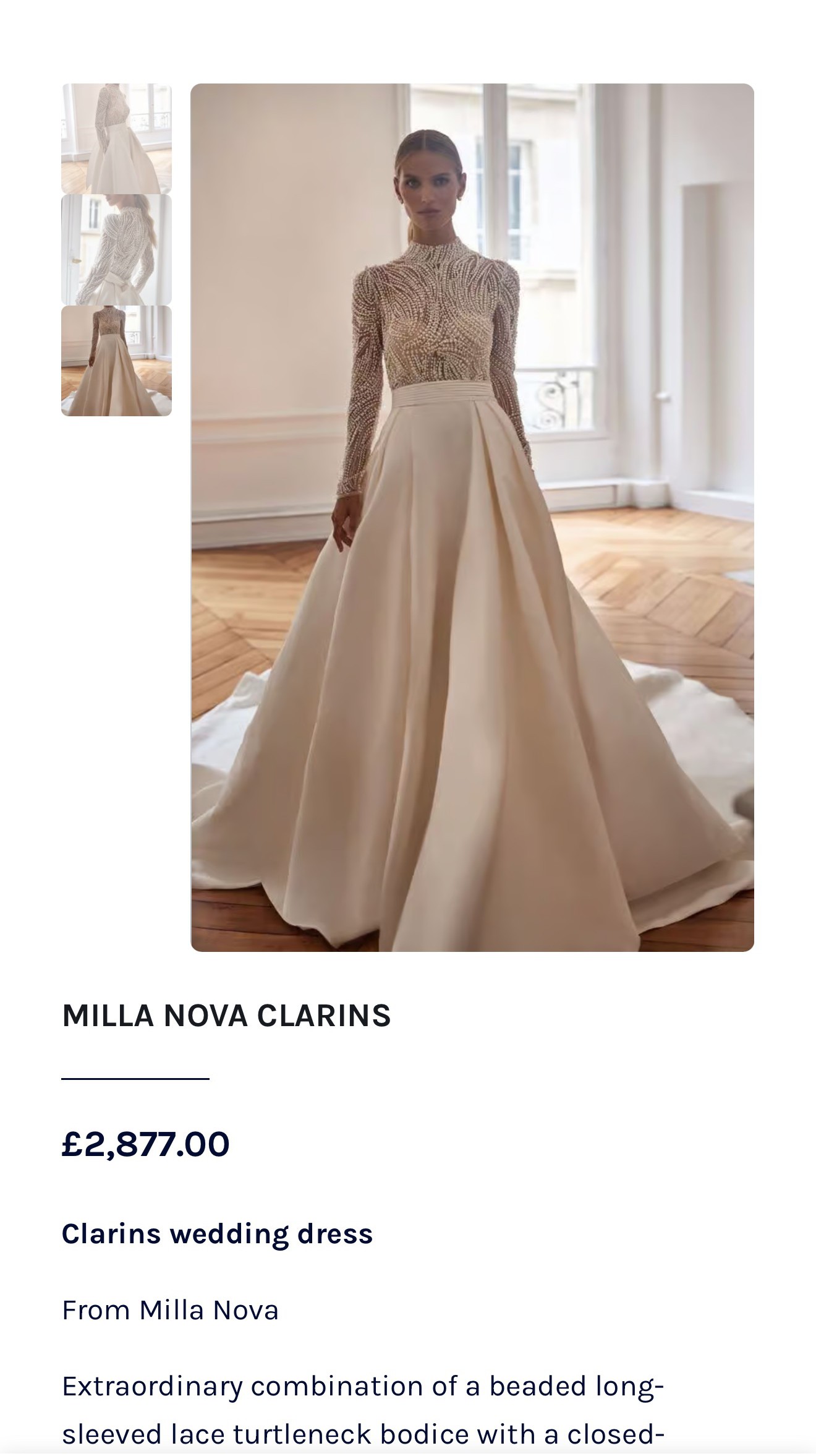 This Clarins wedding dress by Milla Nova is nothing short of a dream. When I first tried it on, I felt like royalty, completely enveloped in its stunning A-line silhouette and the elegance of the high neck design. The long sleeves add a touch of sophistication, making it ideal for any season and perfect for your wedding.