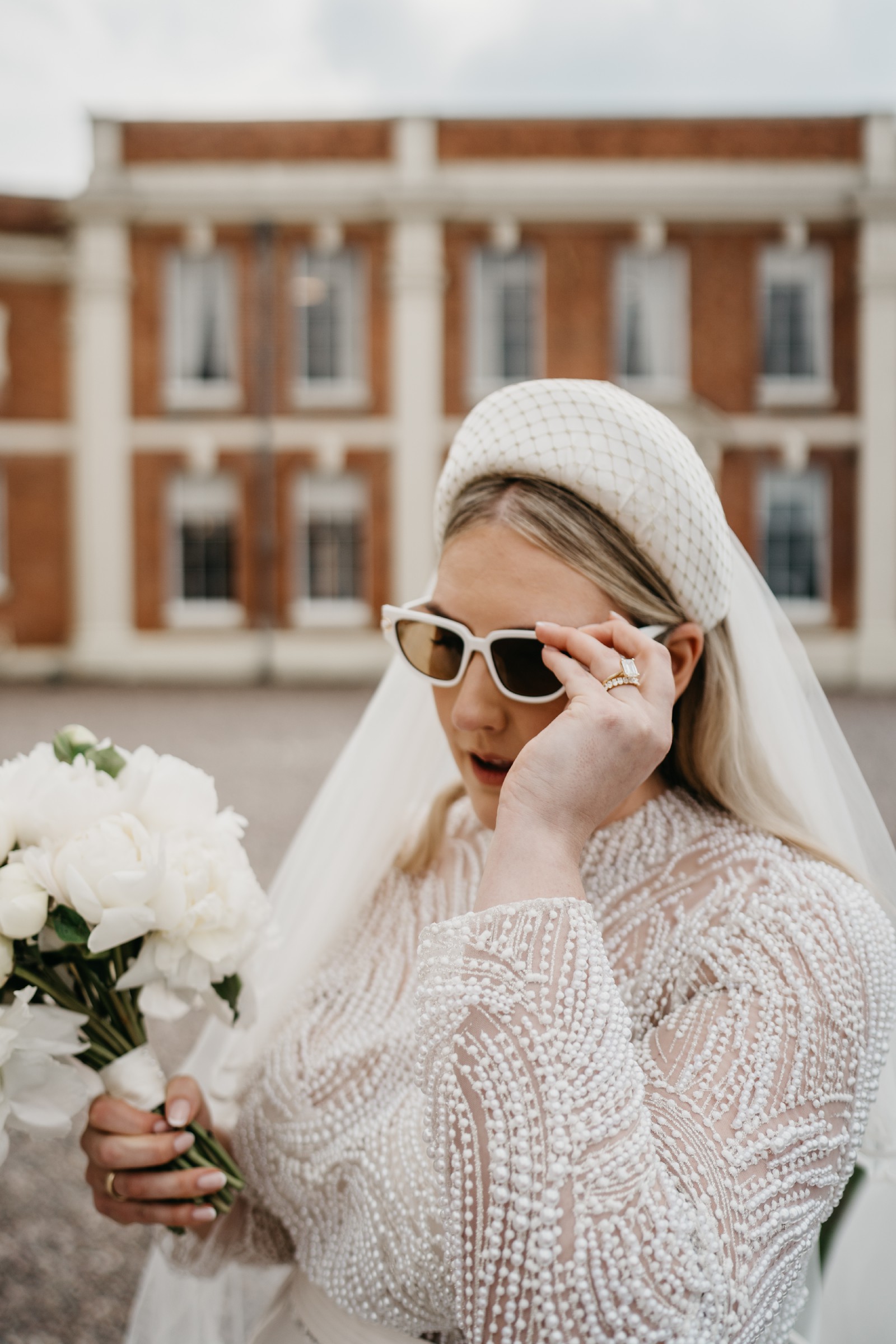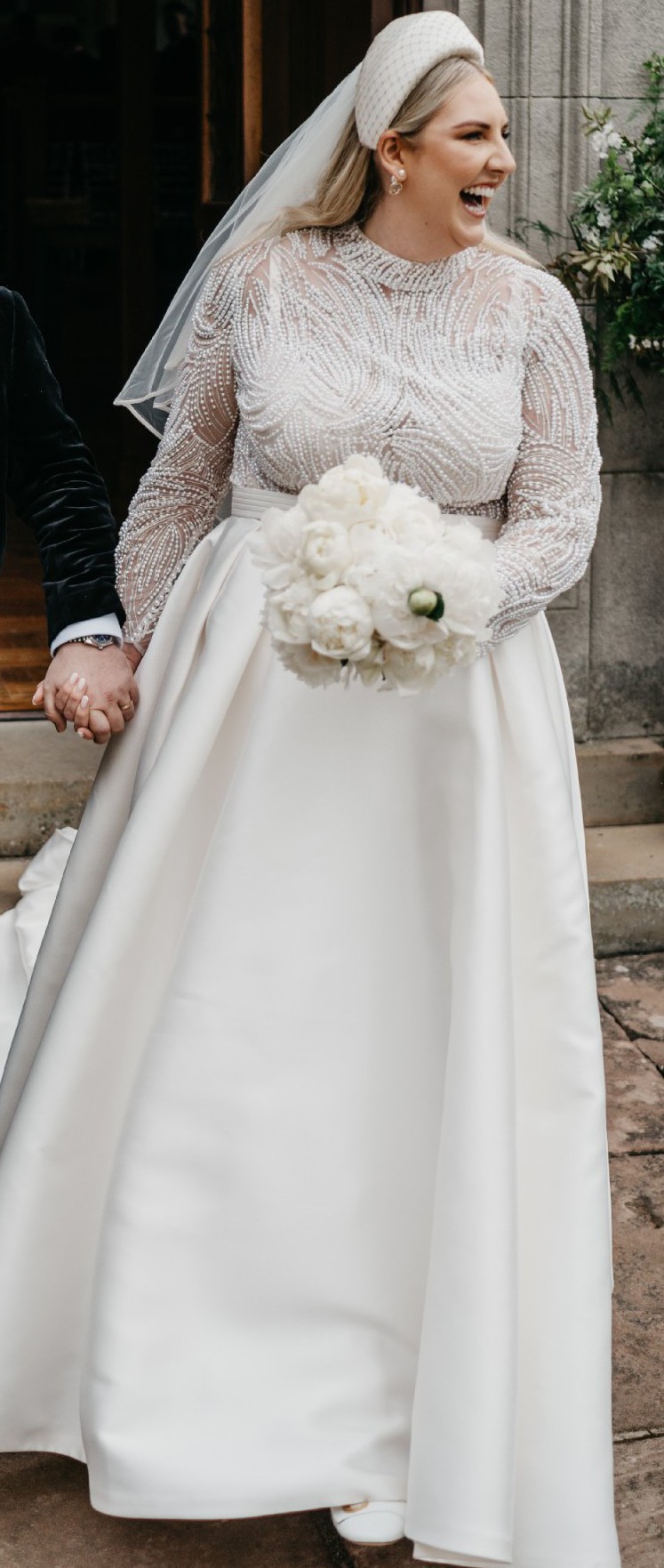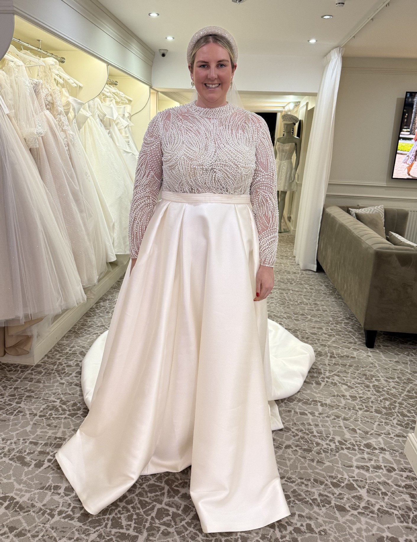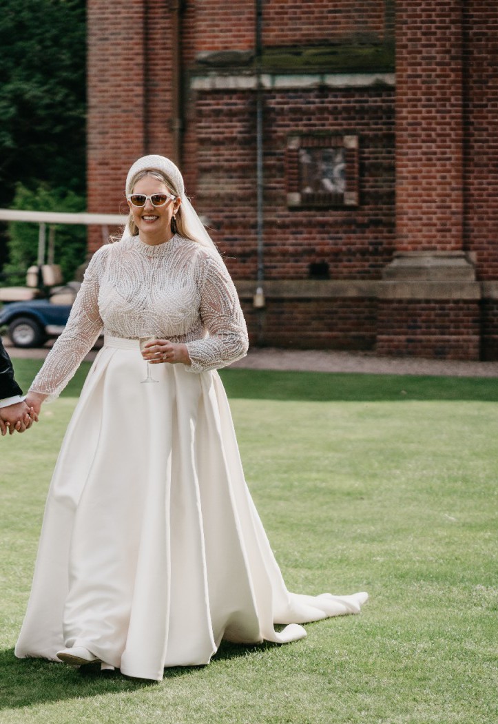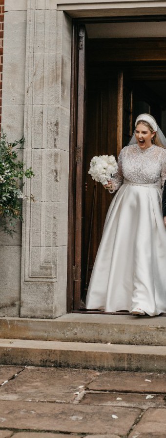 The intricate beading and delicate pearls throughout the dress shimmer with every movement, catching the light in the most magical way. What truly sets this dress apart is the hidden pockets — a unique feature that added both convenience and a playful touch on my big day.