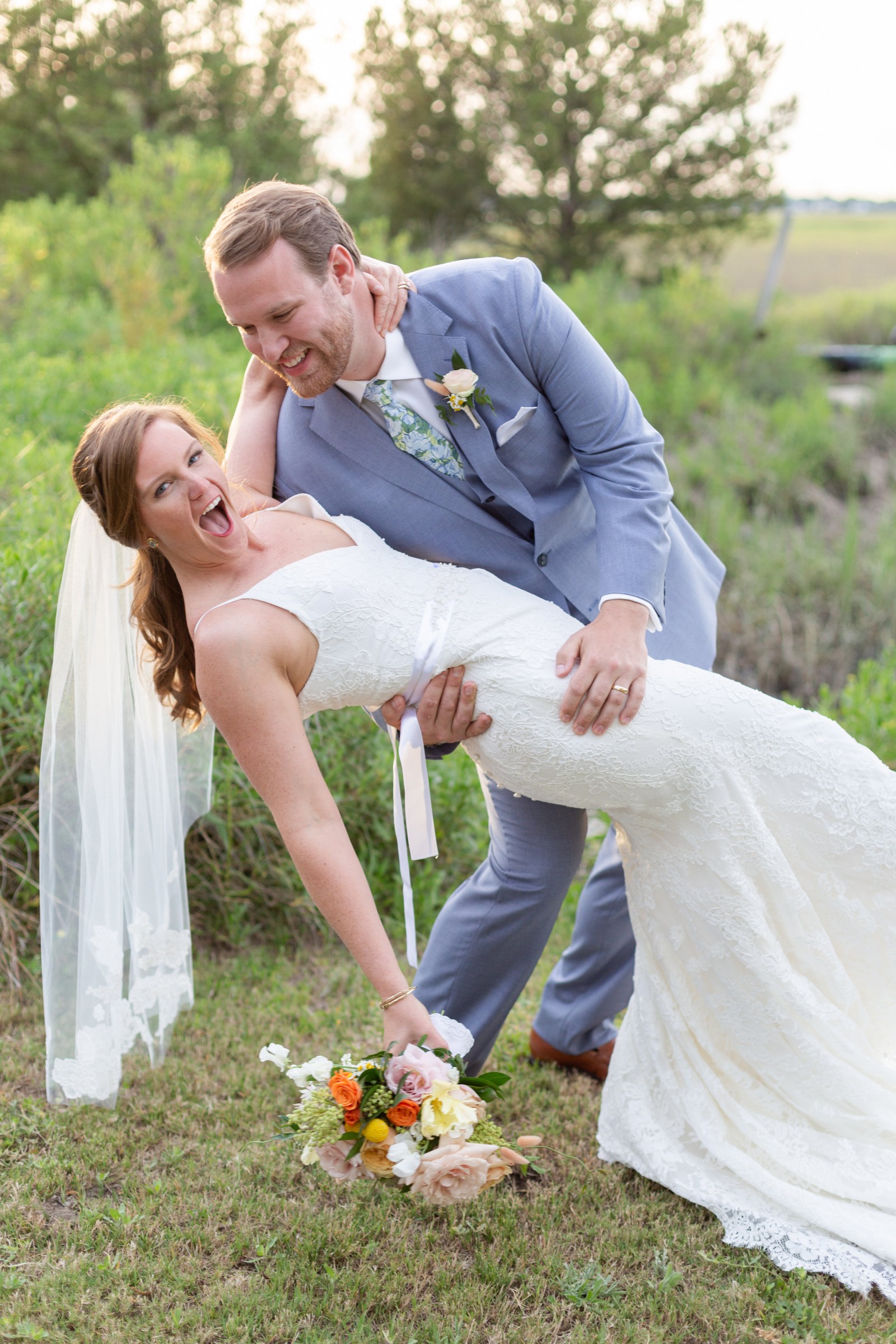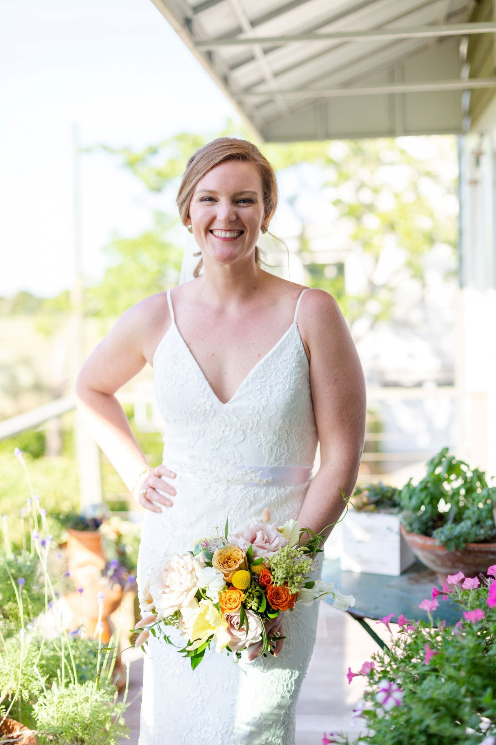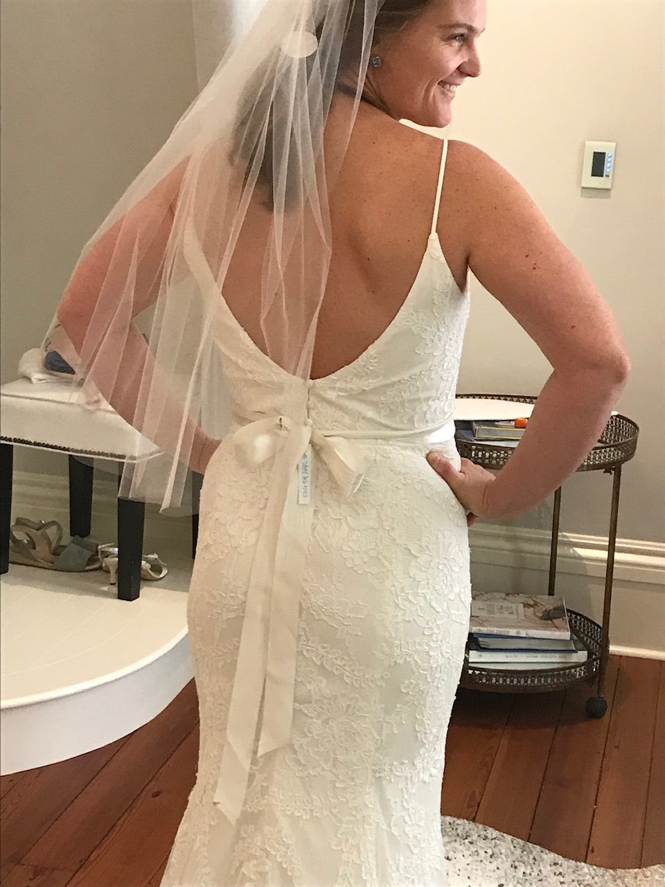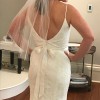 I loved this dress because it is such a flattering cut! Fit to flare shape with gorgeous lace detail. I love the “eye-lash” lace on the train. The back shows just enough skin and has silk buttons. This dress does not come with the veil or belt. .