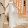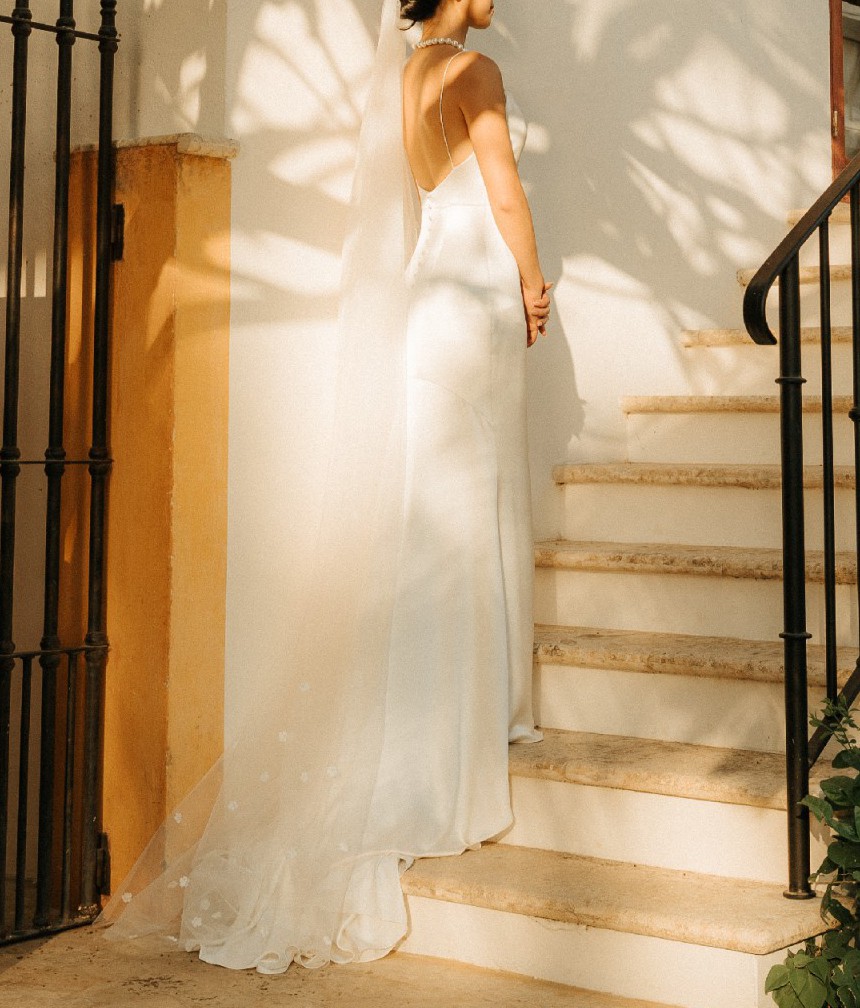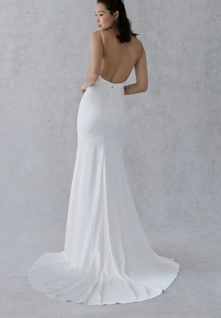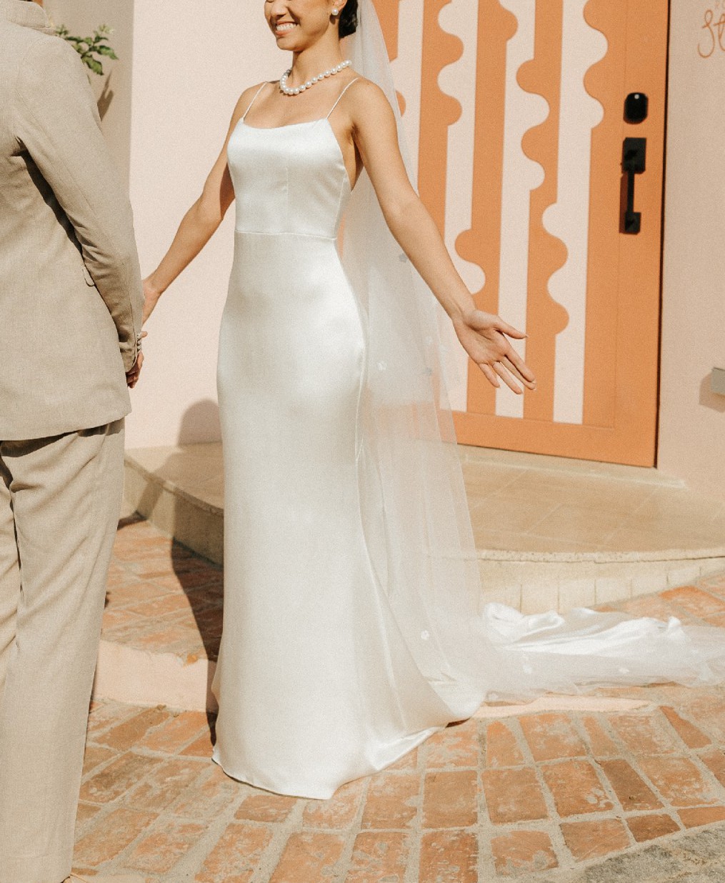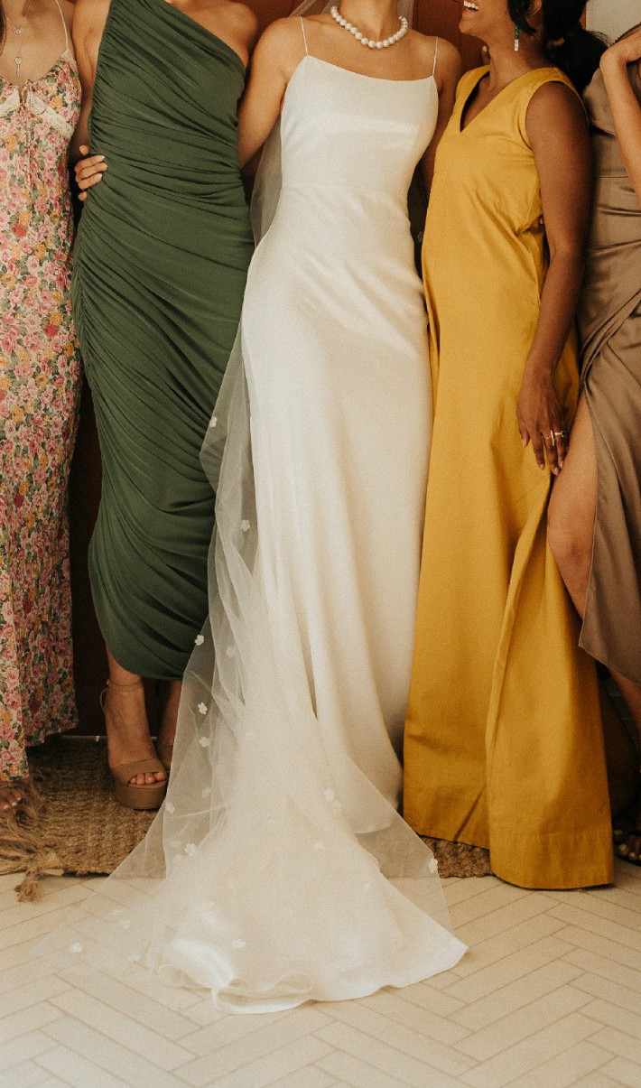 Selling my off-white Cleo Satin Wedding Dress by Alexandra Grecco! Professionally cleaned and I'll include my veil as well! 100% Silk Crepe. Purchased in 2023 in Austin Texas. I'm 5'6 and wore 2.5 inch heels. The dress is flush with the ground.