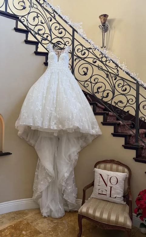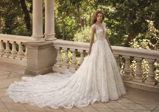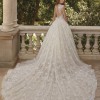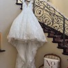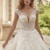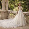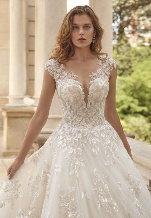 Glisten in the elegance of the ORIANA gown. This ball gown features glimmering beaded lace atop sparkling tulle with it’s sophisticated cap sleeves and deep sweetheart neckline. These shimmering details continue to the back of the design with a sexy button up illusion back. Matching Veil – V215.
