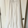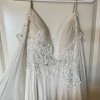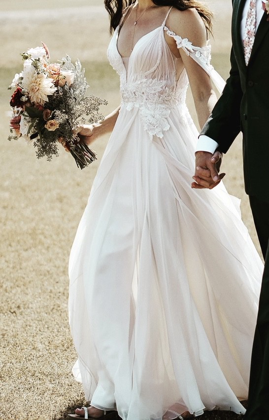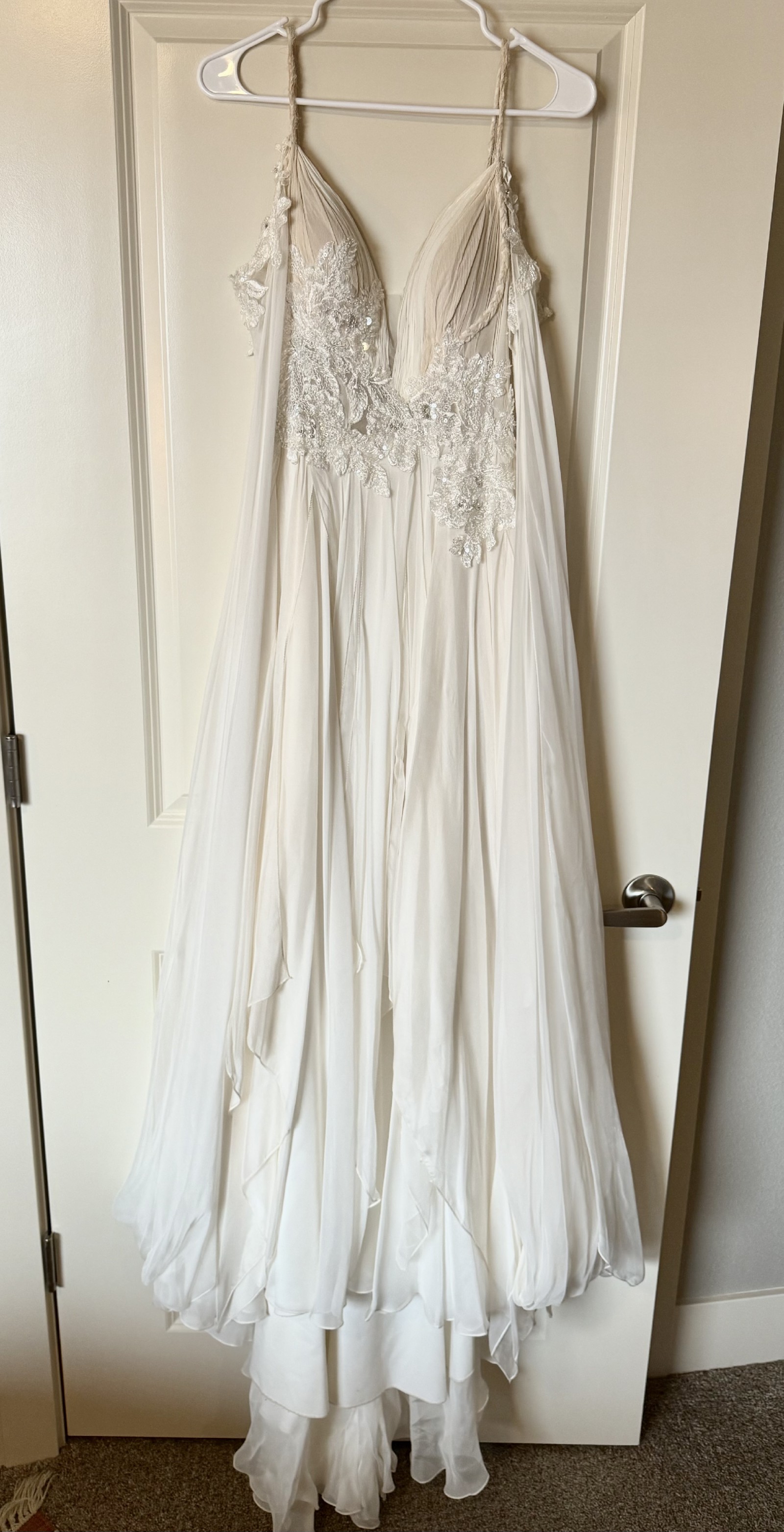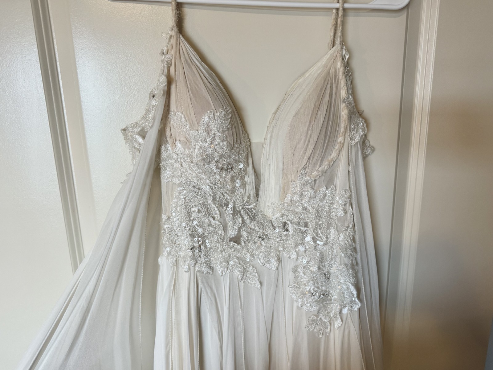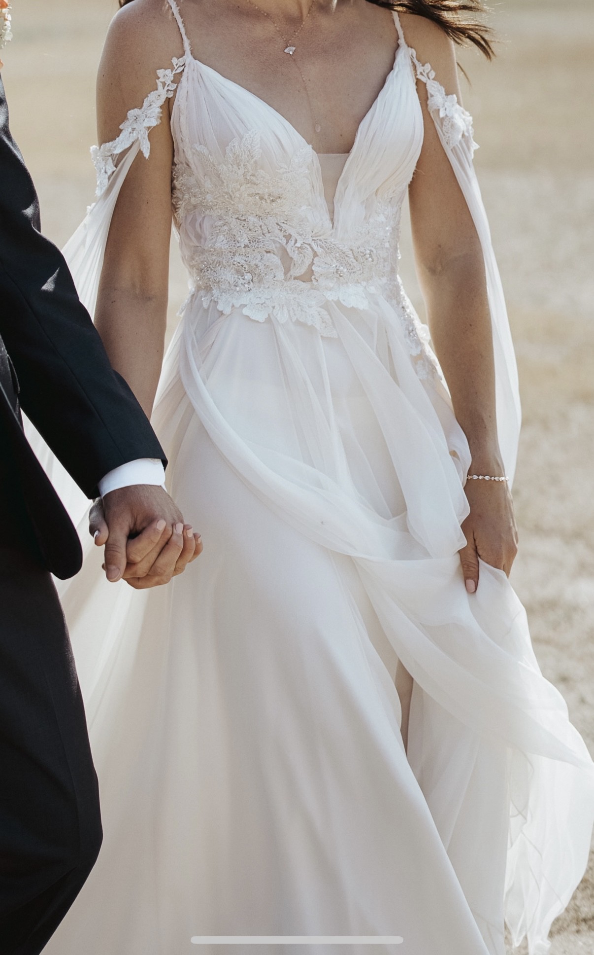 NOTE: The skirt of this dress is brand new. My wedding was outdoors, and although the dress was professionally cleaned afterward, the cleaners accidentally used something that discolored the original skirt. They covered the full $1,500 cost to have Daci (the woman that made the dress) replace it, so the entire bottom half of the dress is completely new with no snags or wear. The chiffon straps are beautifully braided, and they are quite delicate. This is the only portion of the dress I anticipate might need adjusted depending on how fitted you want them.