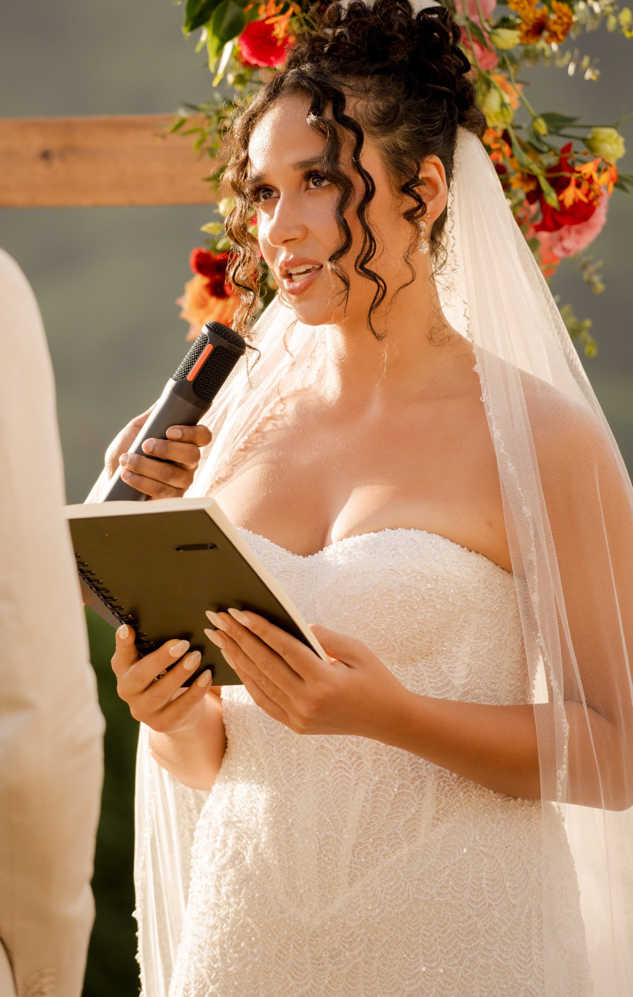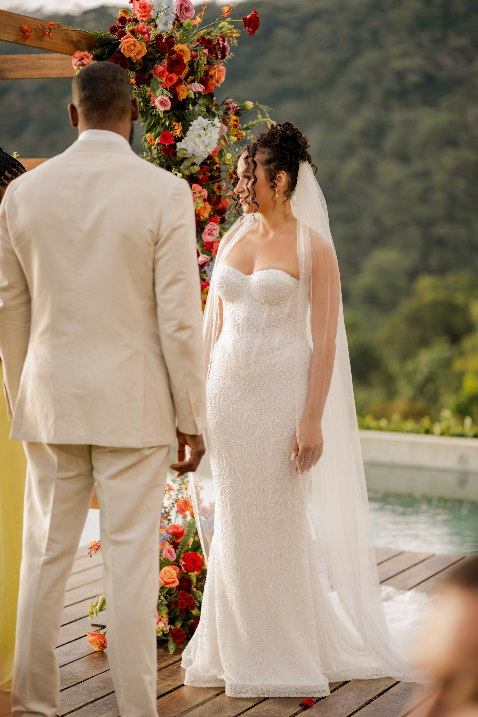 This gown was worn once for a wedding in Costa Rica and has been professionally cleaned. It’s in excellent condition, with no stains or visible damage. Minor alterations were done for a tailored fit (can easily be adjusted again). The included cathedral-length veil with crystal beaded trim perfectly complements the gown’s luxurious finish.