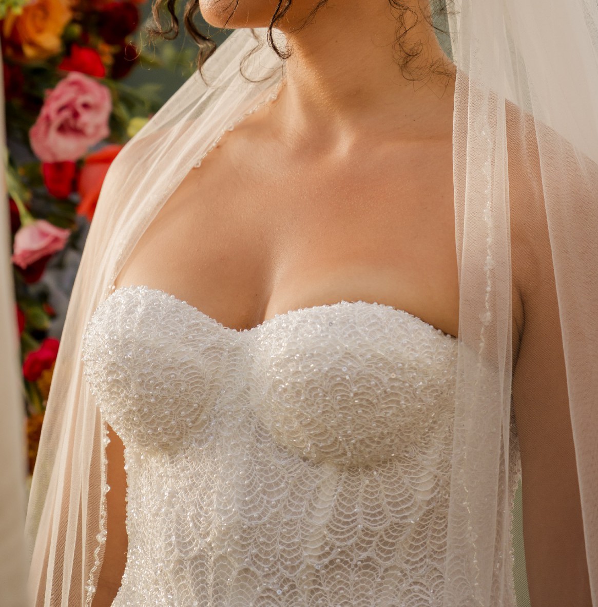 This luxurious Viero Bridal “Sabbia” gown features intricate beaded lace adorned with shimmering beads and pearls, catching the light beautifully from every angle. The structured basque waist and corseted bodice sculpt an elegant hourglass silhouette that feels both secure and incredibly flattering. The gown is fitted through the hips and thighs before softly flaring into a subtle mermaid train - giving that perfect balance of sultry and timeless.