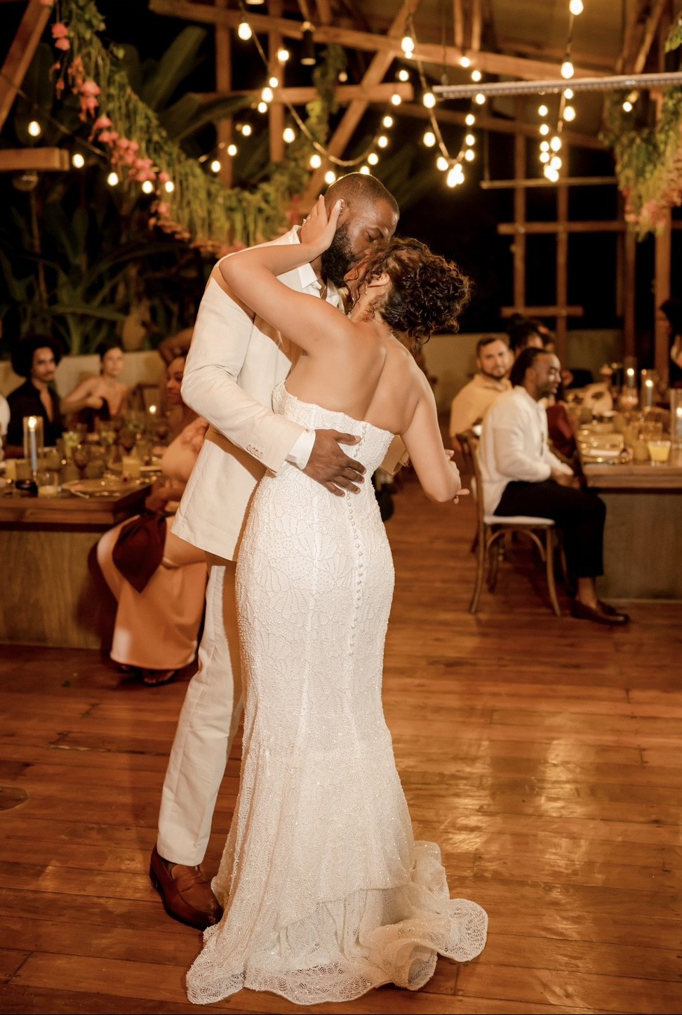 The fabric has just enough stretch to move comfortably, while the inner construction smooths and supports your figure all night long. Every detail - from the delicate floral lace pattern to the radiant beadwork - was designed to photograph like a dream, glowing under natural sunlight and evening string lights alike.
