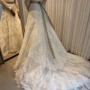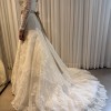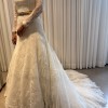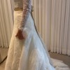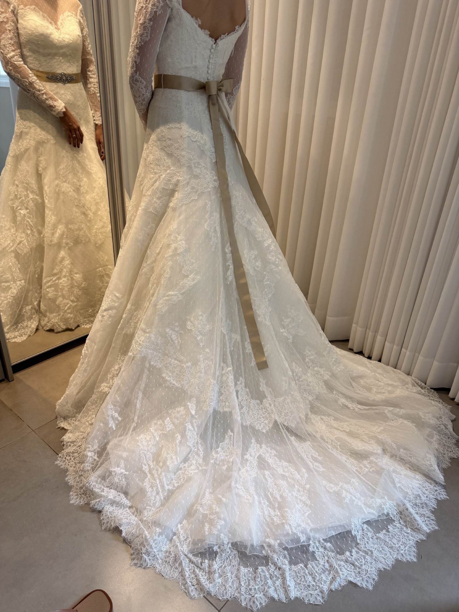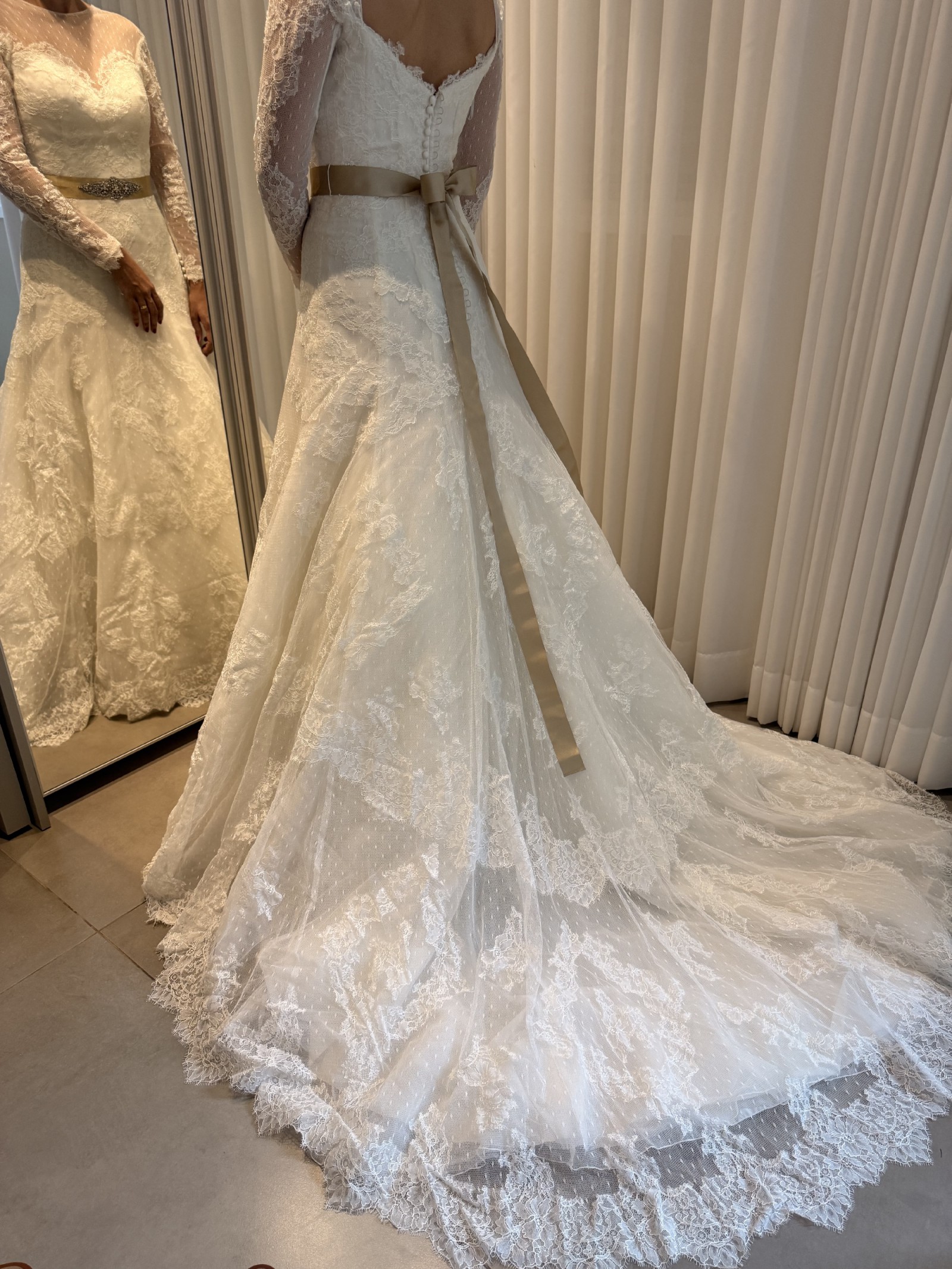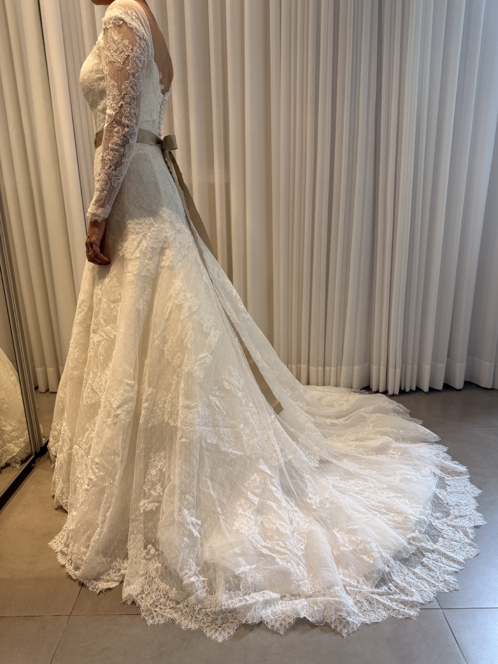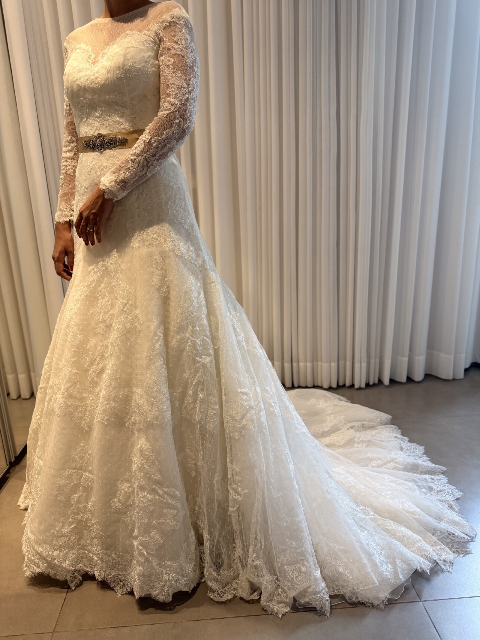 O corte valoriza a silhueta em um estilo sereia com cauda média e mangas longas em tule ilusion com renda francesa, transmitindo romantismo e sofisticação.