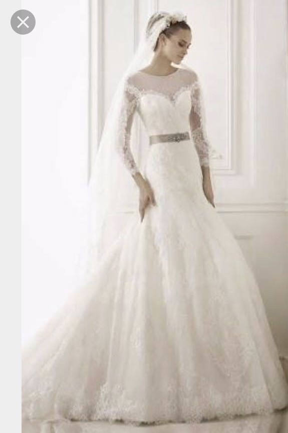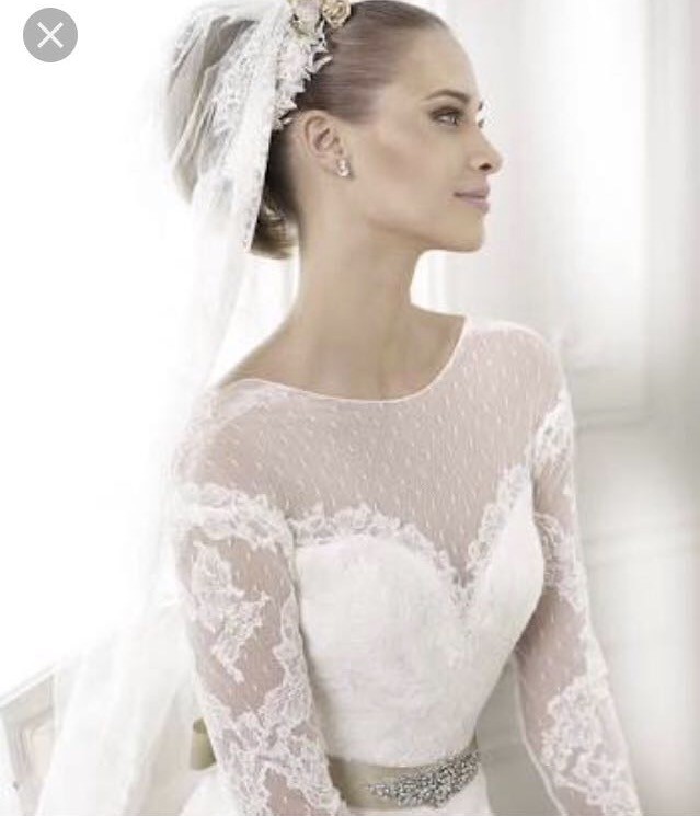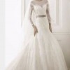 Vestido clássico e elegante confeccionado em tule com renda delicada, cor off white, modelo Blanche da grife Pronovias (coleção 2015).