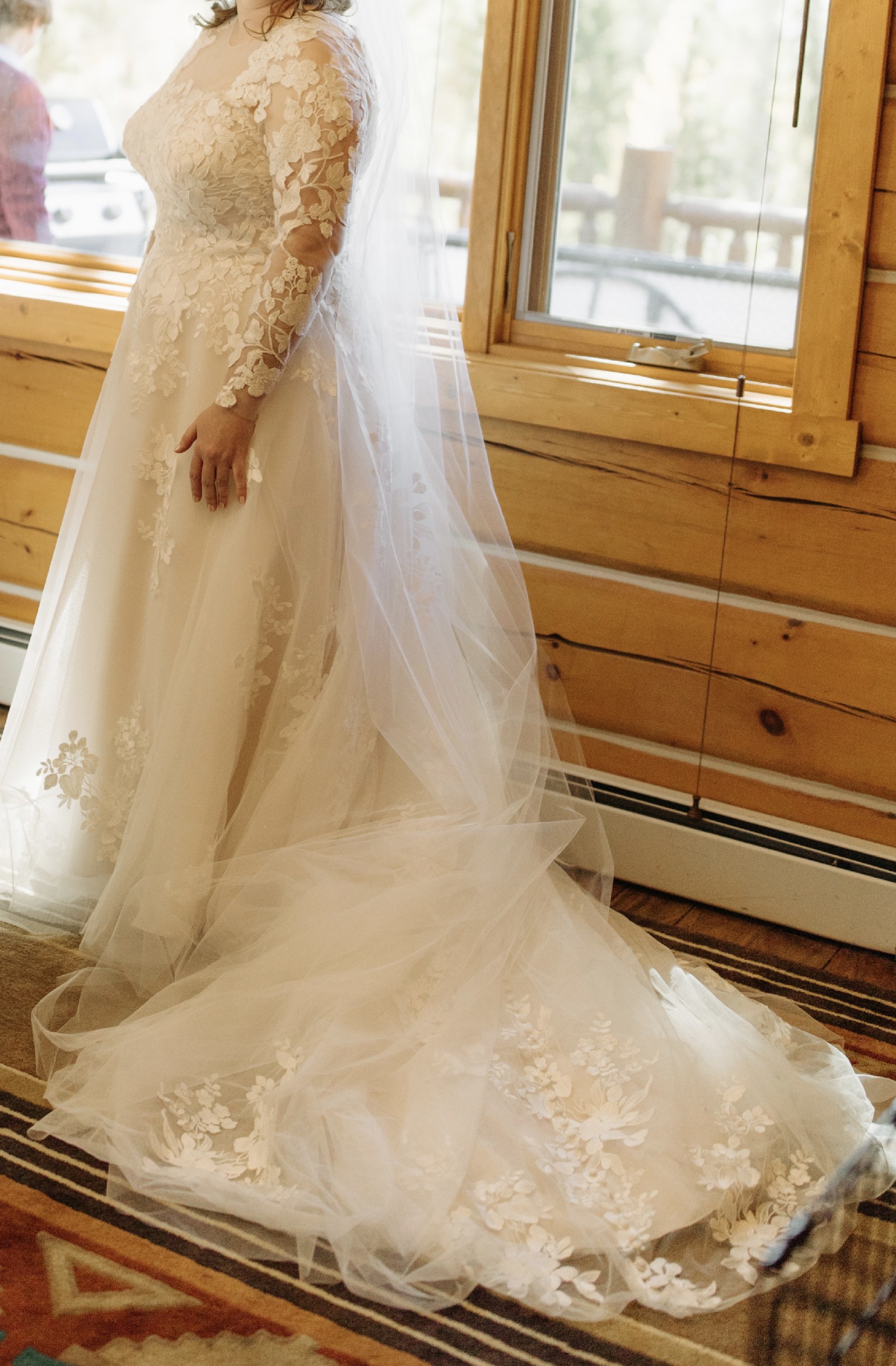 The low back detail is simply enchanting with buttons flowing all the way down the back, providing just the right amount of allure without being over-the-top. The classic white fabric has a subtle shimmer in the light, creating a radiant glow that made me feel effortlessly beautiful. Designed for comfort and style, this size 18 gown allowed me to move freely throughout the day, from the ceremony to the reception.