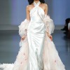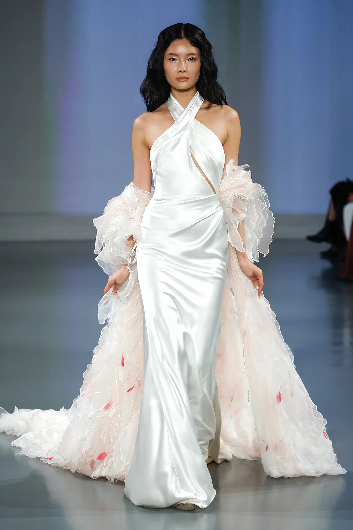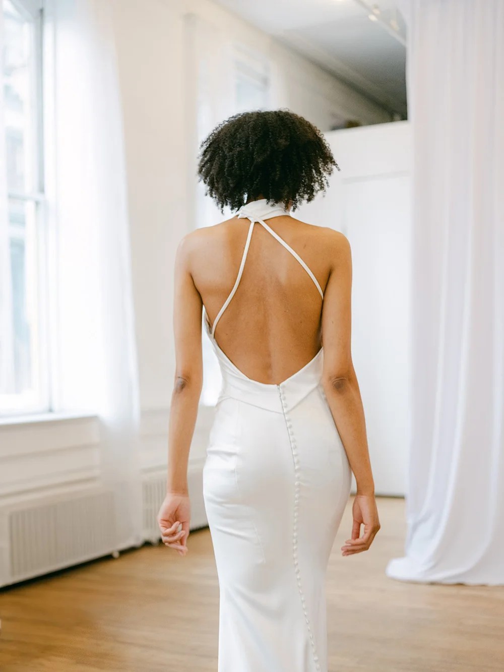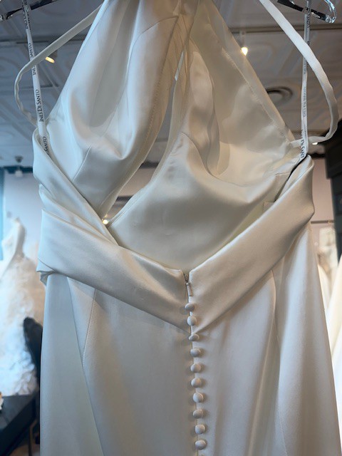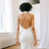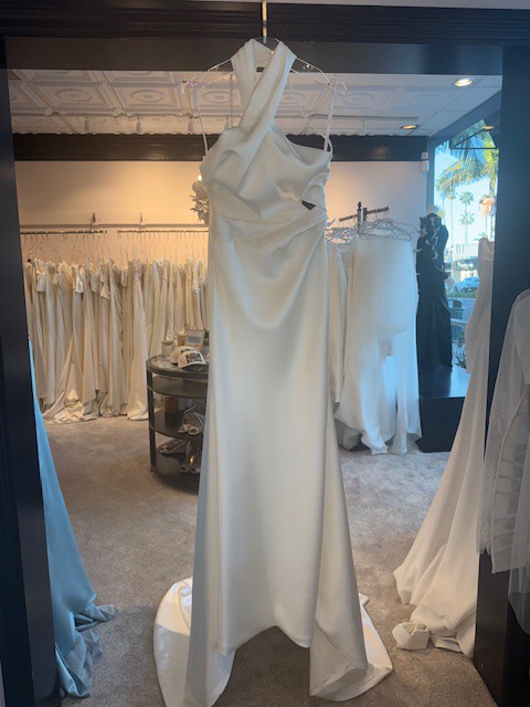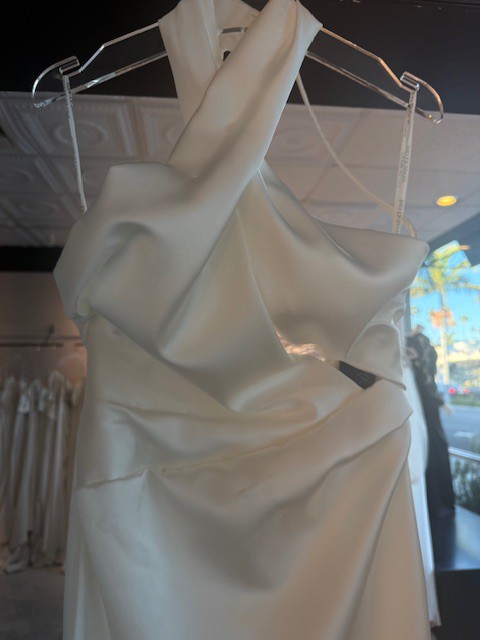 Ida by Ines Di Santo is a sheath gown with a halter neckline and a peek-a-boo bodice. Along with a draped skirt and a low back, this wedding dress is in the color Off White