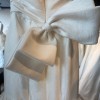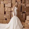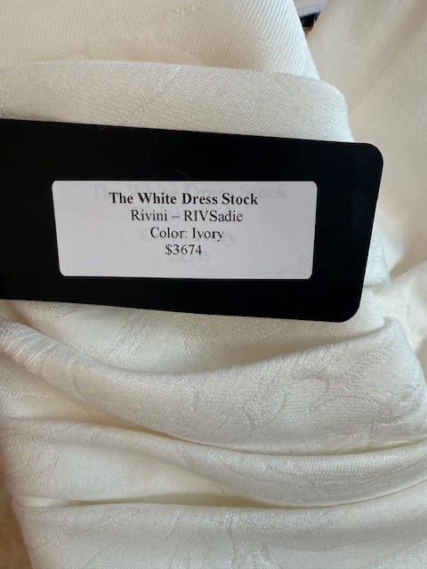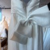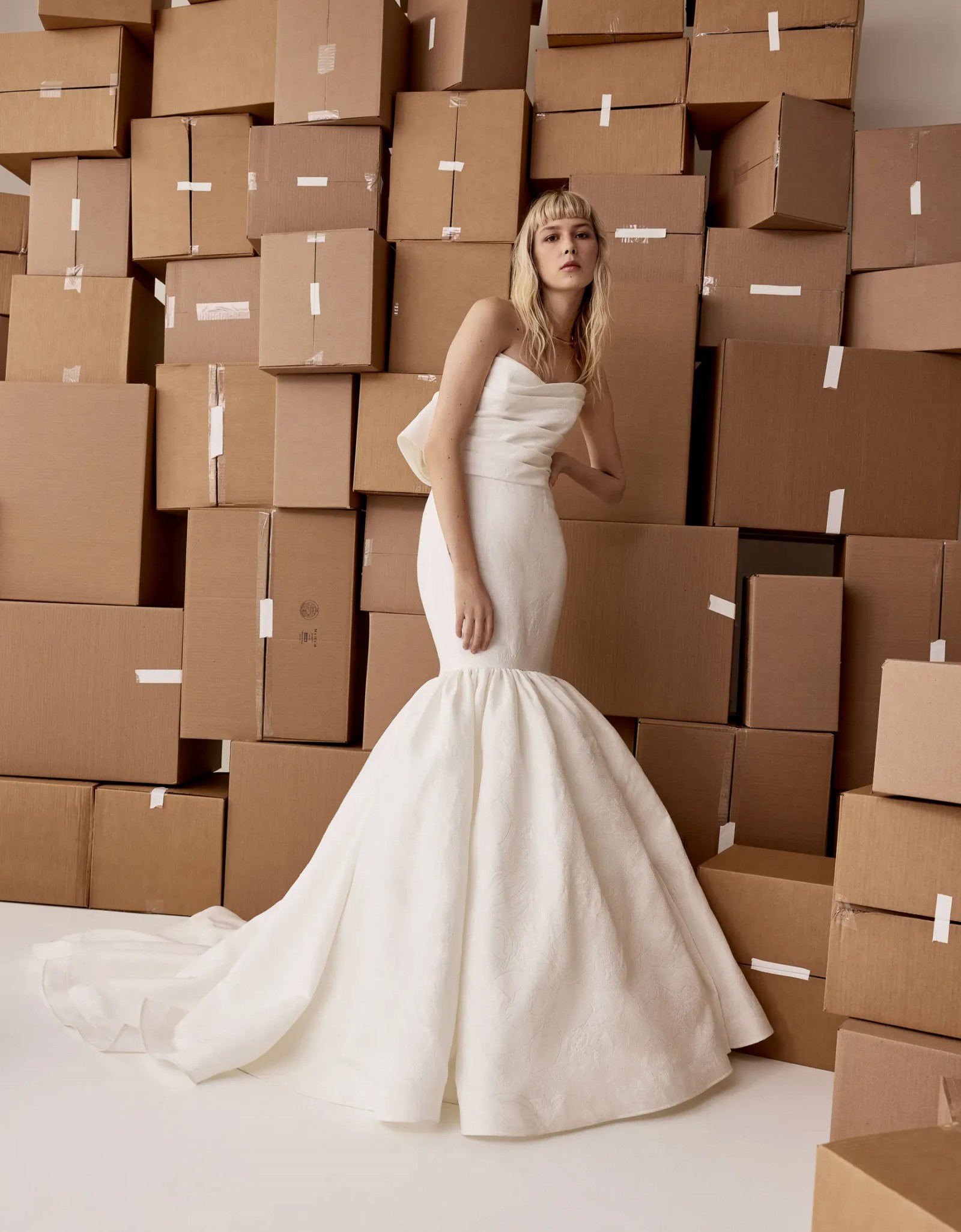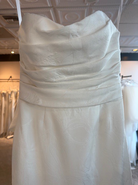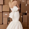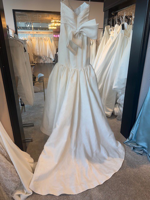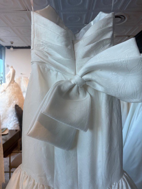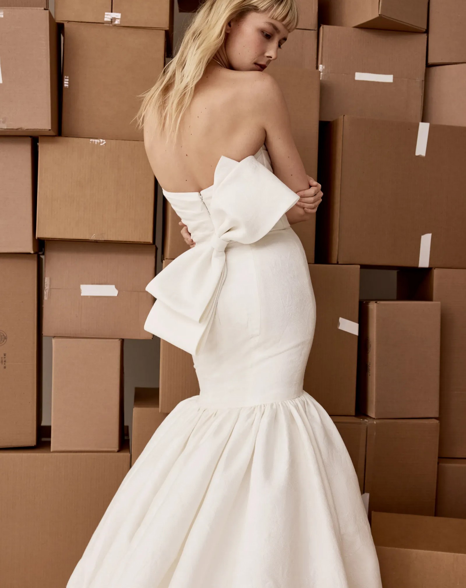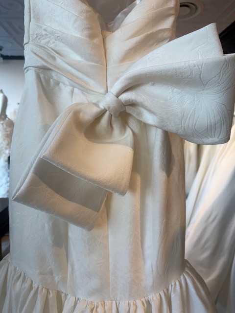 Strapless draped bodice matelassé fit & flare gown finished with double bow detail