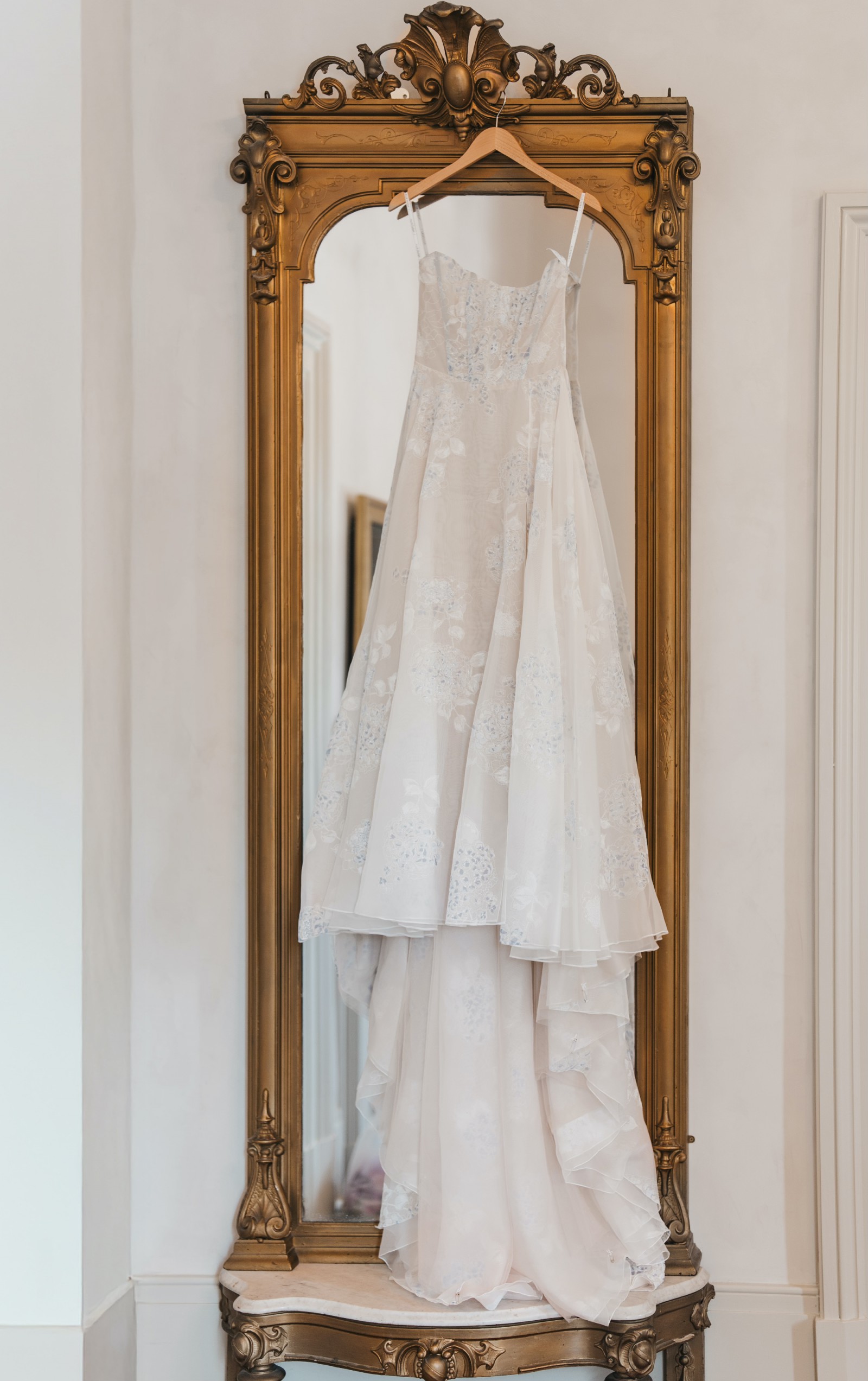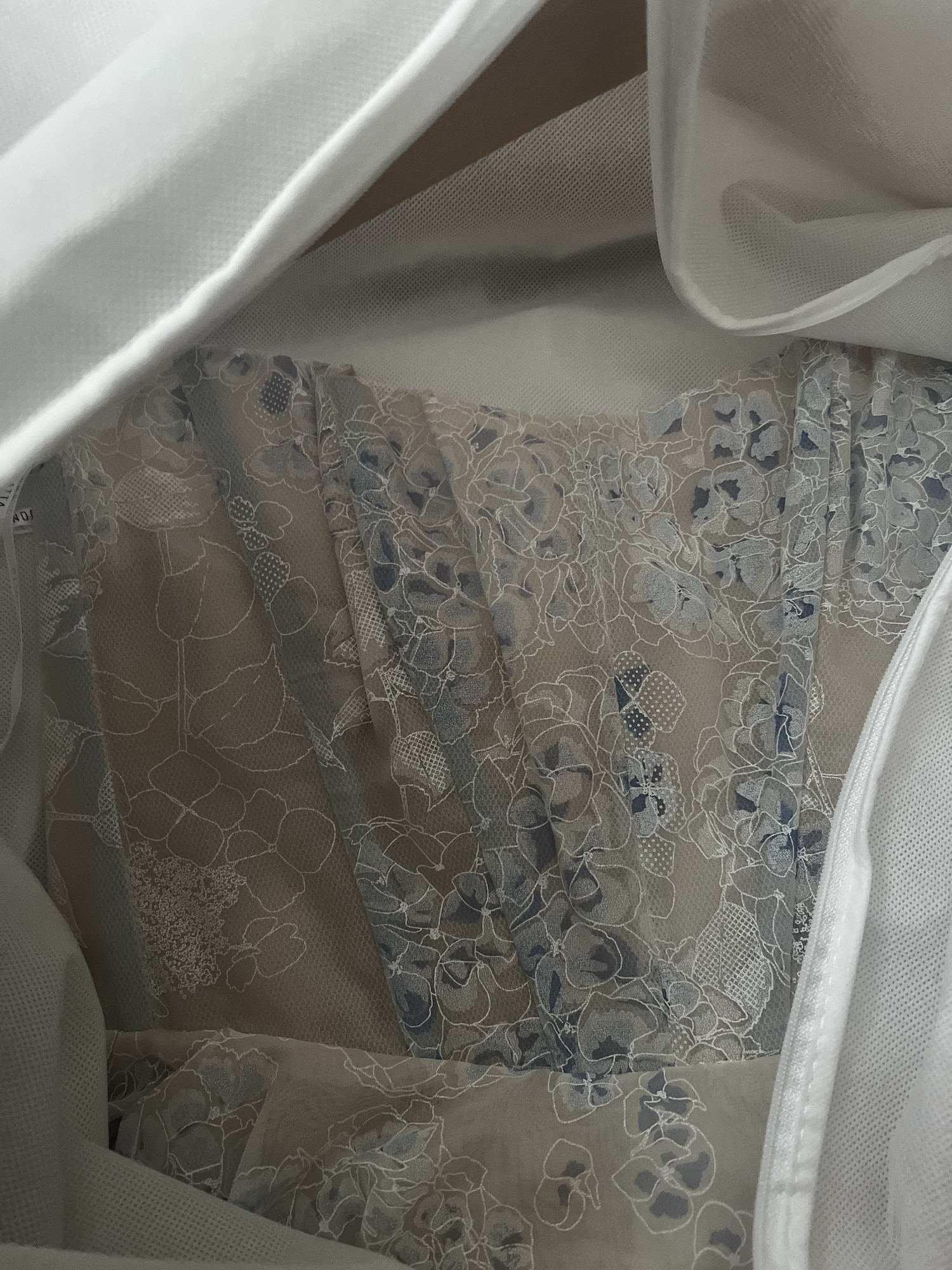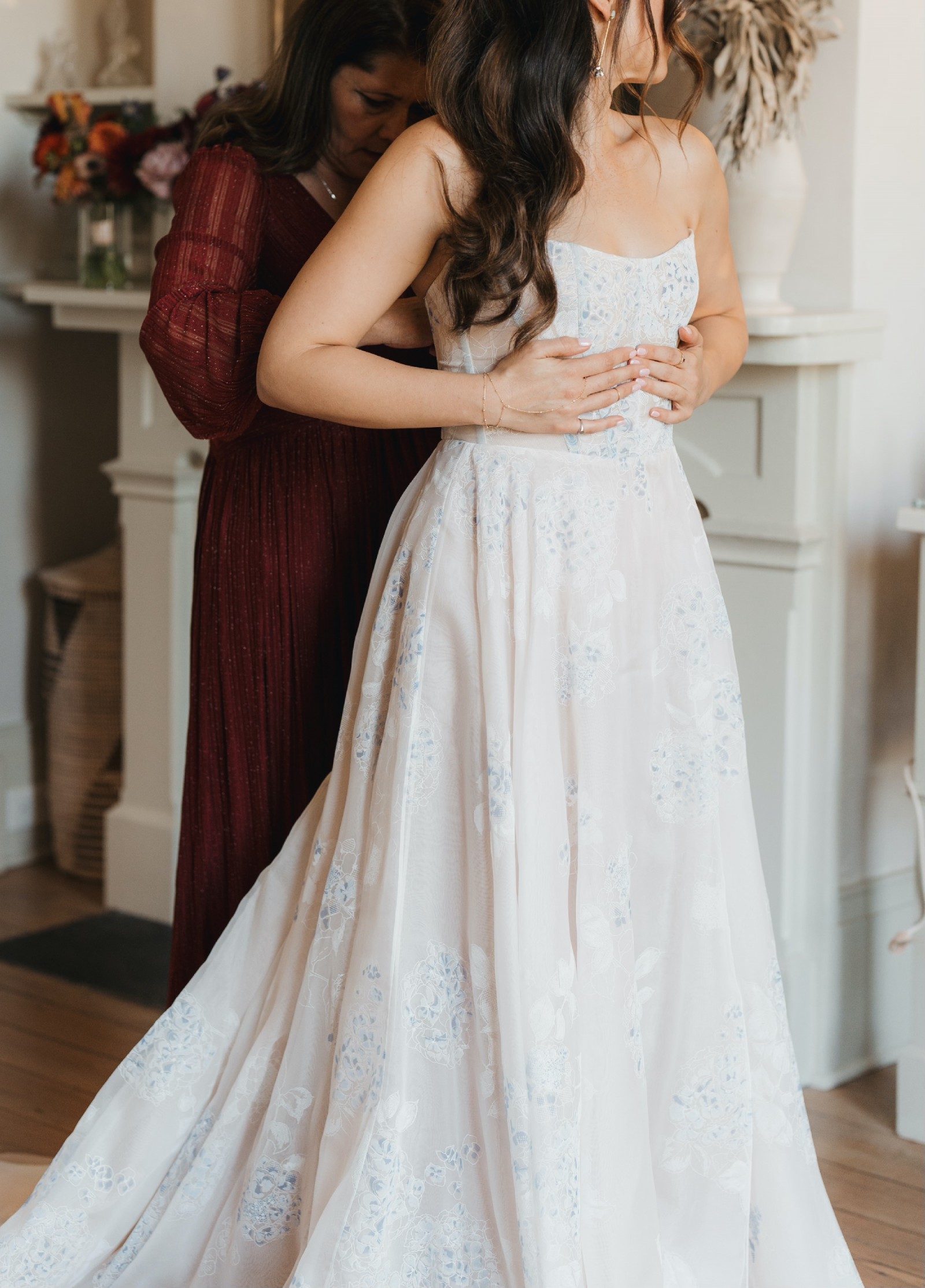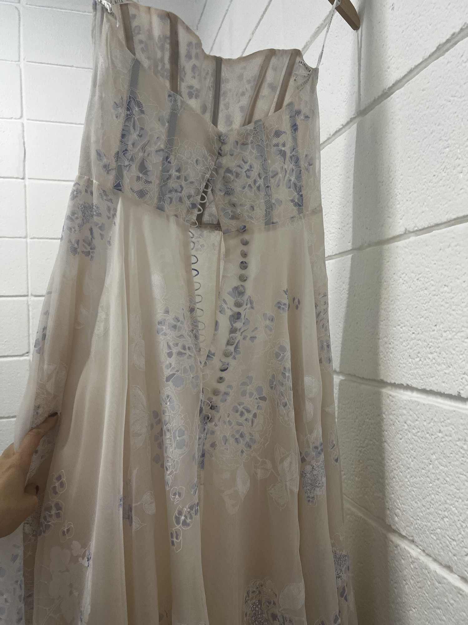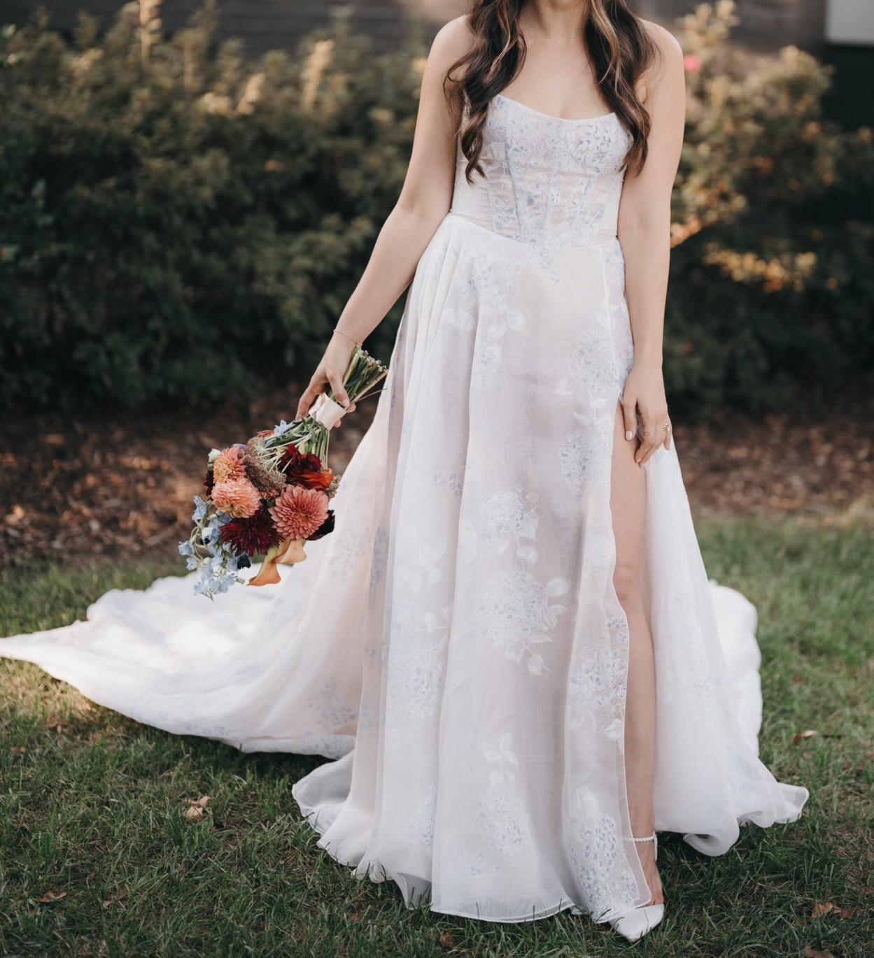 Button back (gorgeous!), blue details, blush undertones, exposed corset boning. Perfect combo of feminine, edgy, sexy, and classy without being too bridal. A-line shape with the corset is so flattering.