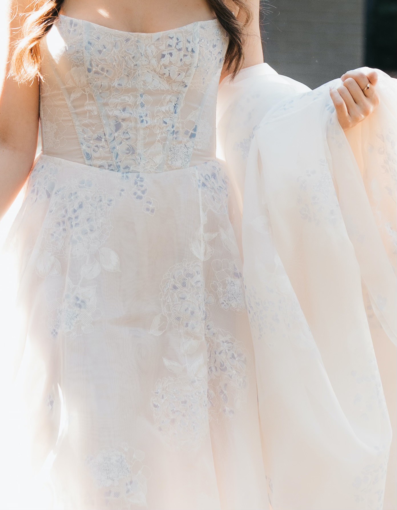 Crafted from luxurious ivory organza (very lightweight and breathable! - you will not need a second look!), this dress is not only breathtaking but also comfortable to wear. The soft fabric drapes beautifully and moves effortlessly as you walk, making it perfect for dancing the night away. The curve neckline gracefully frames the face, enhancing your natural beauty, and the strapless design provides a classic, timeless look.