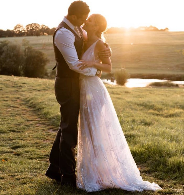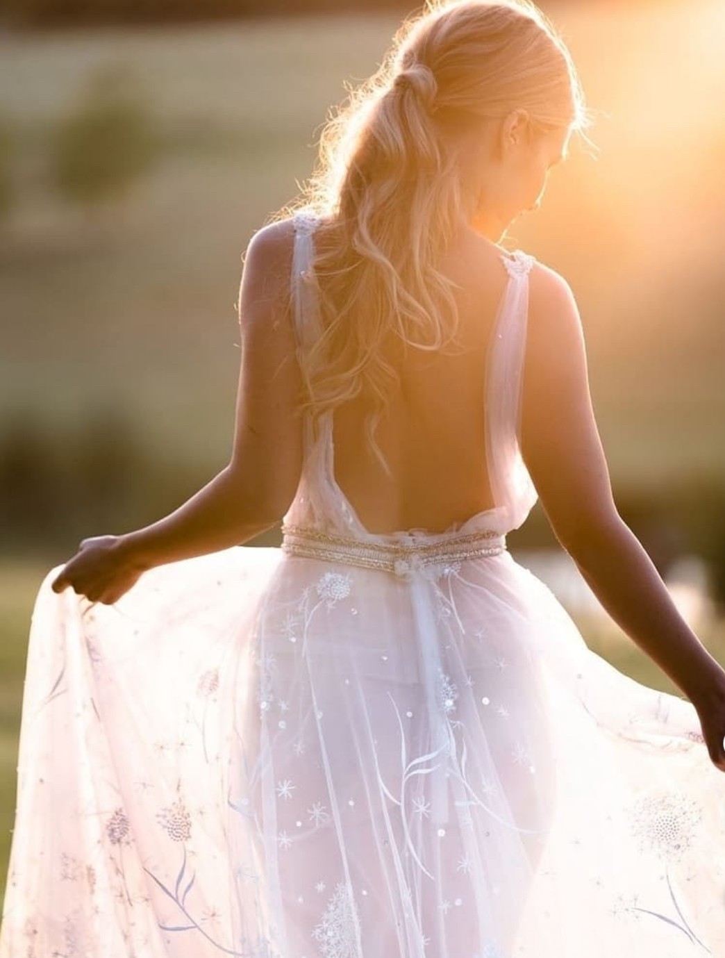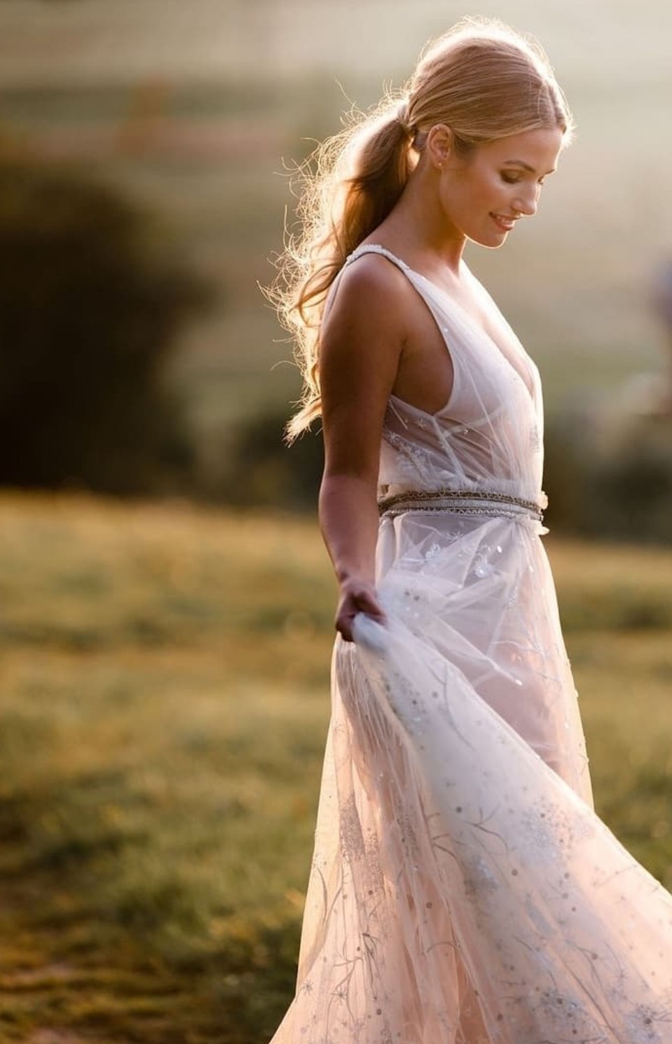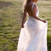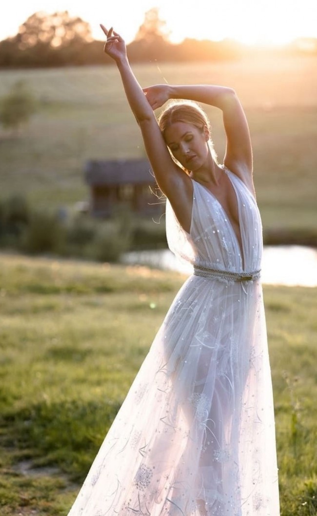 The tulle is airy and lightweight and with only a slight sweep of a train, you can move freely all day/night! Wear as your whimsical wedding gown, reception gown or even rehearsal dinner if you wish.