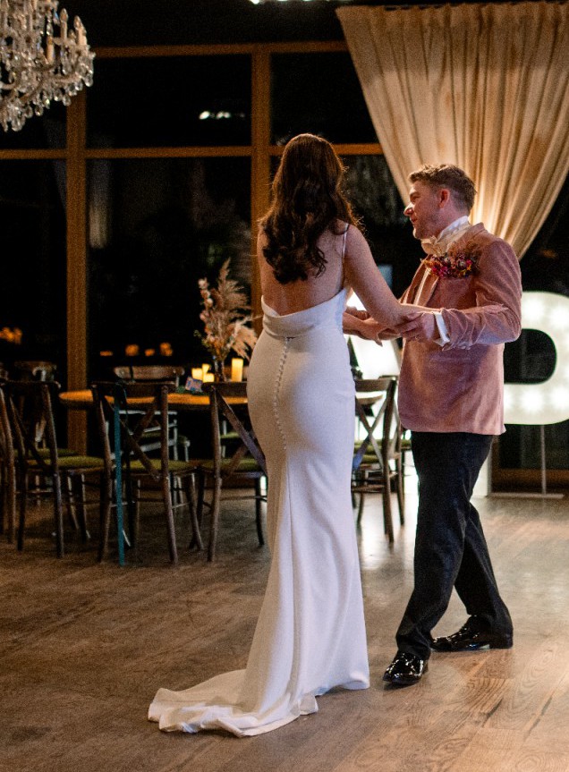 I wore this dress for 3 hours as it was my evening dress. It is in excellent condition and has been professionally dry cleaned with no marks. I shortened the original train as it was my evening dress (more of a puddle train), which makes it super easy to dance in!