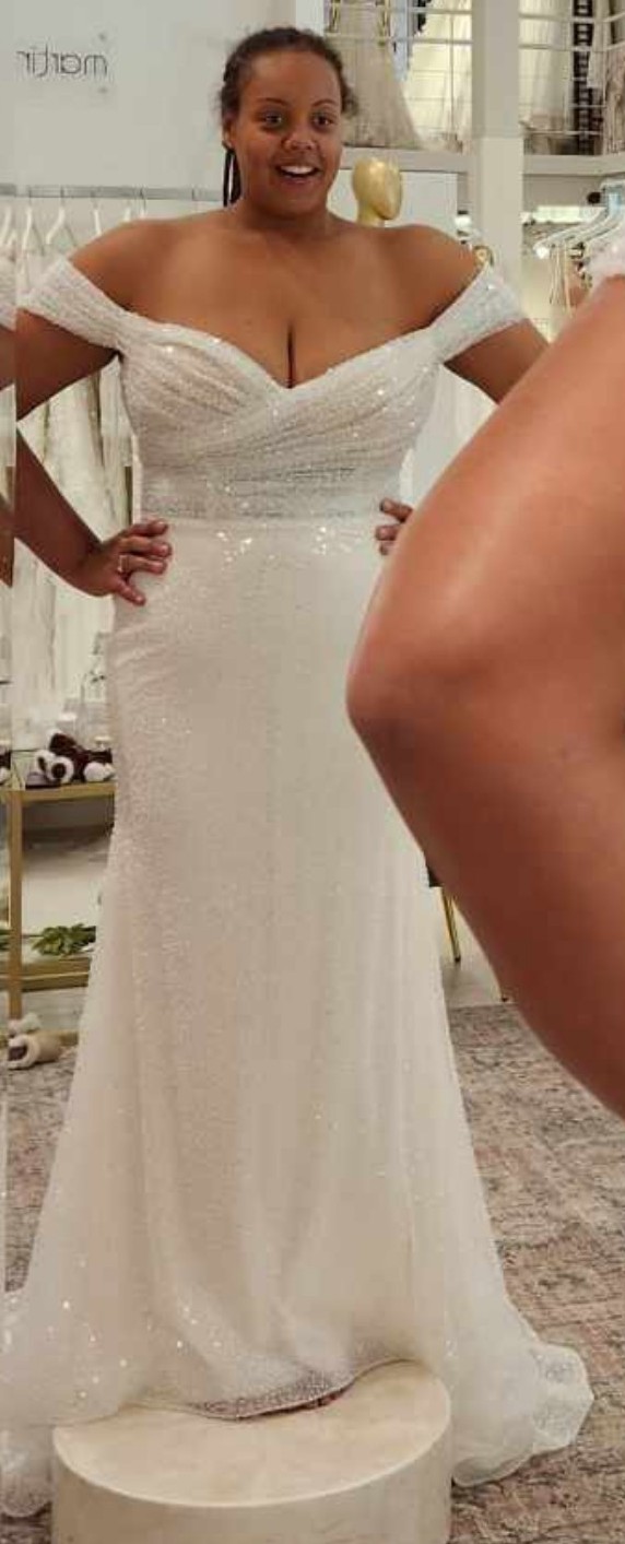 This dress is absolutely beautiful and I fell in love so fast, I still love it. I’m a bigger girl and I never thought I would love such a fitted dress, but it fit me like a GLOVE and looked phenomenal. It’s top to bottom sparkle, and just so elegant. It’s never been worn though, as I purchased it before having a baby and it just doesn’t fit the same as it used to, and I don’t want to stress about having to lose weight before our wedding this summer. Help a postpartum mom flip from a beautiful dress that fit pre baby, to a new dress that feels much better in my new body, and you get my first love of a wedding dress in return!
