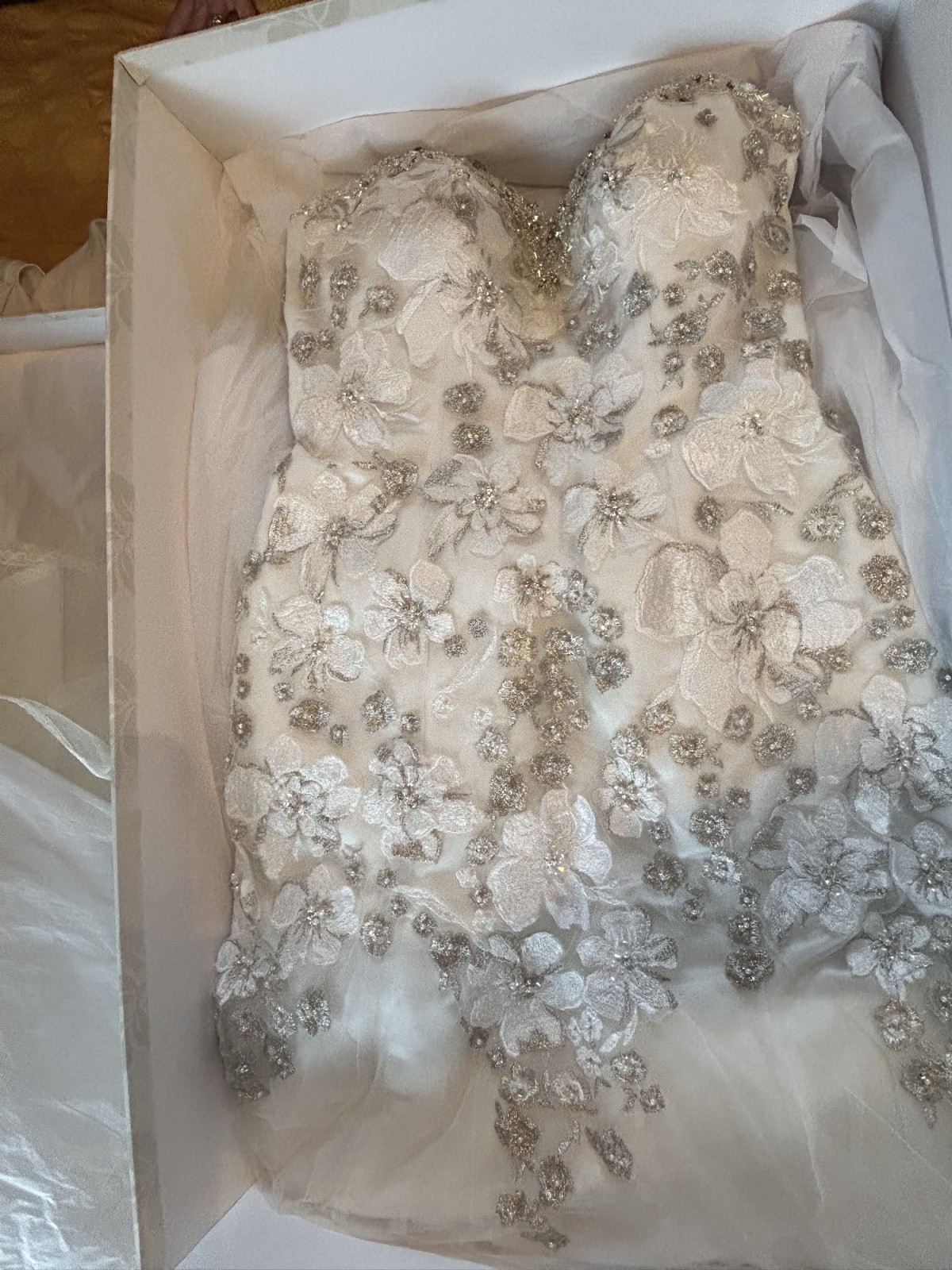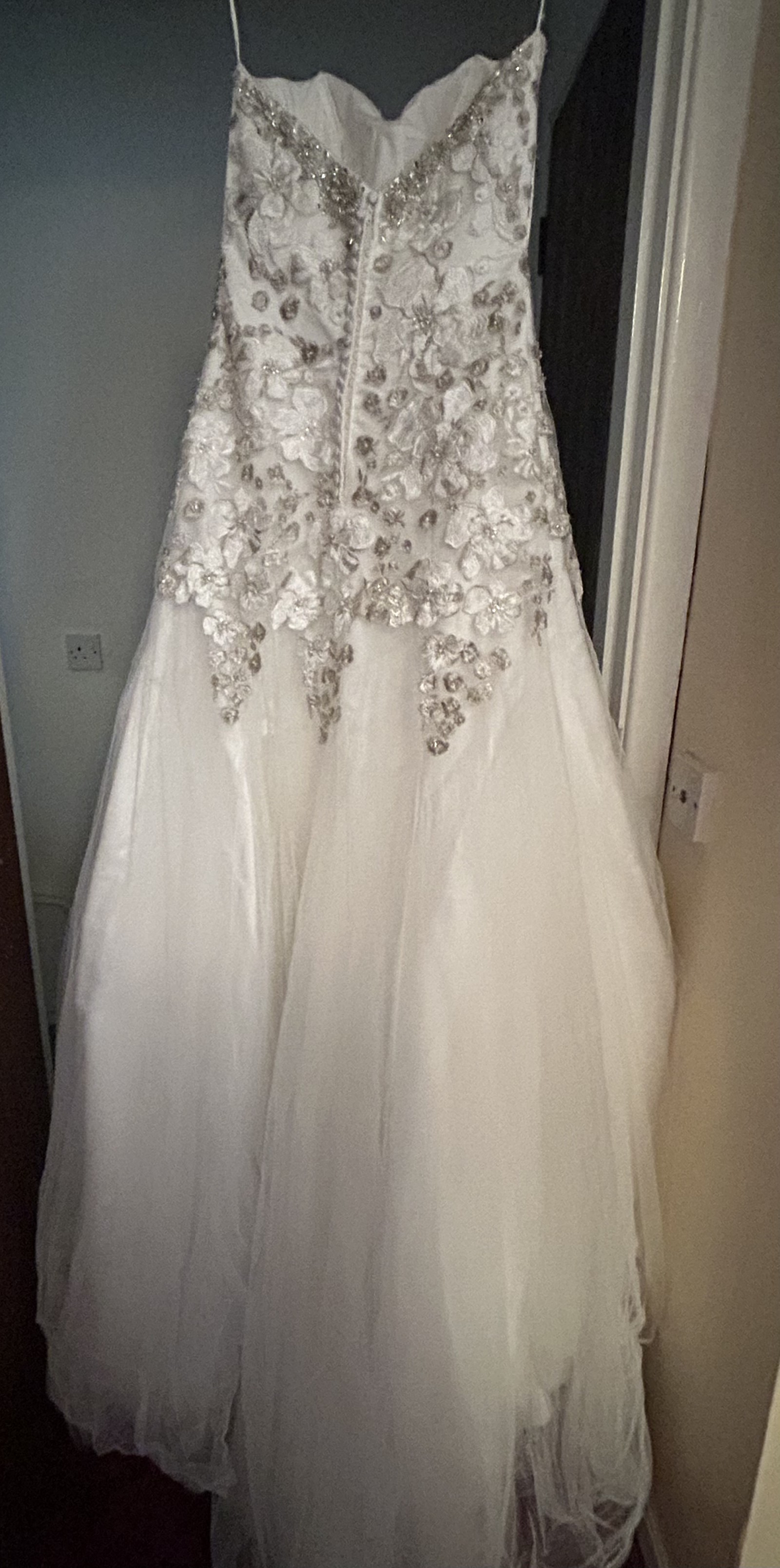 This size 10 dress has been meticulously cared for, ensuring it remains in pristine condition for its next bride. Dry cleaned and stored in a protective wedding dress box. I hope to pass this dress on to someone who will appreciate its beauty and create their own unforgettable memories. If you’re looking for a wedding dress that embodies elegance and charm, this is the one. Let it be a part of your love story!