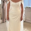 Bodice: Gently scooped neckline with arm drapes and asymmetric gathers from one side.