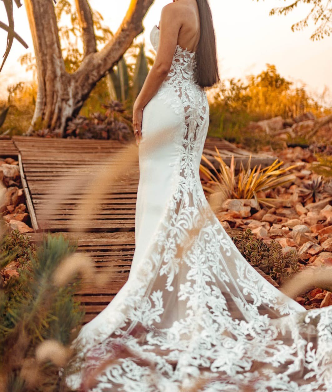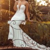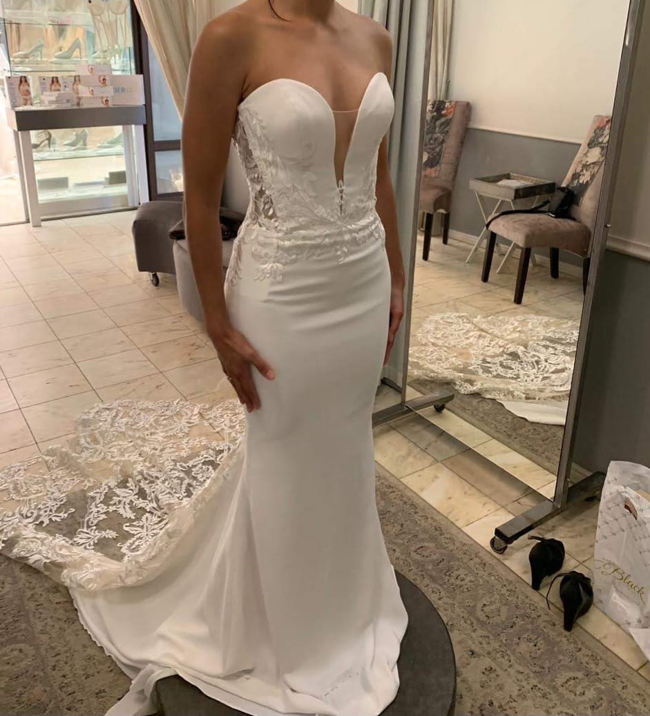 This stunning fit and flare wedding dress is a cherished piece from one of the most special days of my life. The sweetheart neckline beautifully showcases the collarbone, adding a touch of romance, while the low back creates an alluring silhouette that will captivate every onlooker. The strapless design offers both elegance and comfort, allowing you to dance the night away with ease.