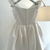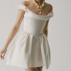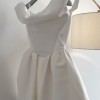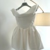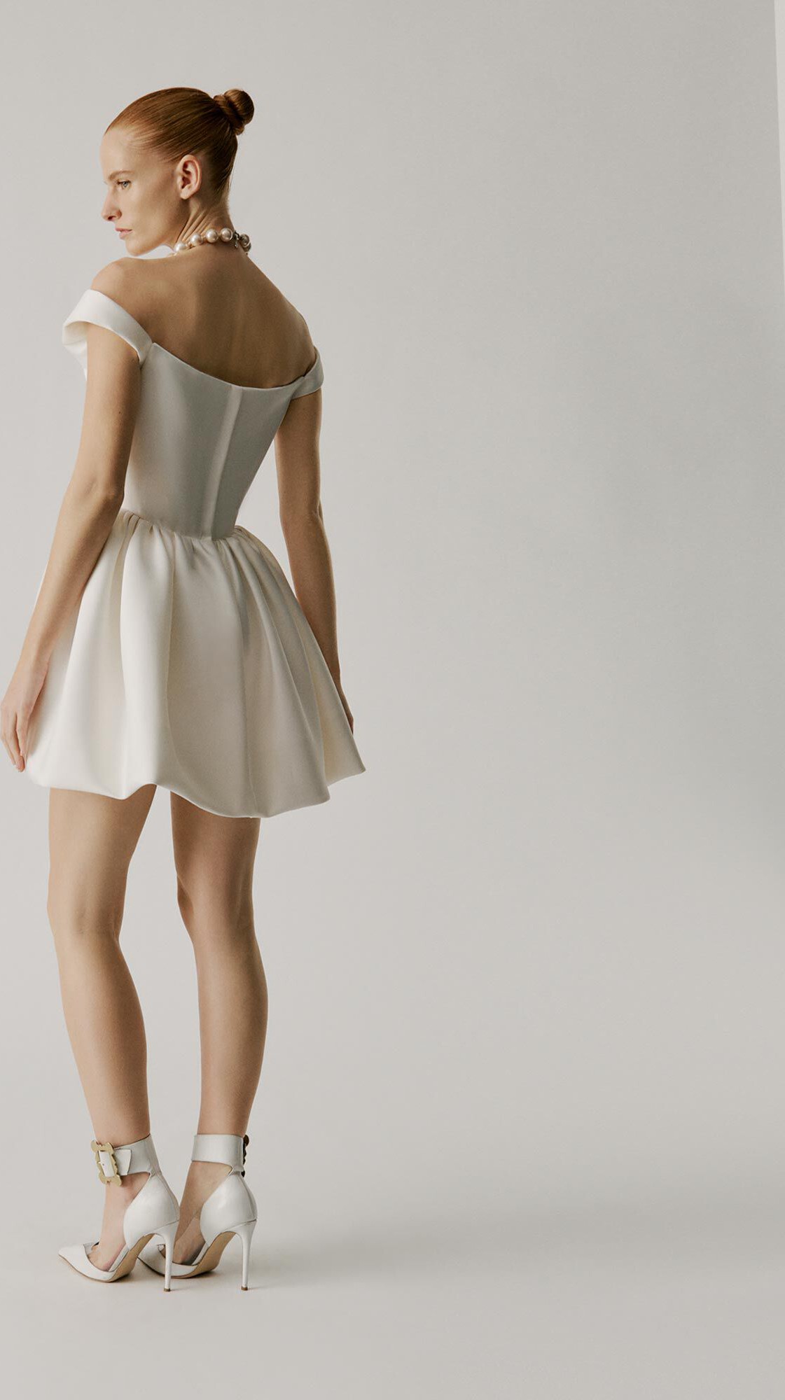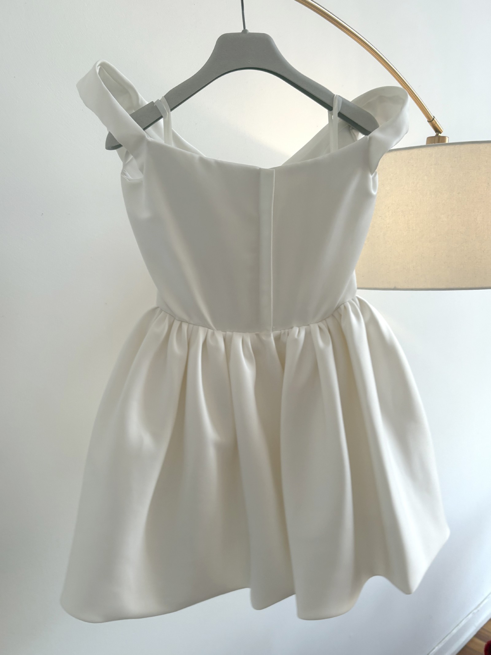 "Our Mini Bagatelle dress is a charming update to the iconic Nova Bagatelle dress. Its structured silhouette features a cinched waist, while a romantic neckline is highlighted by draped fabric that sweeps across the shoulders. The full mini skirt, with deep pleats, conceals hidden pockets, adding both movement and practicality to the design."
