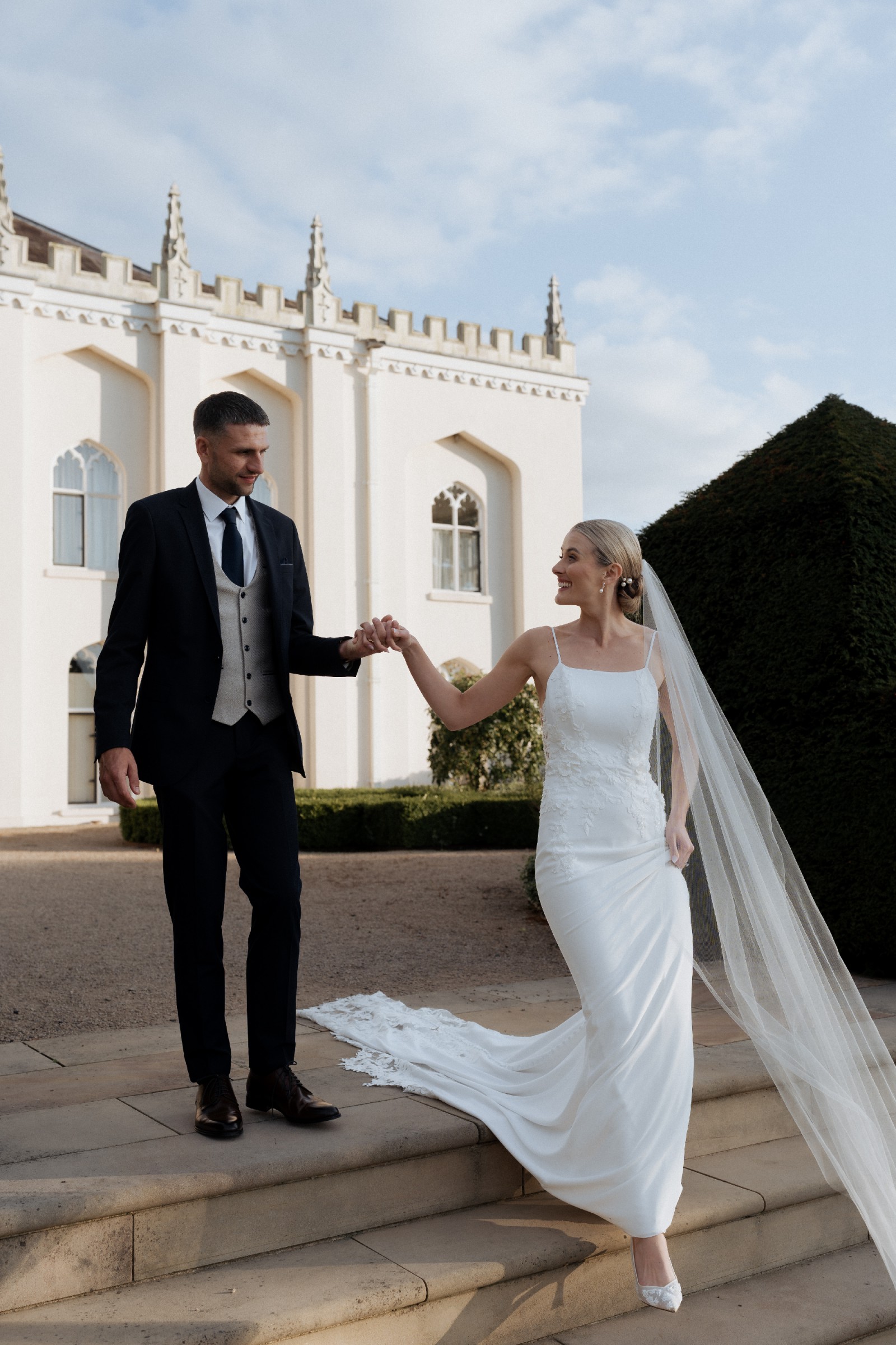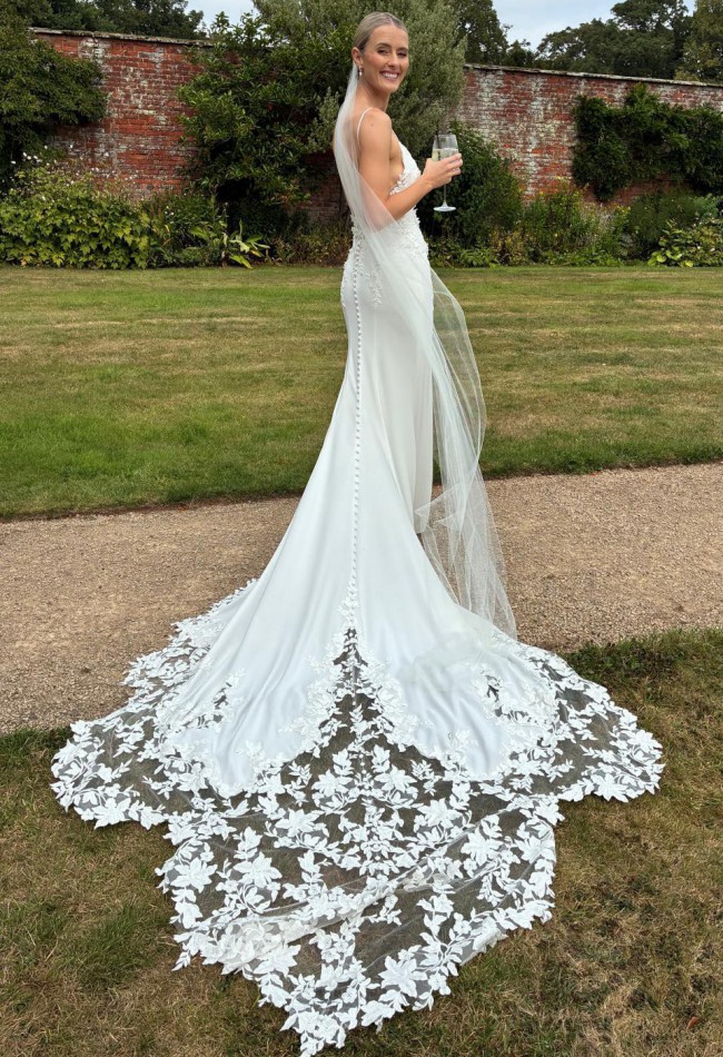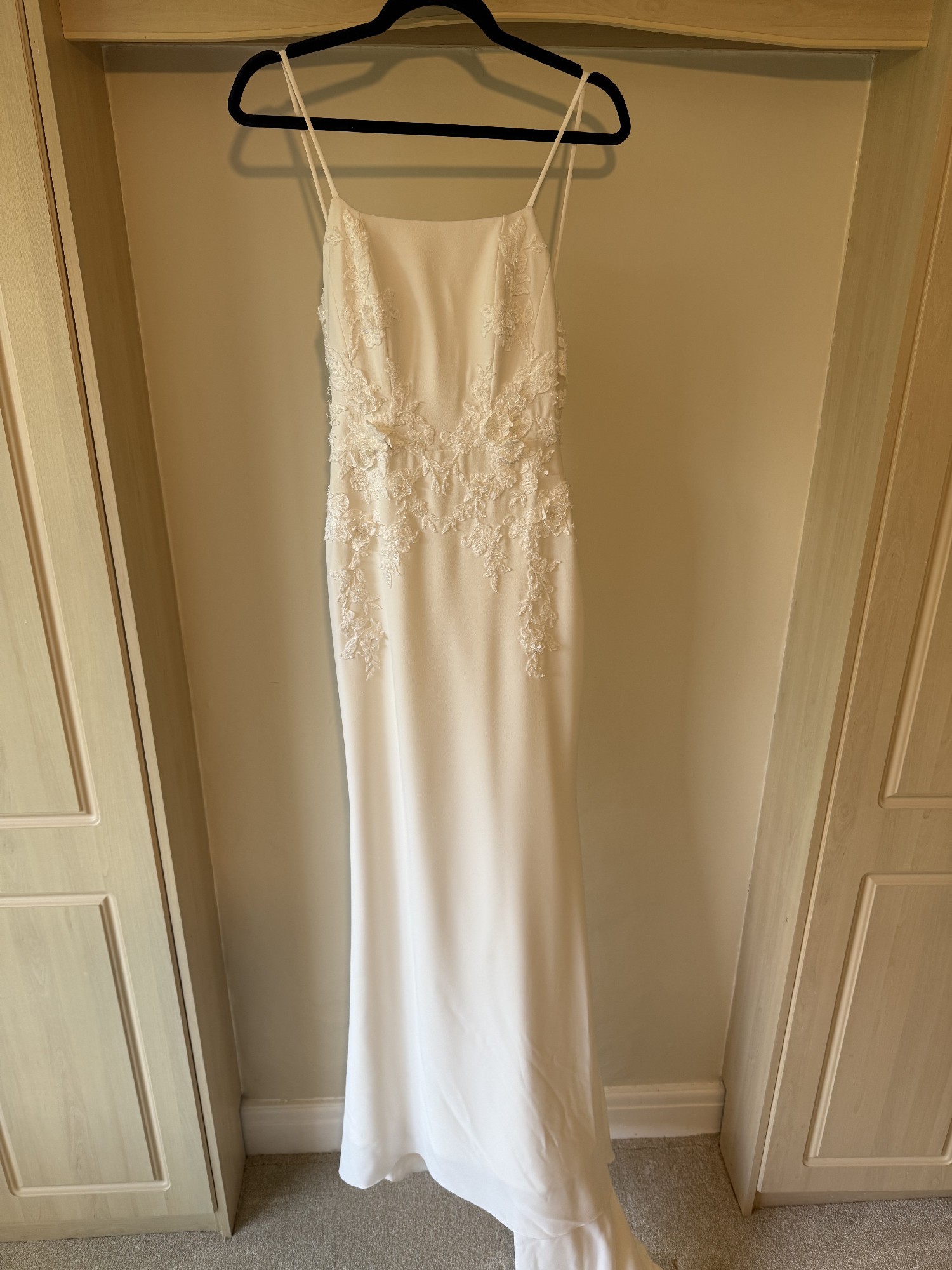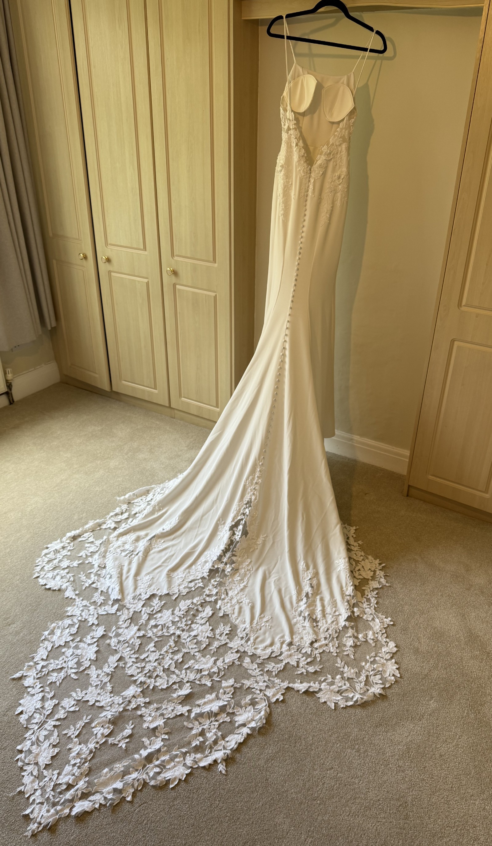 The dress was bought in a size 10, but has been taken in at the waist by a professional seamstress to fit a size 8. Height worn on a 5ft 10 bride, hem can be shortened to suit shorter brides. This is such a beautiful, elegant, yet modern wedding dress. It is comfortable to wear all day and into the evening and feels amazing to wear. It is in great condition and has been professionally dry-cleaned.