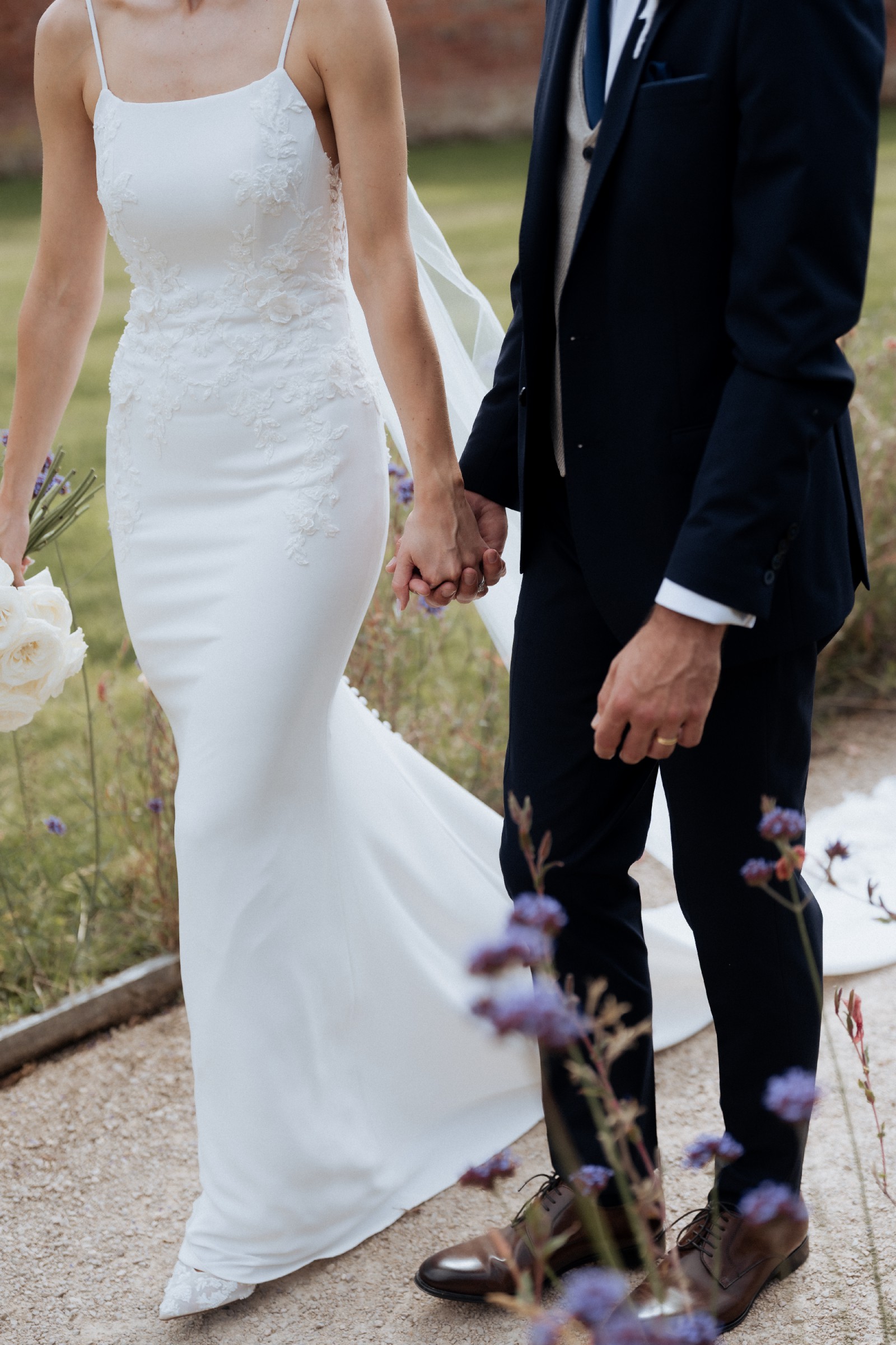 "Effortlessly stunning, SINCLAIR is a crepe sheath gown that falls gracefully into an exquisite beaded, floral embroidered lace and tulle train with a dramatic scalloped hem. Balances a minimalist look with sparkling, 3D beaded floral motifs sprinkled throughout the bodice. Square neckline and delicate spaghetti straps add a clean look, leading into an alluring open back with intricate lace detailing."