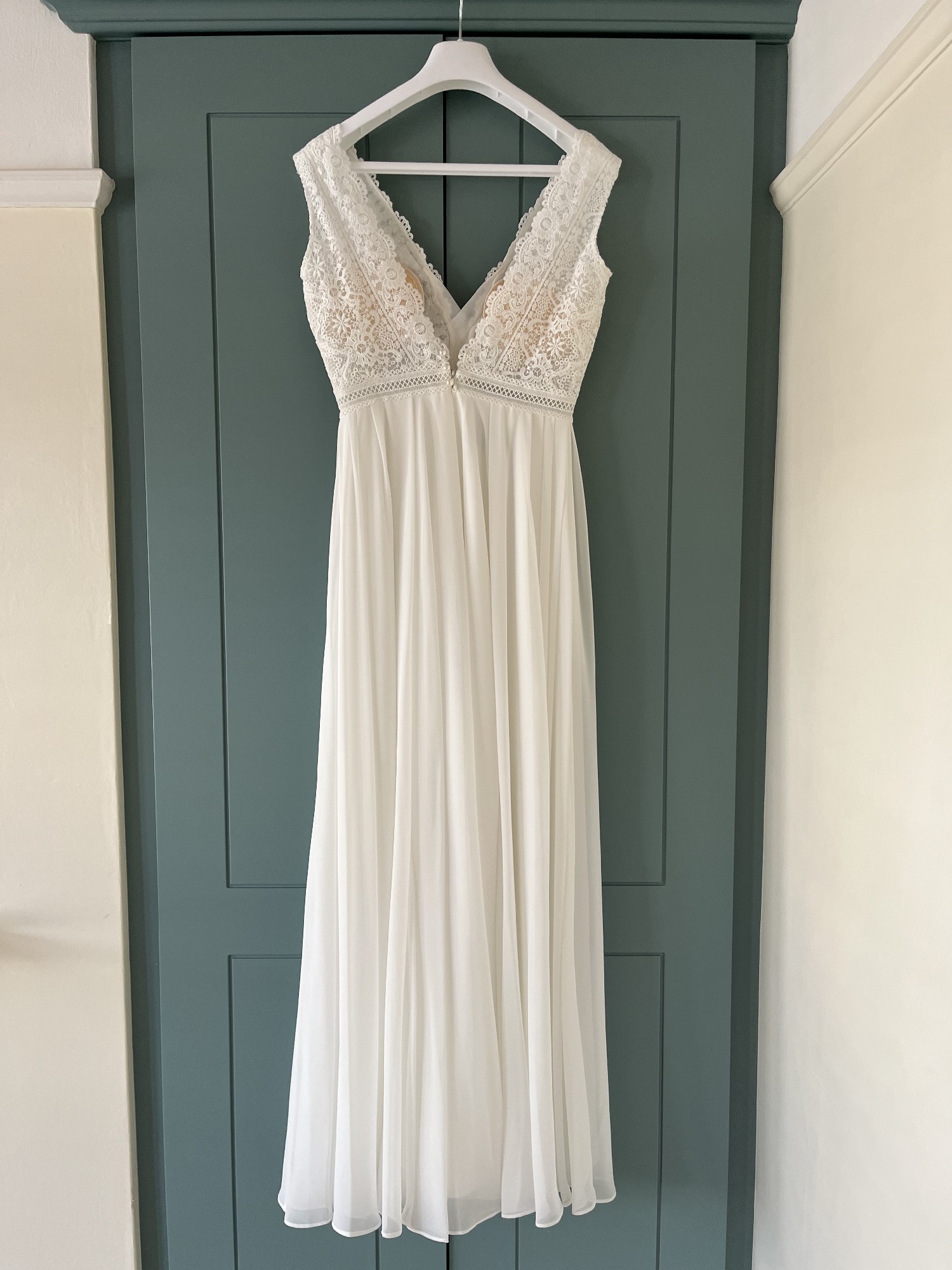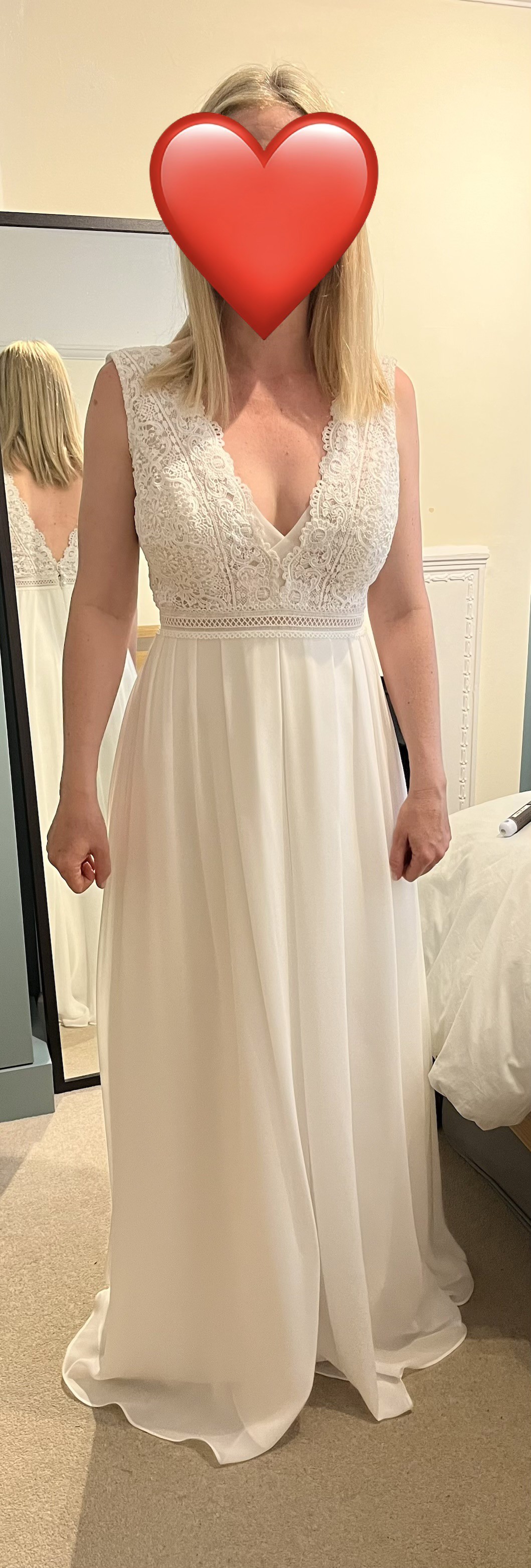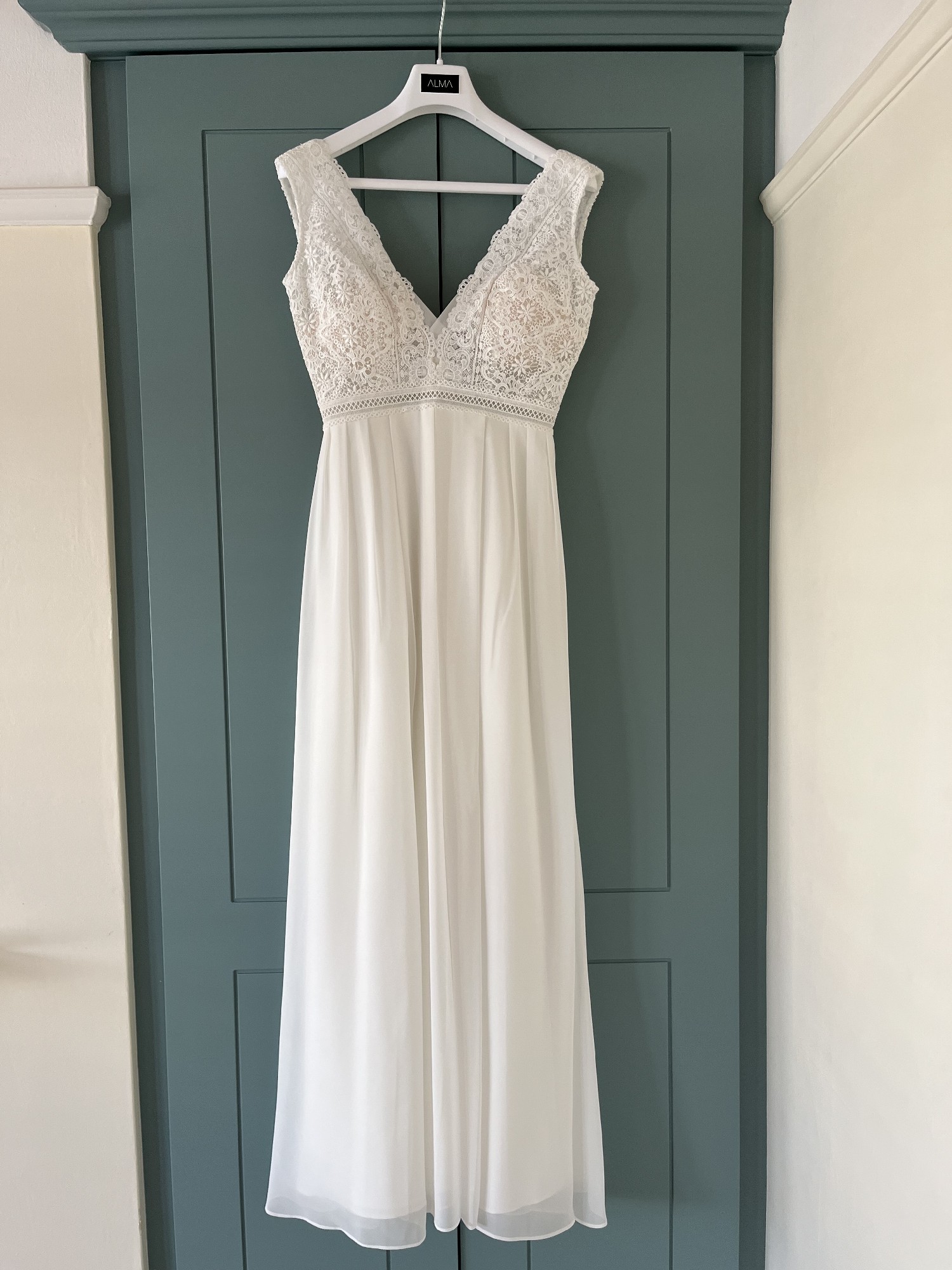 Gorgeous, brand new, unworn Alma Novia wedding dress. Tailored to fit a 5’3” bride in 2” heels. Was unable to wear it on the big day as I (very happily!) fell pregnant, so would love to give another bride the opportunity to shine in such a lovely dress. Comes with original tags and alteration offcuts.