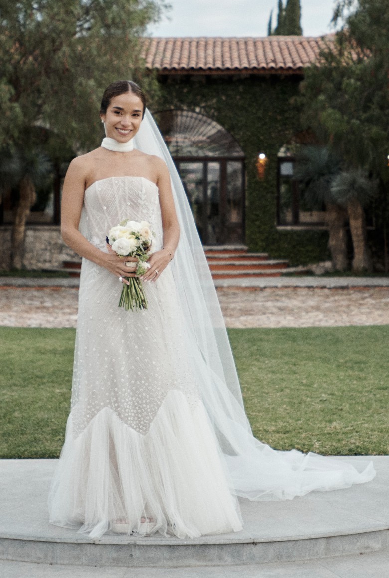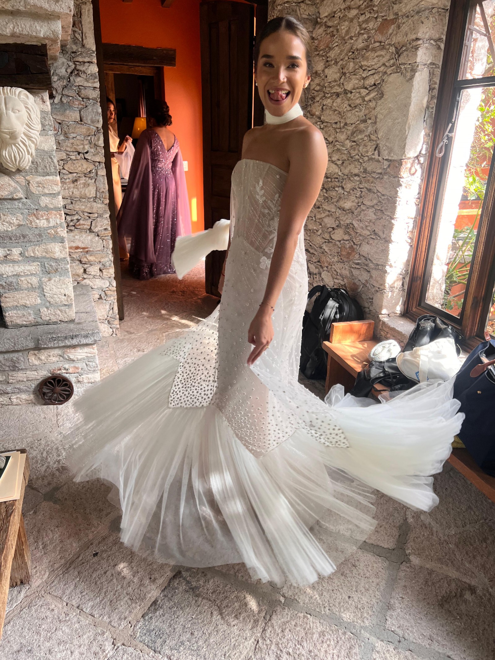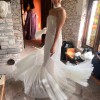 *Includes the veil/choker*. This Jasmine wedding dress from Liz Martinez is a breathtaking masterpiece that turned my special day into a fairytale. The fit and flare silhouette hugs every curve beautifully, creating a stunning hourglass shape that made me feel both elegant and confident as I walked down the aisle. The straight neckline adds a modern touch while showcasing the intricate details of the dress.