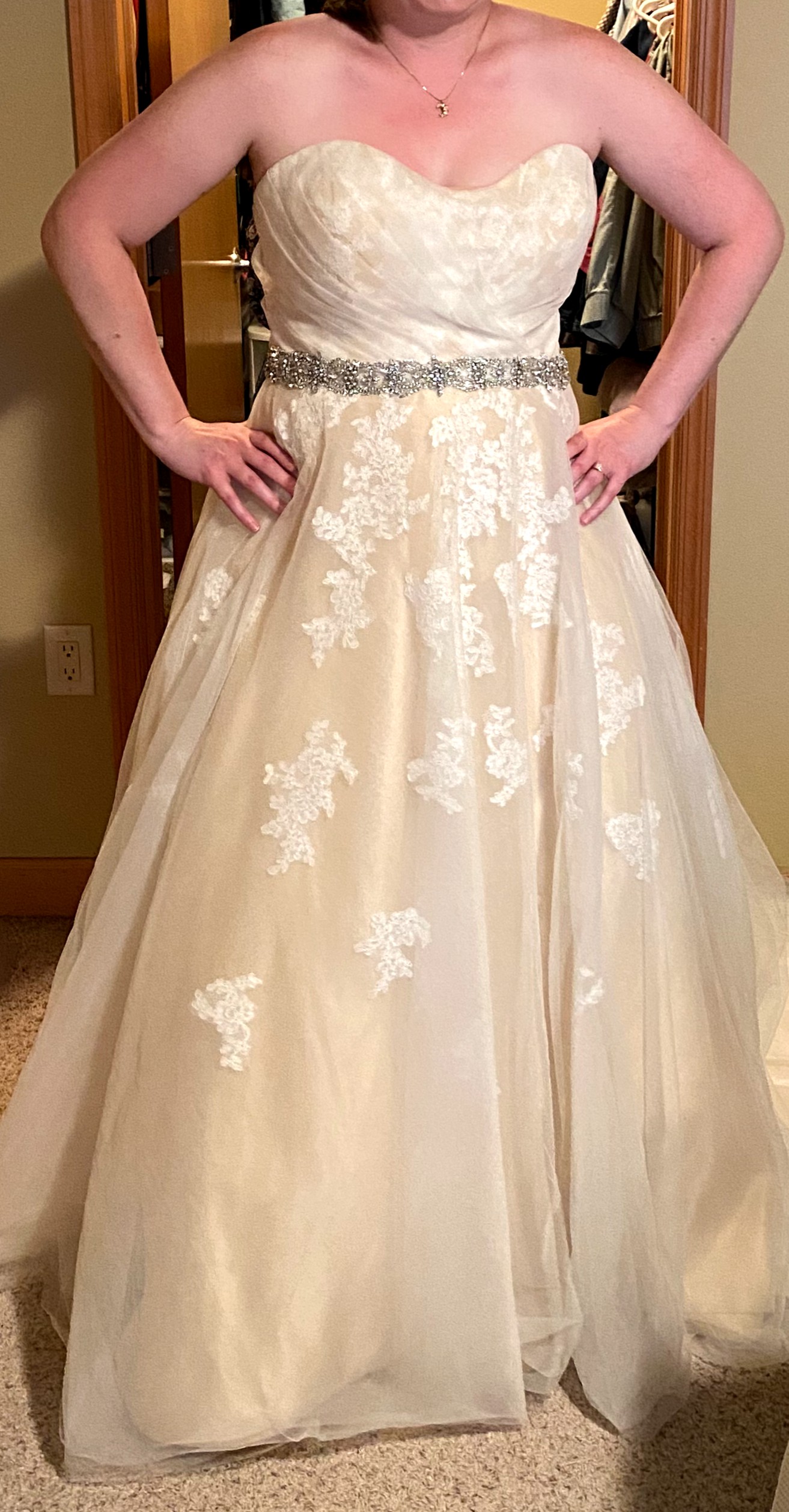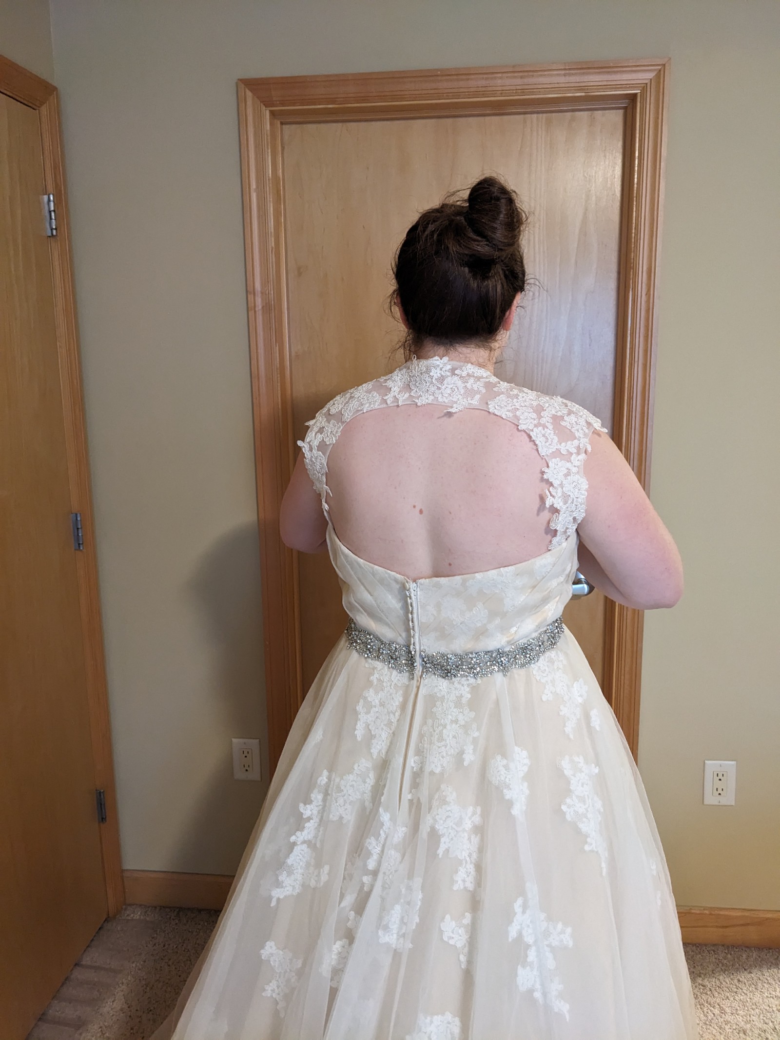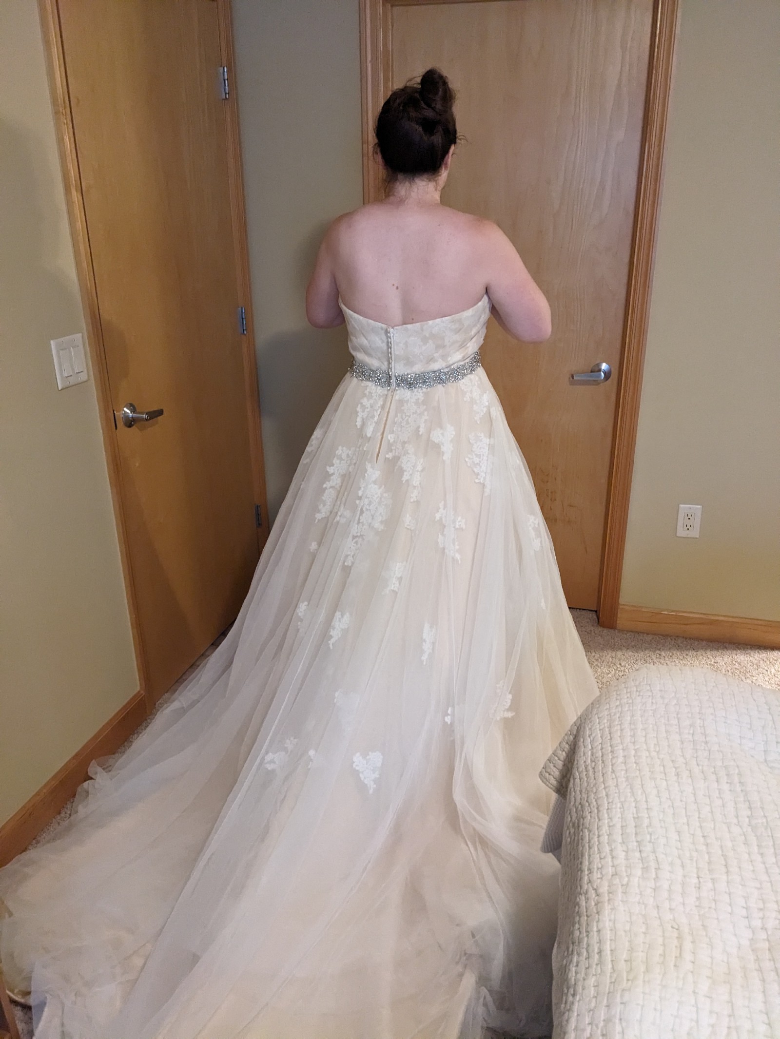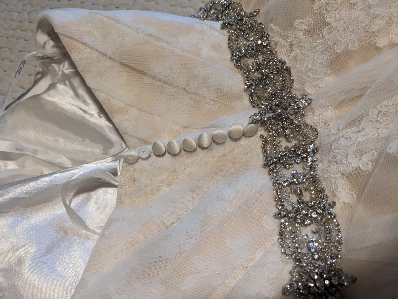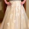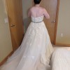 This is a gorgeous champagne ball gown with a delicate ivory lace overlay. It has a dramatic train, detachable lace straps, and an attached sparkly belt. It was purchased as a sample dress and has never been worn for an event. It still has its original tags and has never been altered. It is in very good condition, but note that it is missing one button in the back (not very noticeable and an easy fix - see close up photo of back of dress). It's a glamorous, vintage vibe that I loved but ultimately didn't match the venue we chose.