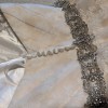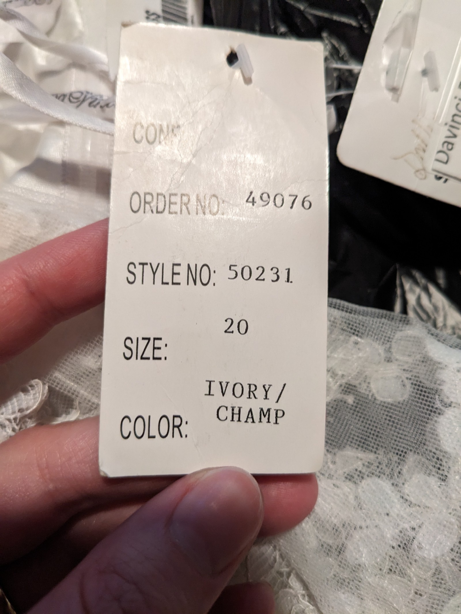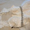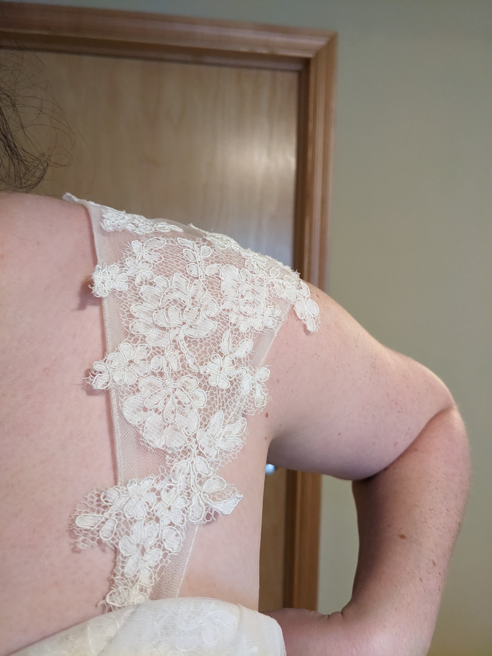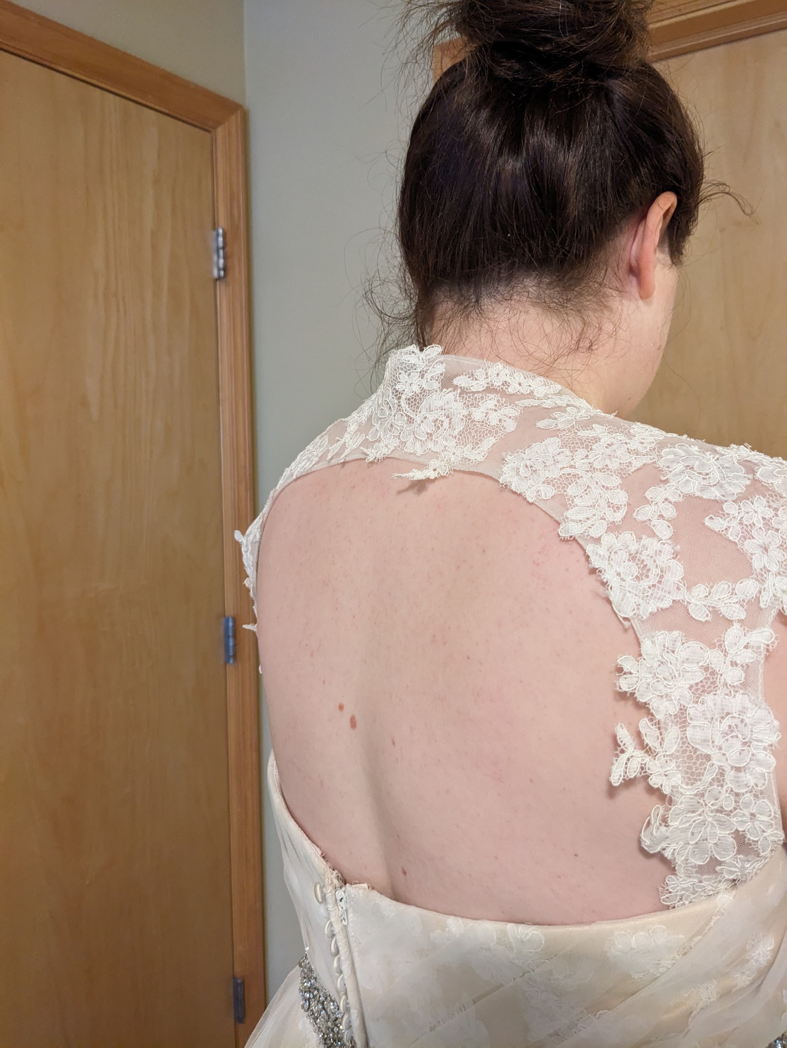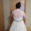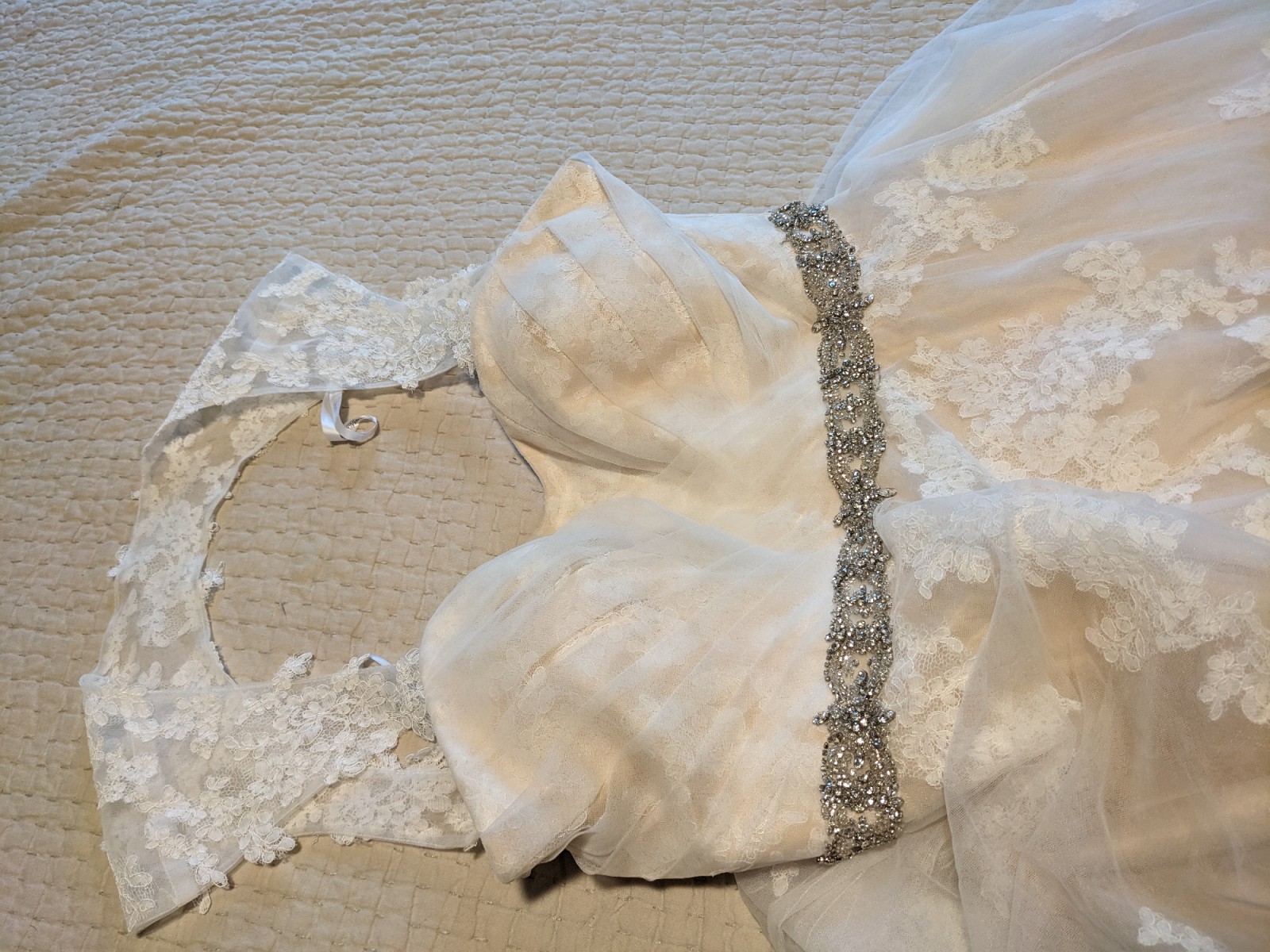 This is a gorgeous champagne ball gown with a delicate ivory lace overlay. It has a dramatic train, detachable lace straps, and an attached sparkly belt. It was purchased as a sample dress and has never been worn for an event. It still has its original tags and has never been altered. It is in very good condition, but note that it is missing one button in the back (not very noticeable and an easy fix - see close up photo of back of dress). It's a glamorous, vintage vibe that I loved but ultimately didn't match the venue we chose.