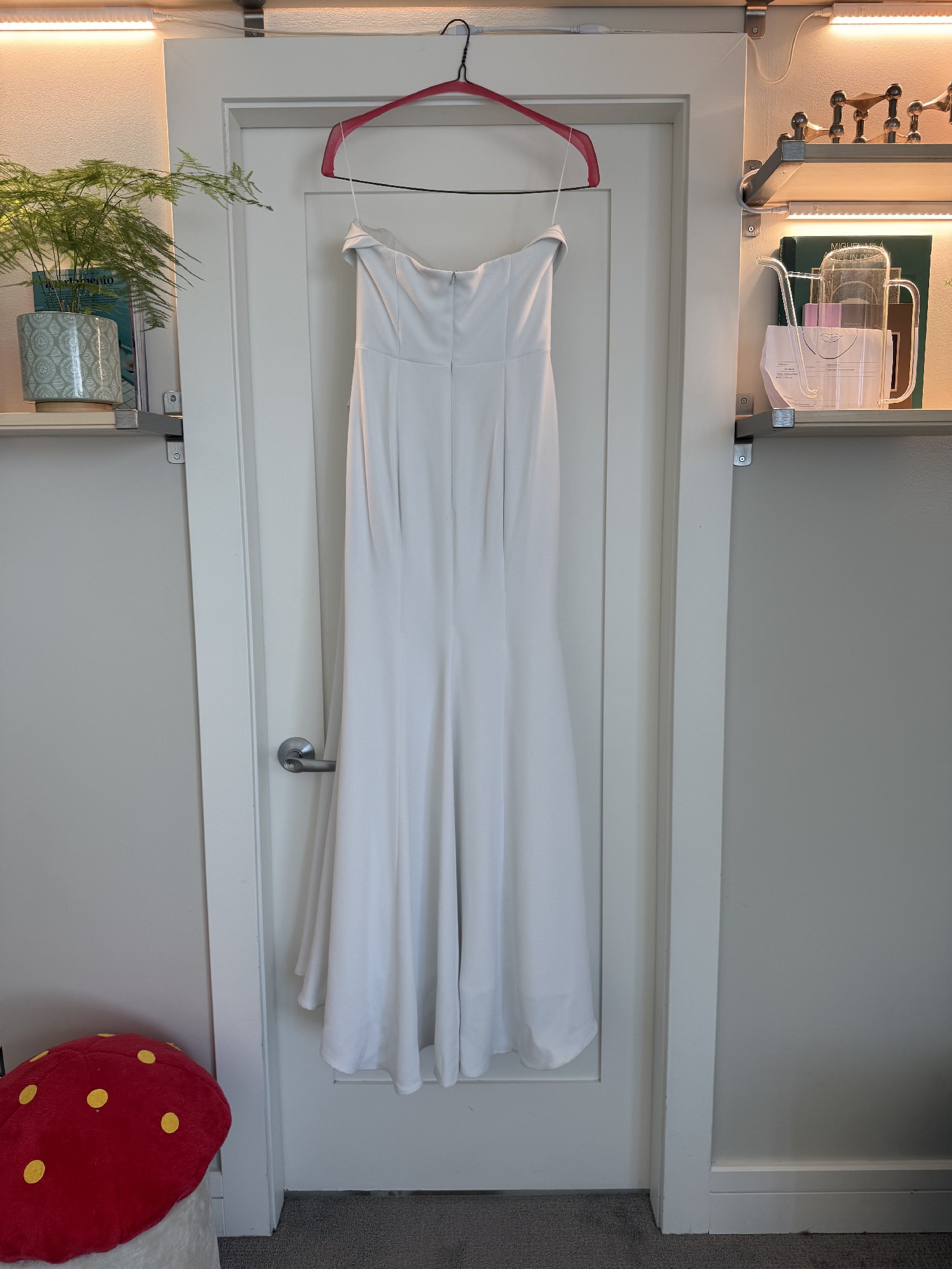 Embrace minimalist luxury with Alexa, a perfect balance of structure and elegance. The plunging sweetheart neckline, accentuated by a hand-draped bias band, gracefully frames the bust, while the fully boned bodice shapes through the waist and flows into a sleek, fitted silhouette with a dramatic, flowing train. Crafted in our signature stretch crepe, Alexa is an ode to sleek, sophisticated glamour.
