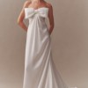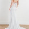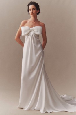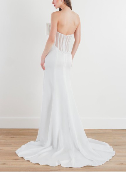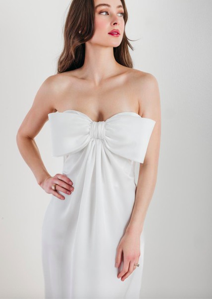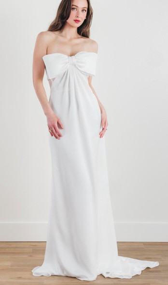 The Melisande Gown features a strapless bodice with a large bow at the front and a fitted skirt. The gown has a sheer, corset-style back. This gown is made in a smooth, luxurious fabric and is perfect for a bride who wants a simple yet elegant look.