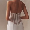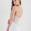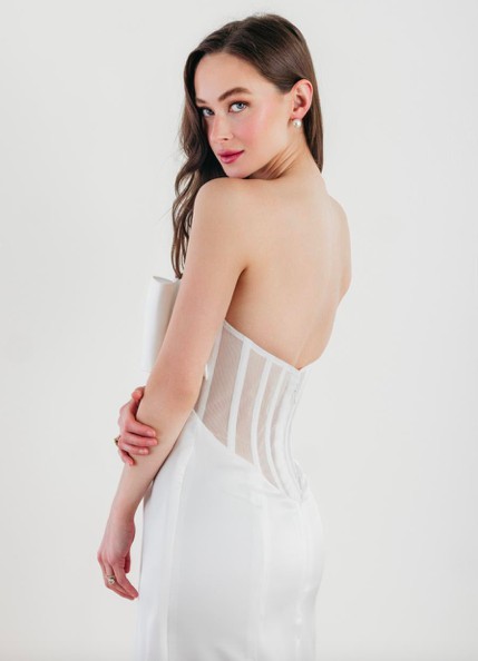 Melisande is a sheath gown of Che Charmeuse fabric, featuring corset construction and a bow sweetheart neckline.
